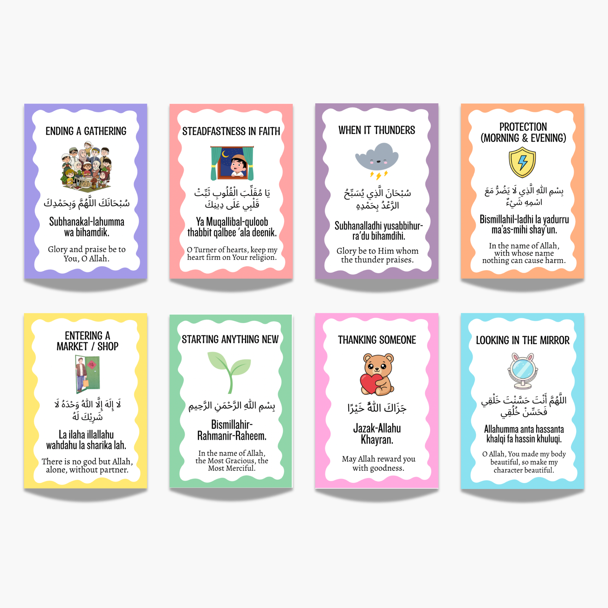 Make learning duas simple, fun, and part of your child’s daily routine! This printable set includes 40 beautifully illustrated Islamic dua cards with Arabic text, transliteration, and English translation, designed especially for kids. Perfect for homeschooling, bedtime routines, classrooms, or Ramadan activities.