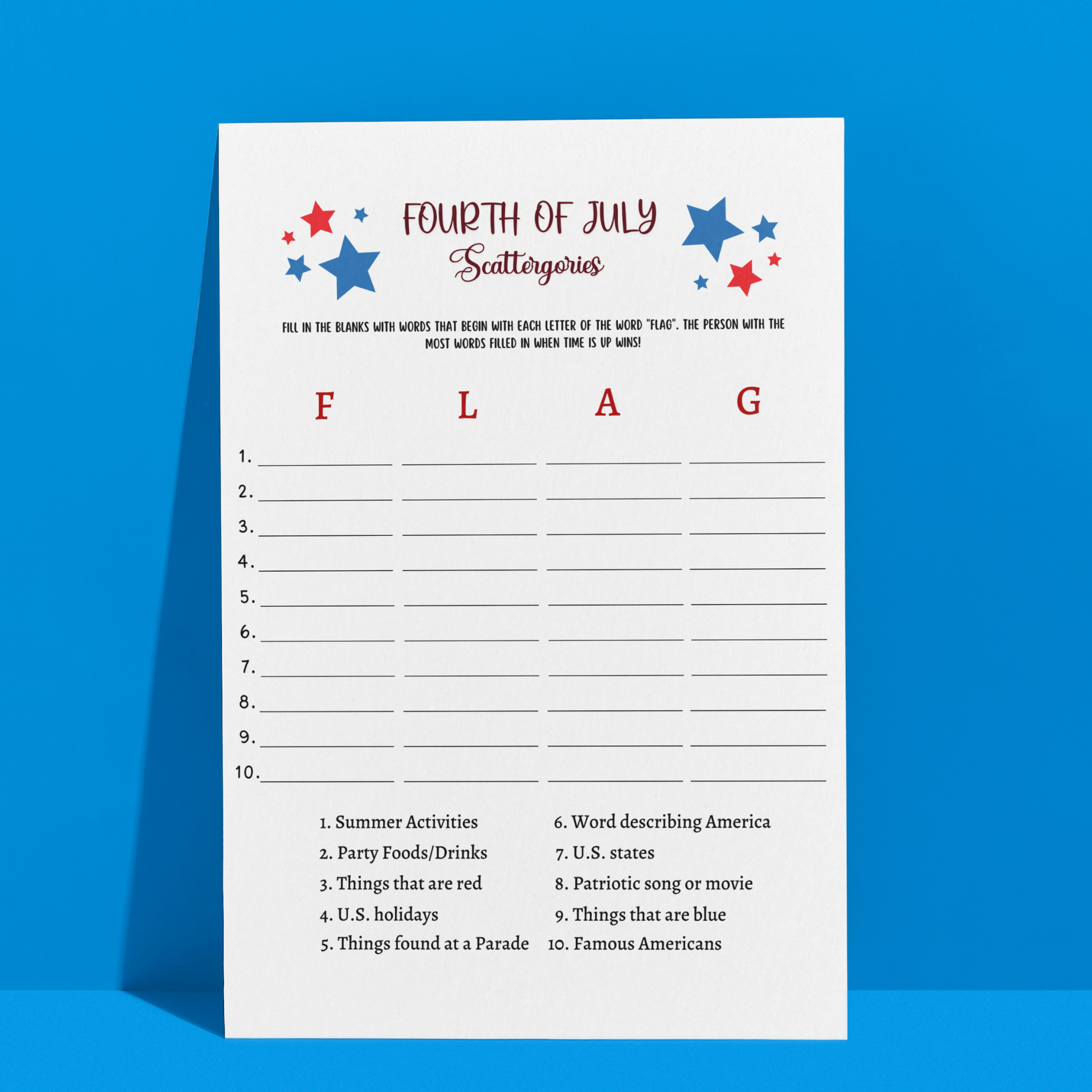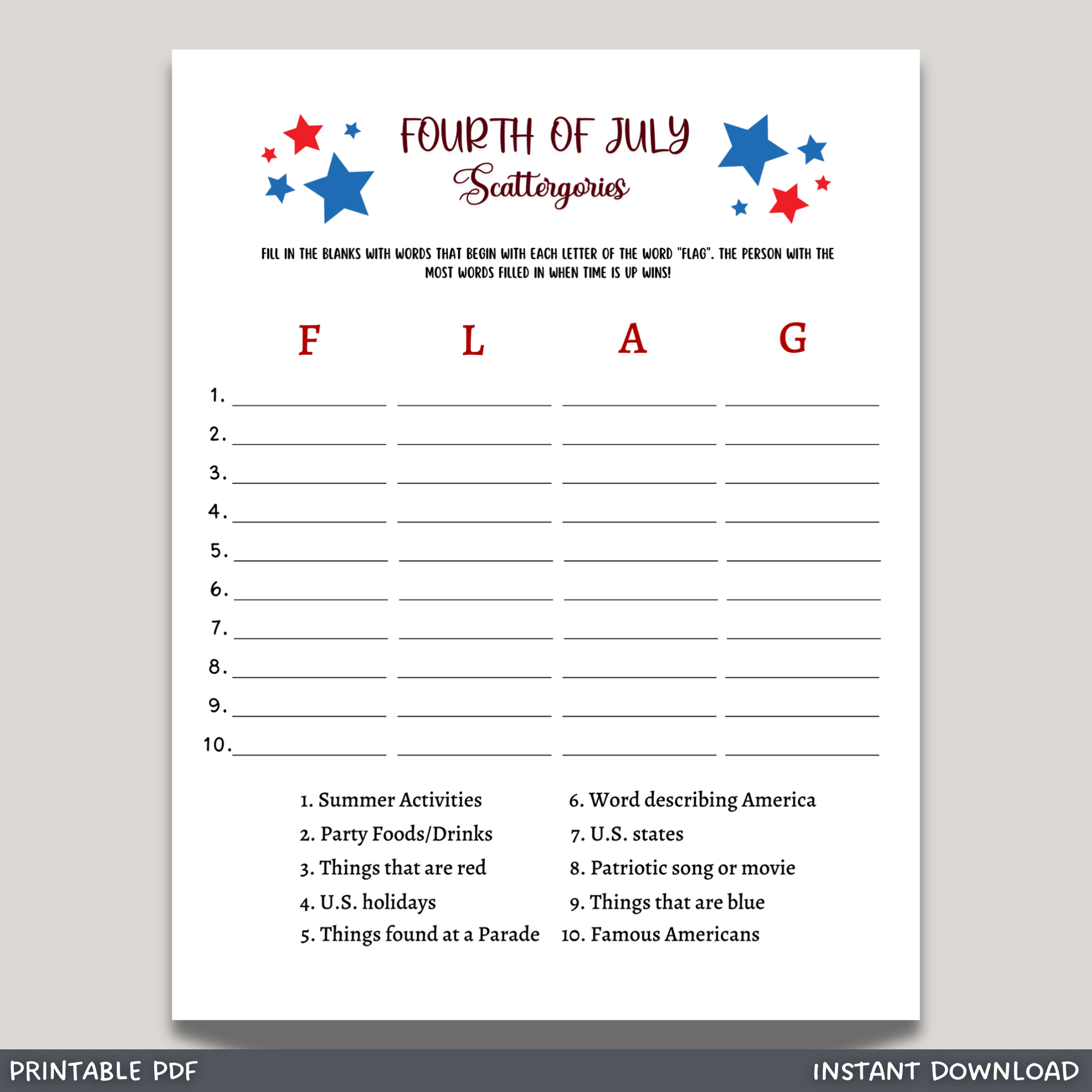 🇺🇸 This 4th of July Scattergories game is a printable PDF and an instant digital download! It is perfect for your party or event and great to play with your friends and family! It is sure to impress everyone and works great for adults and kids! Just download, print, & play! 🇺🇸