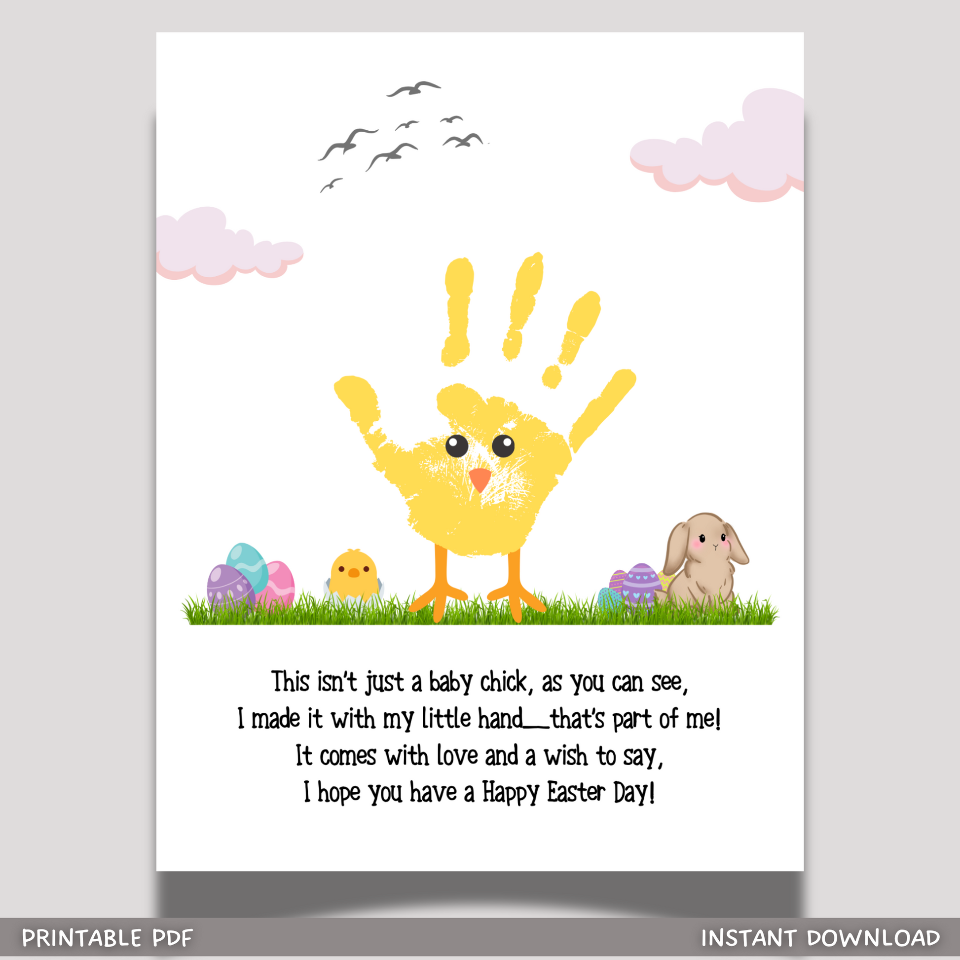 Handprint art craft, footprint art craft, spring craft template, printable keepsake, happy Easter poem, DIY kids art, toddler daycare project, preschool activities, Easter gifts from kids, homeschool spring activity, baby chick craft, cute greeting card, personalized gift from child, poem craft for Easter