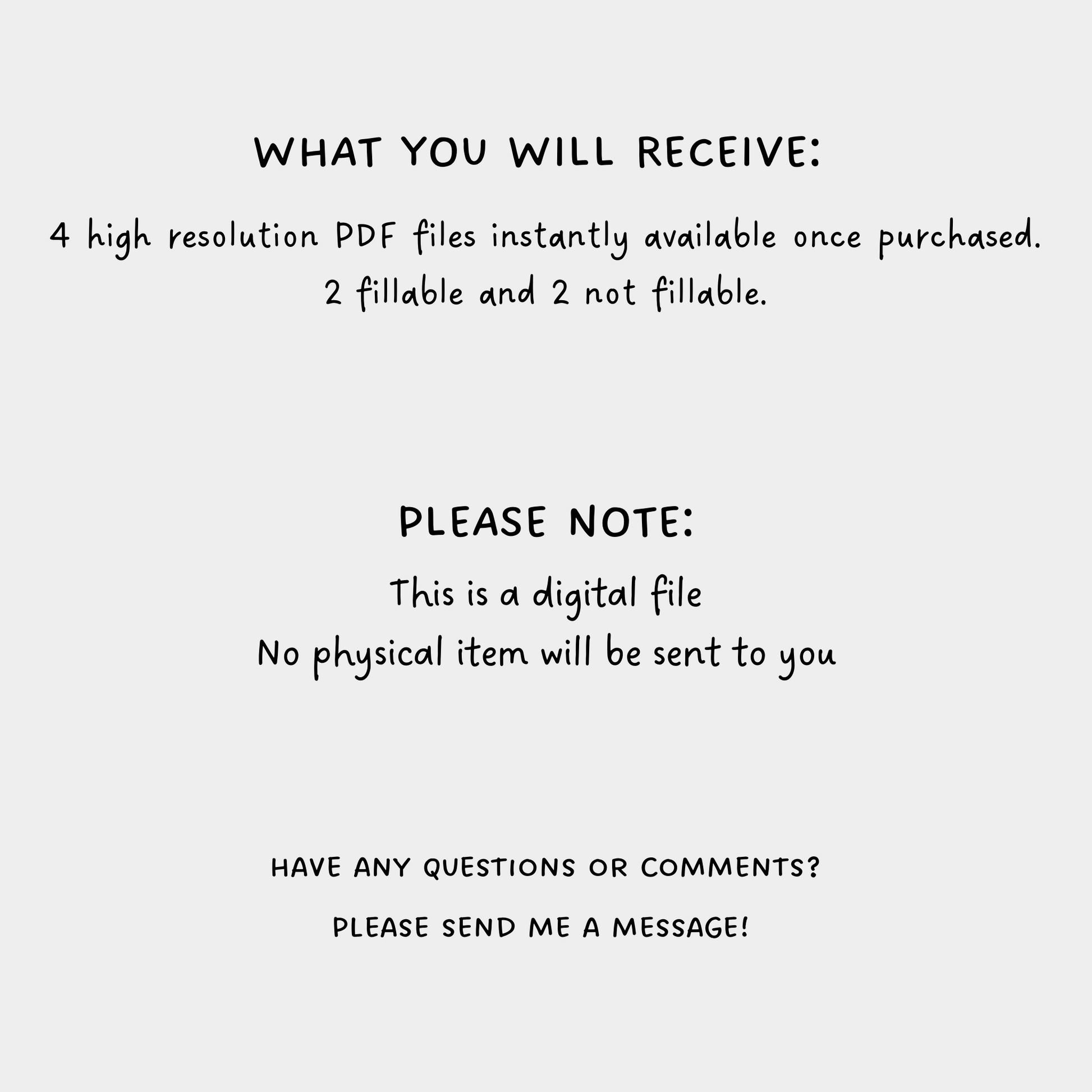 NOTE: The font type, size, font color, and placement will not be editable for the fillable files. Only one font is available.