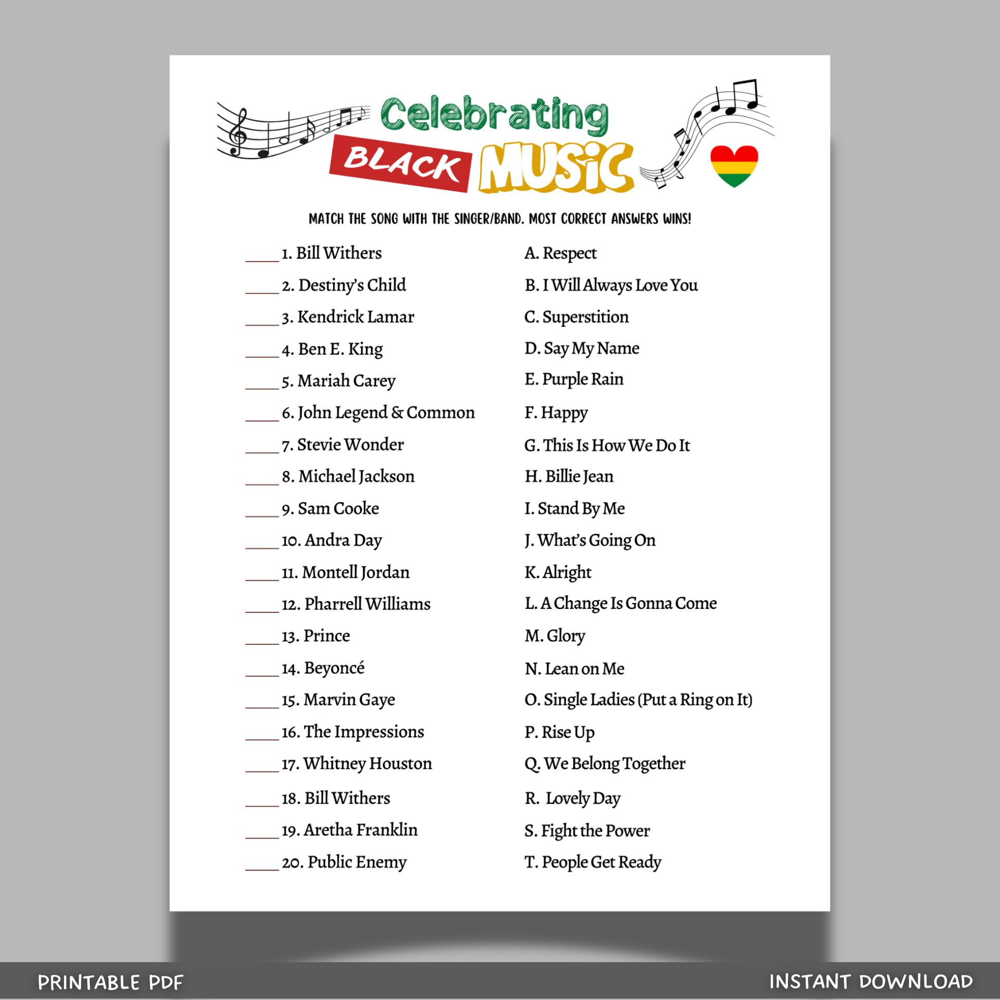 Black History Month Music Trivia Game | Fun Printable Historical Celebration Icebreaker Fun Activity for Kids, Adults, & Seniors 🖤