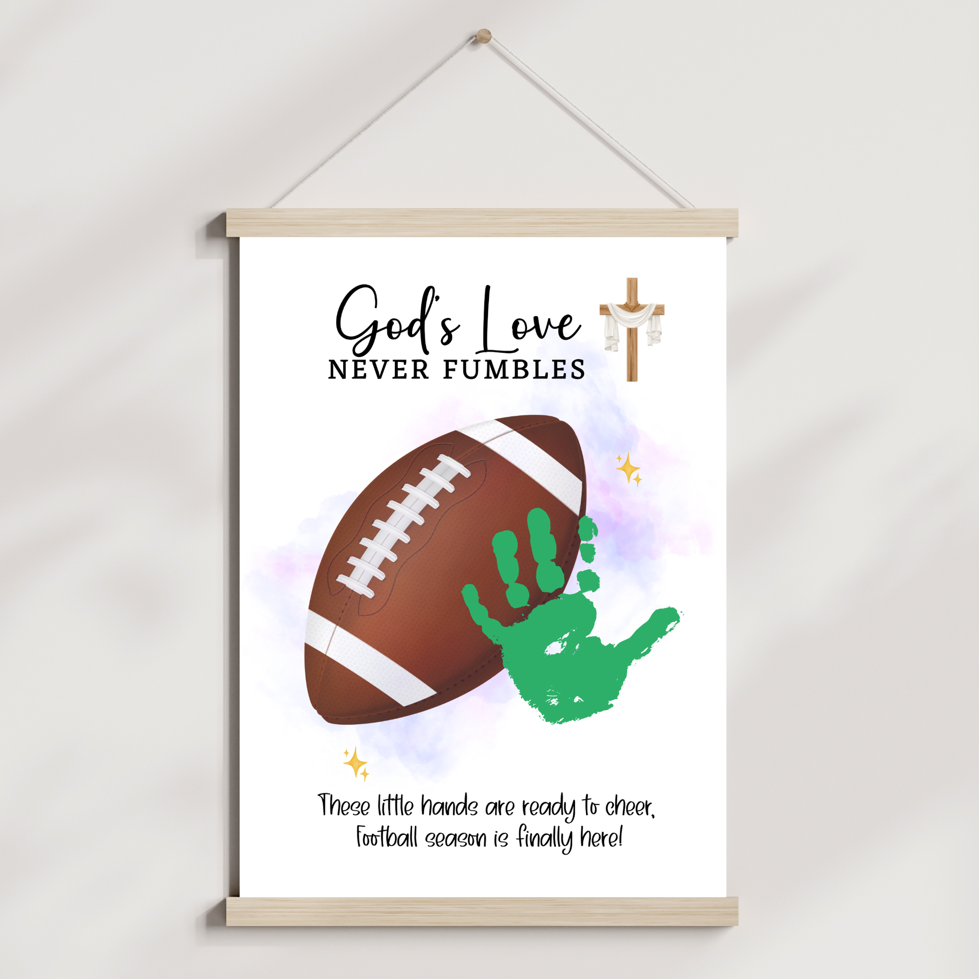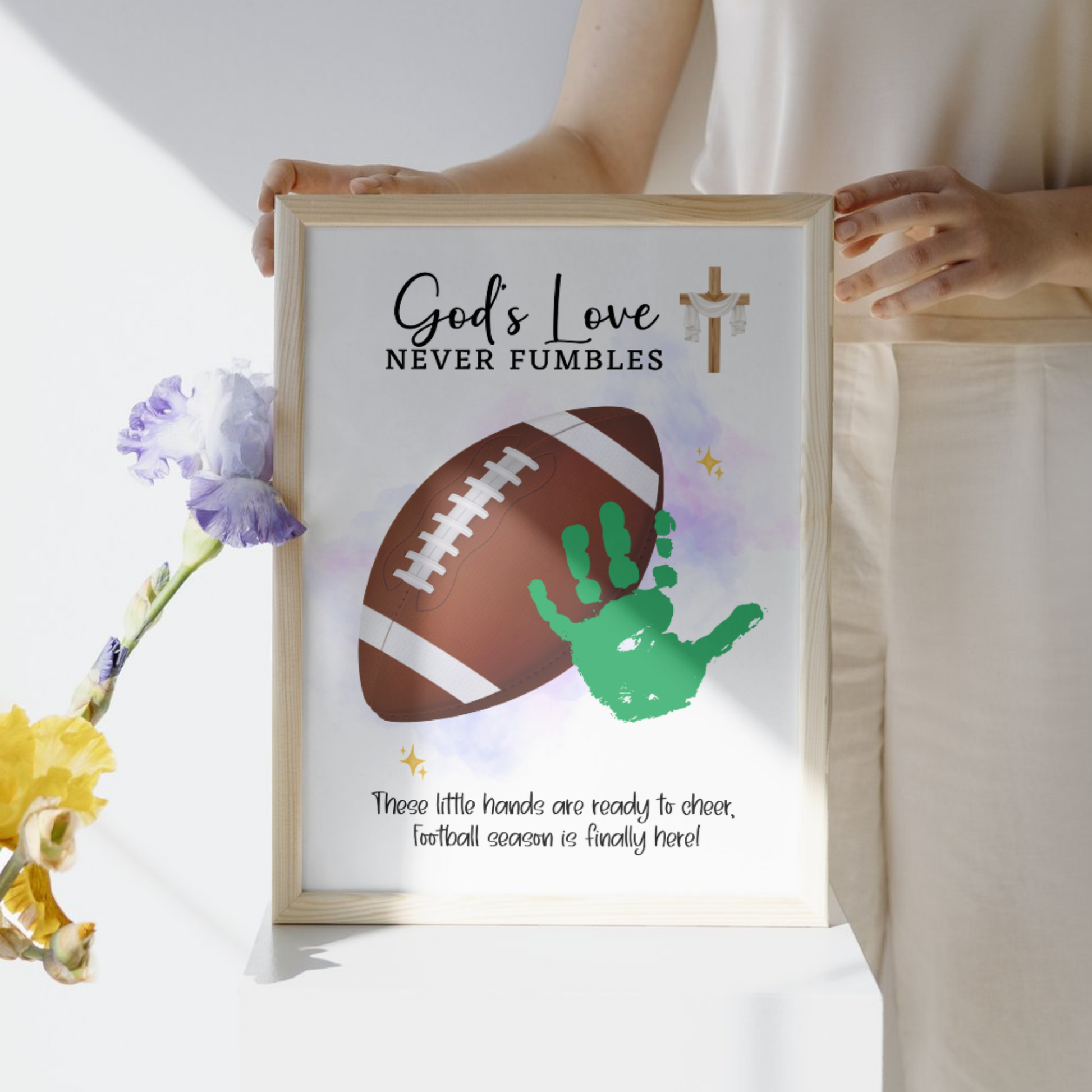 Celebrate faith and football season with this Christian Football Handprint Craft Printable, featuring the phrase “God’s Love Never Fumbles”. This sweet DIY activity turns little handprints into meaningful faith-based sports wall art. 🏈