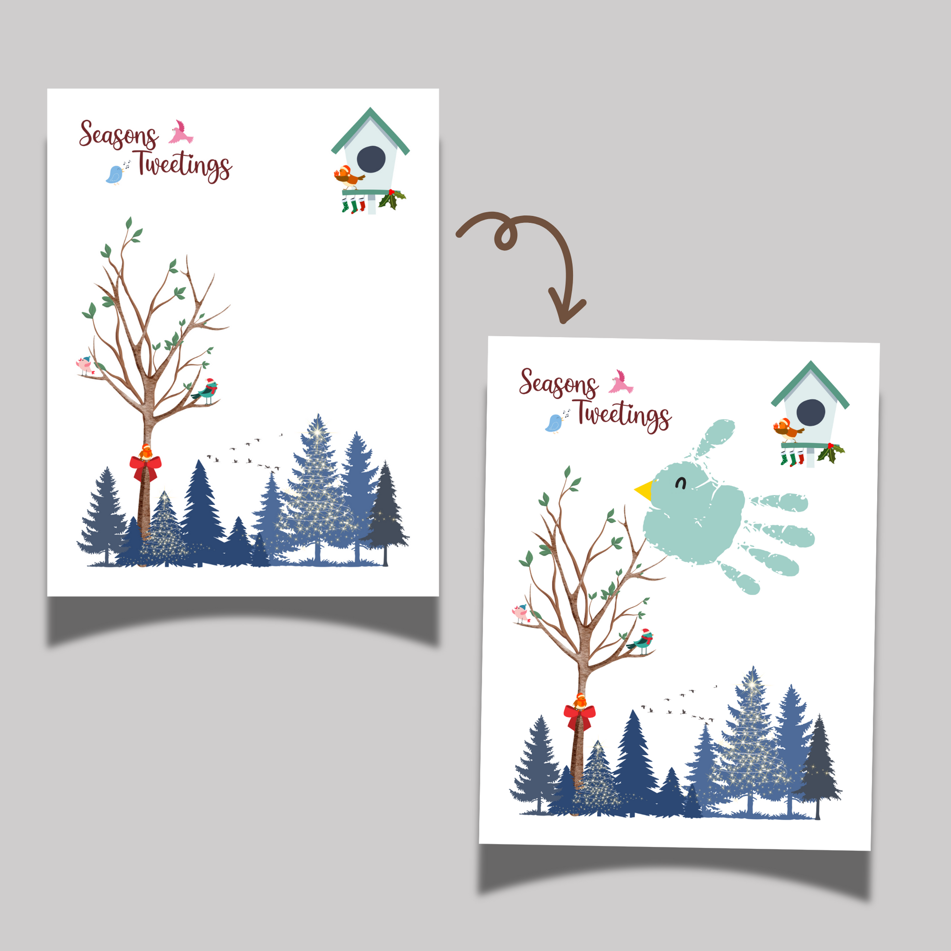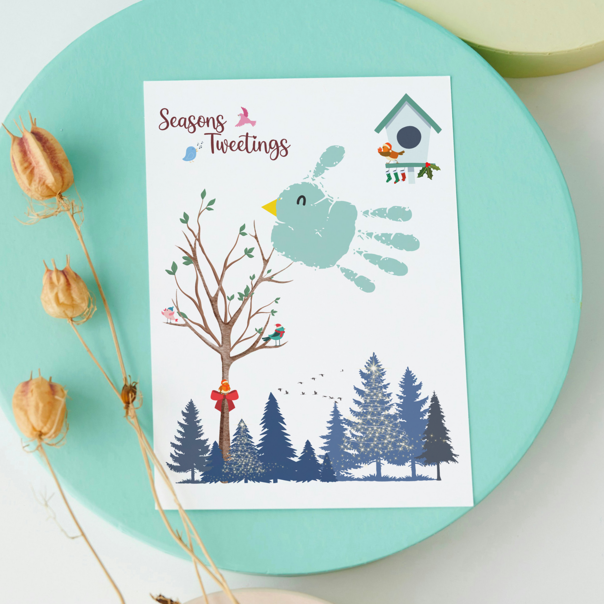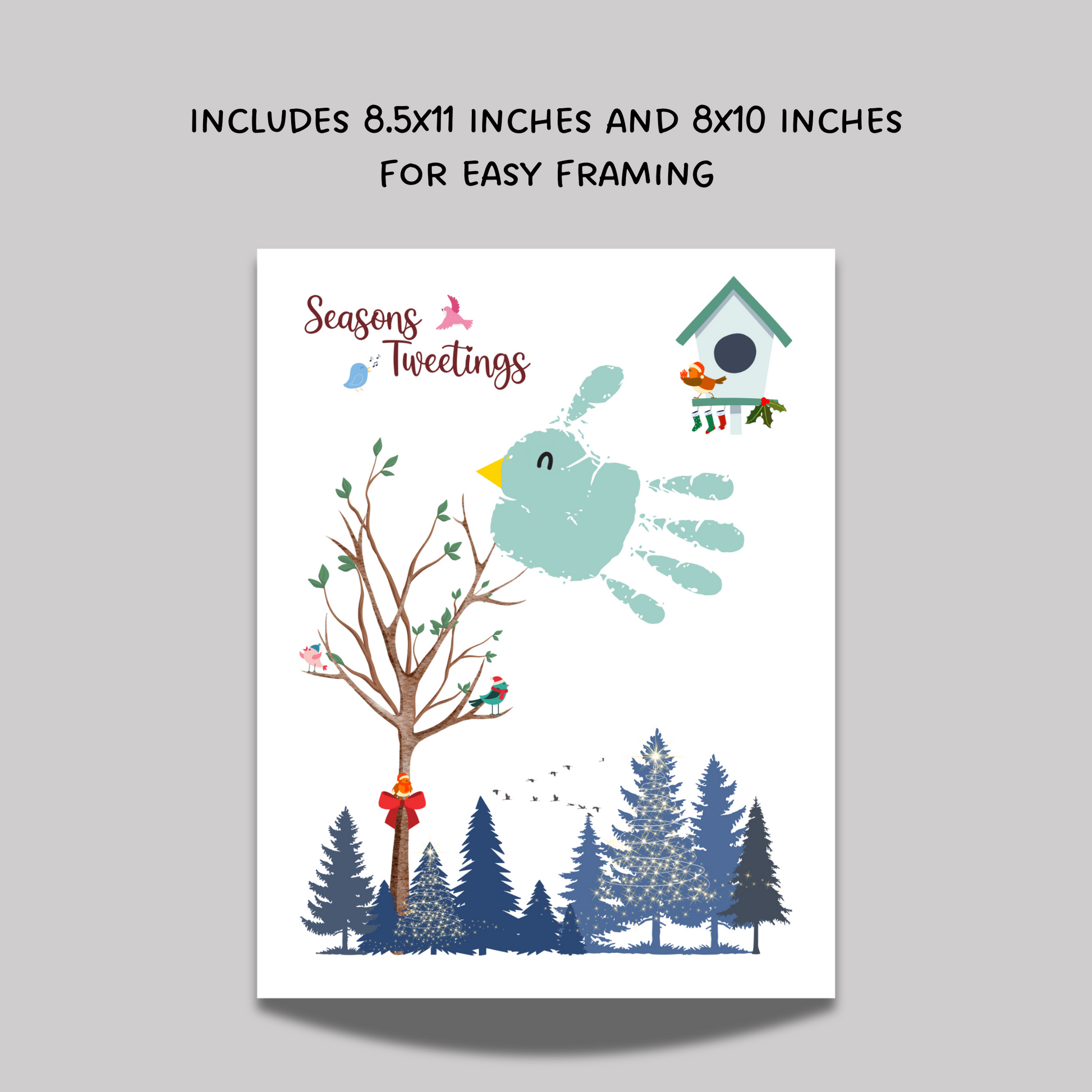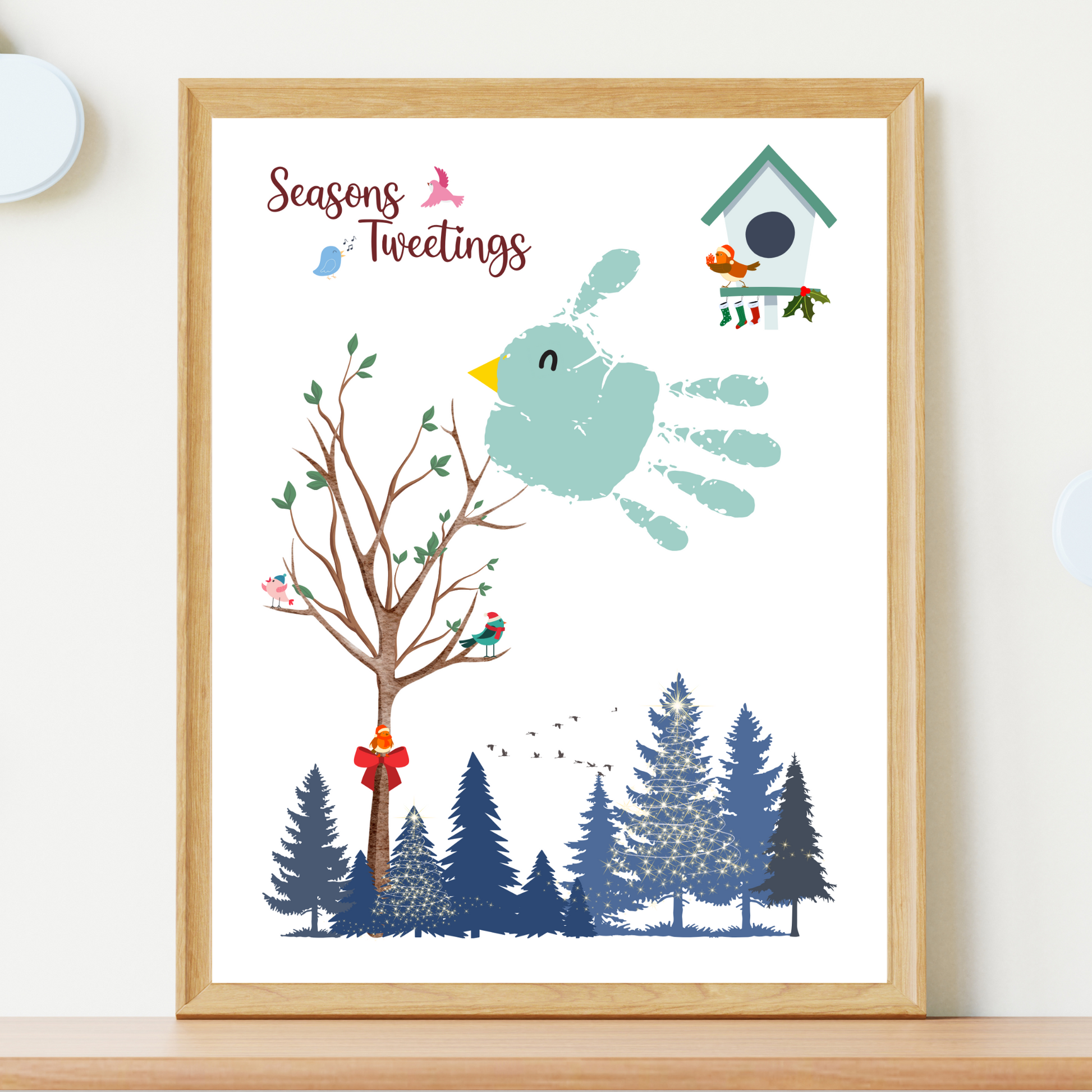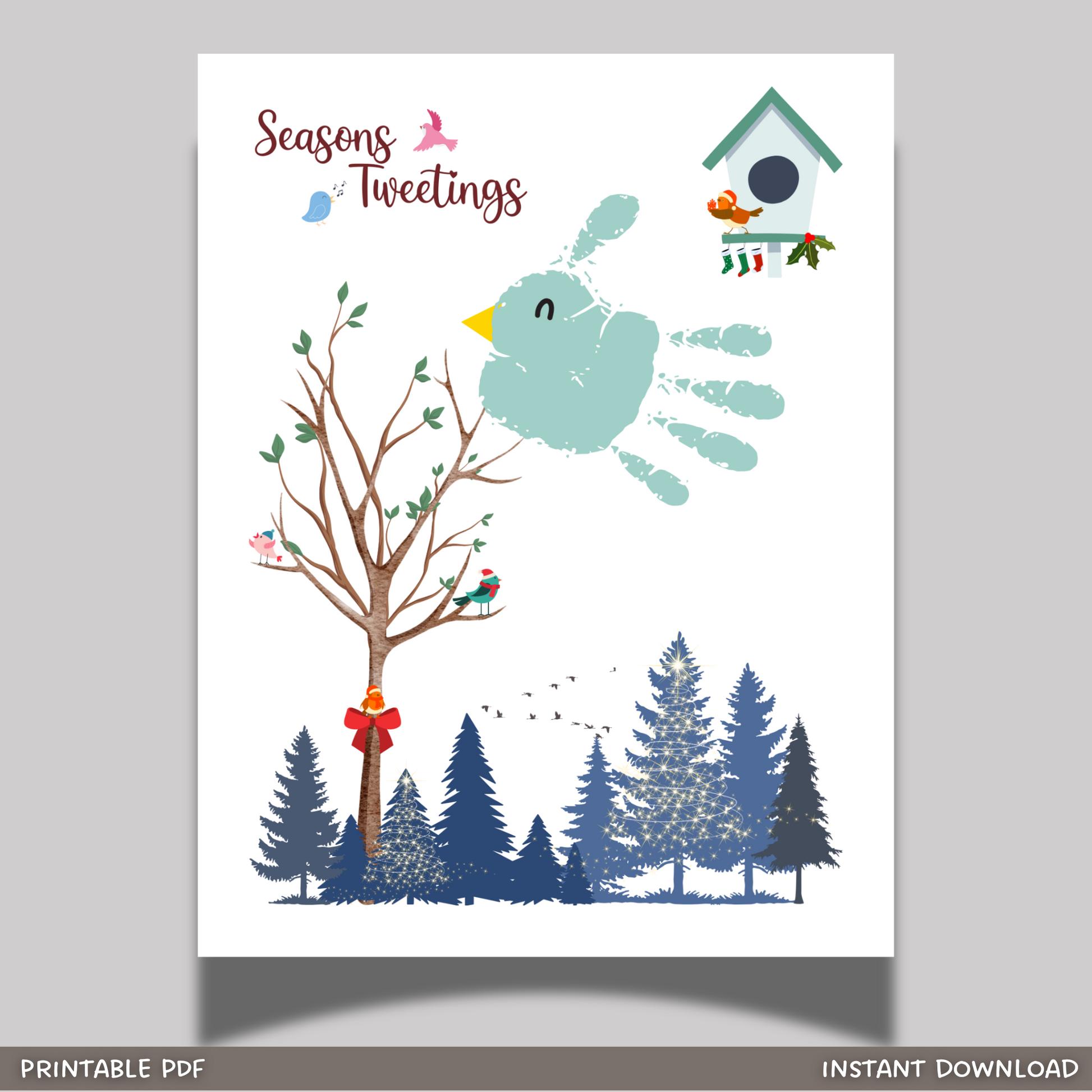 Create special holiday memories with this personalized 'Seasons Tweetings' Christmas handprint art & crafts printable, perfect for babies, toddlers, children and kids! This fun and easy DIY project lets you capture those tiny handprints, fingerprints, or footprints to cherish for years to come. It’s a heartwarming keepsake that’s perfect for family traditions and ideal for offering as a gift to family members like mom, dad, grandma, grandpa, nana, papa, auntie, or uncle. 🎄👣