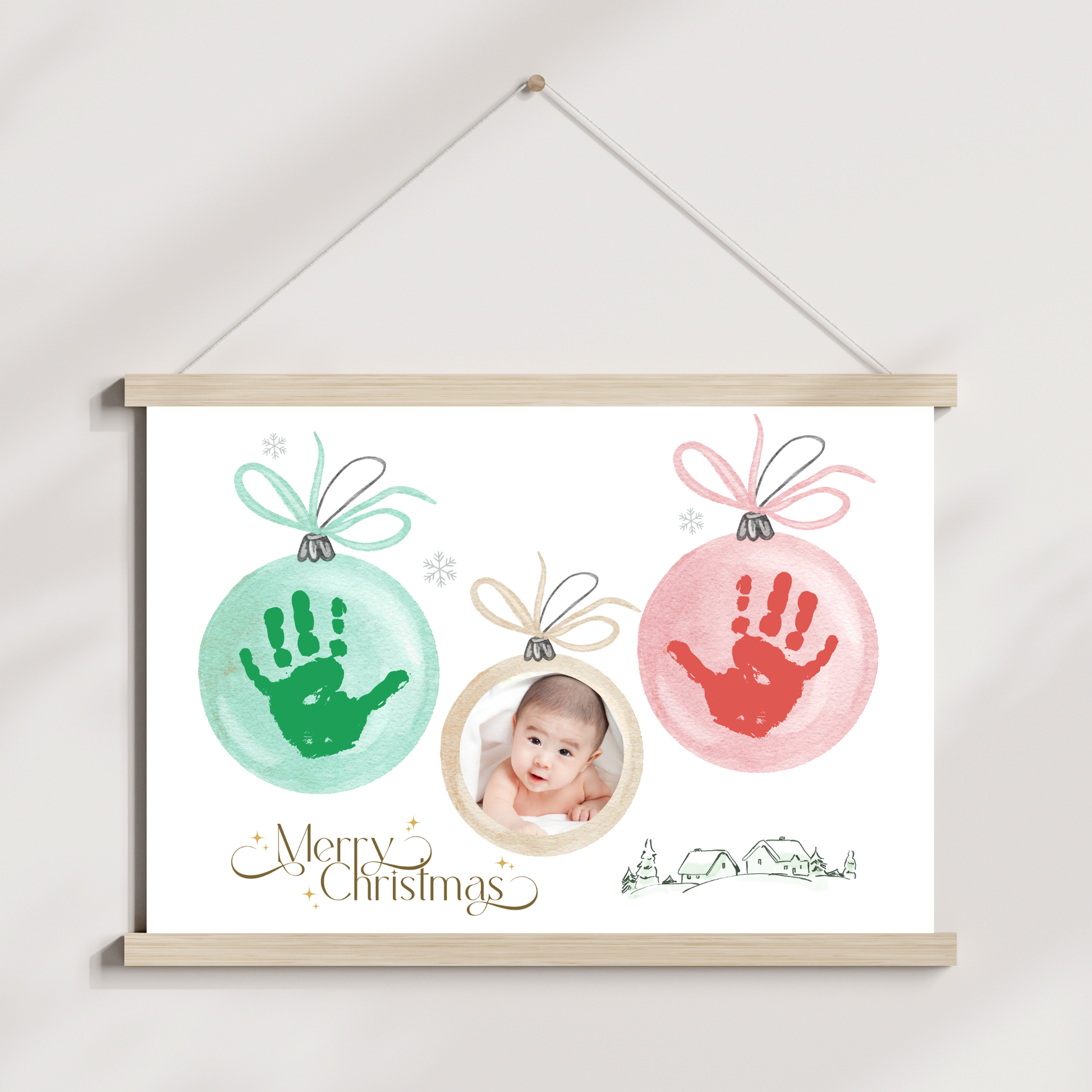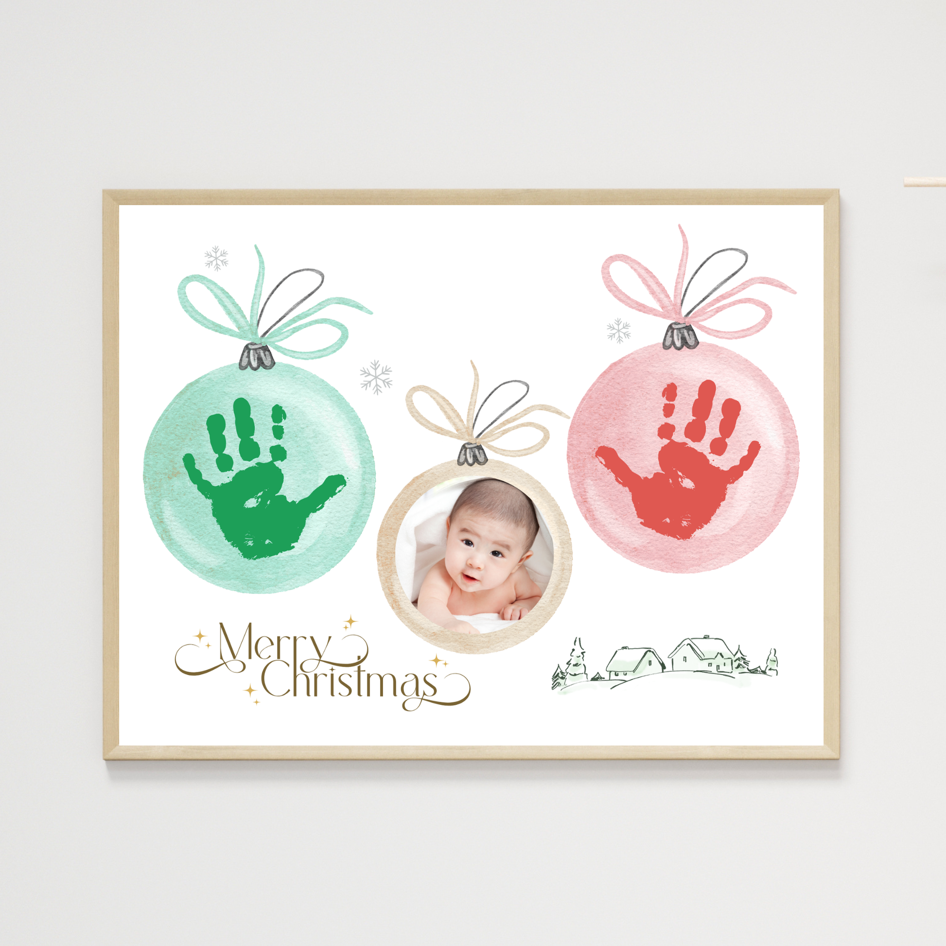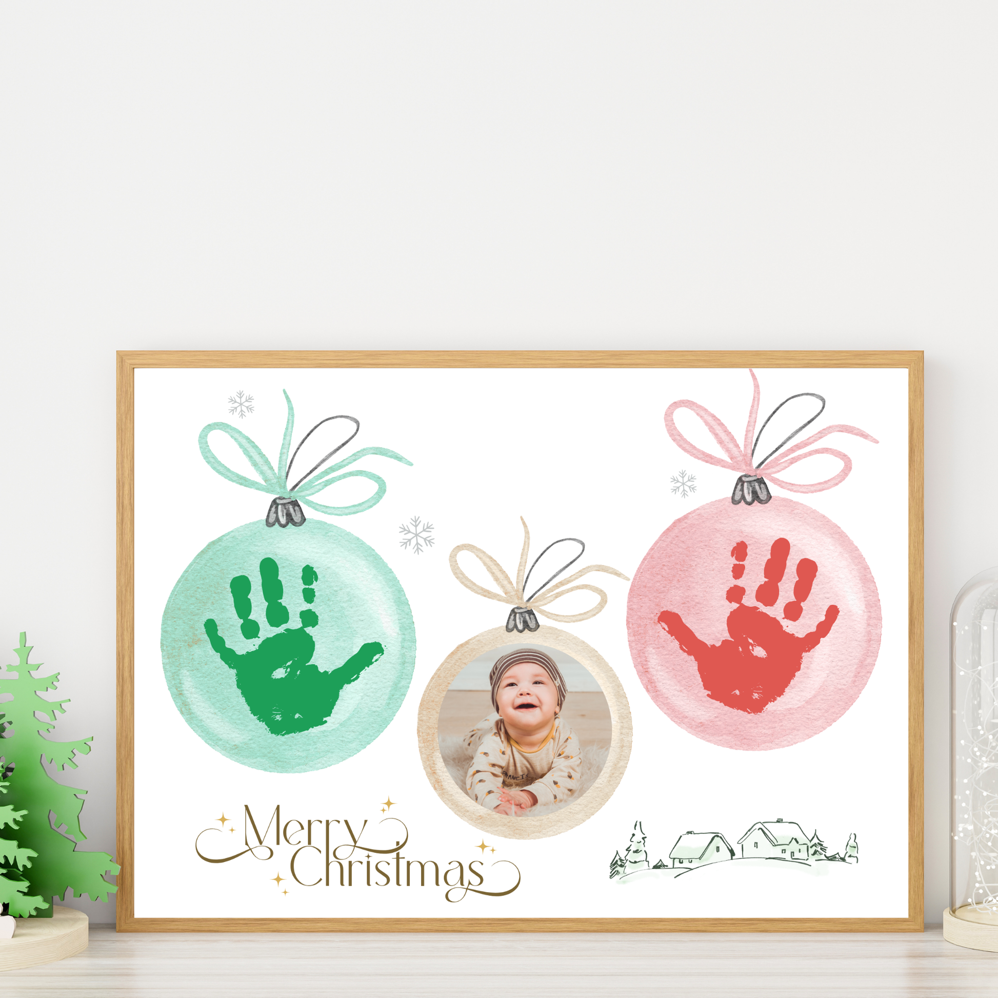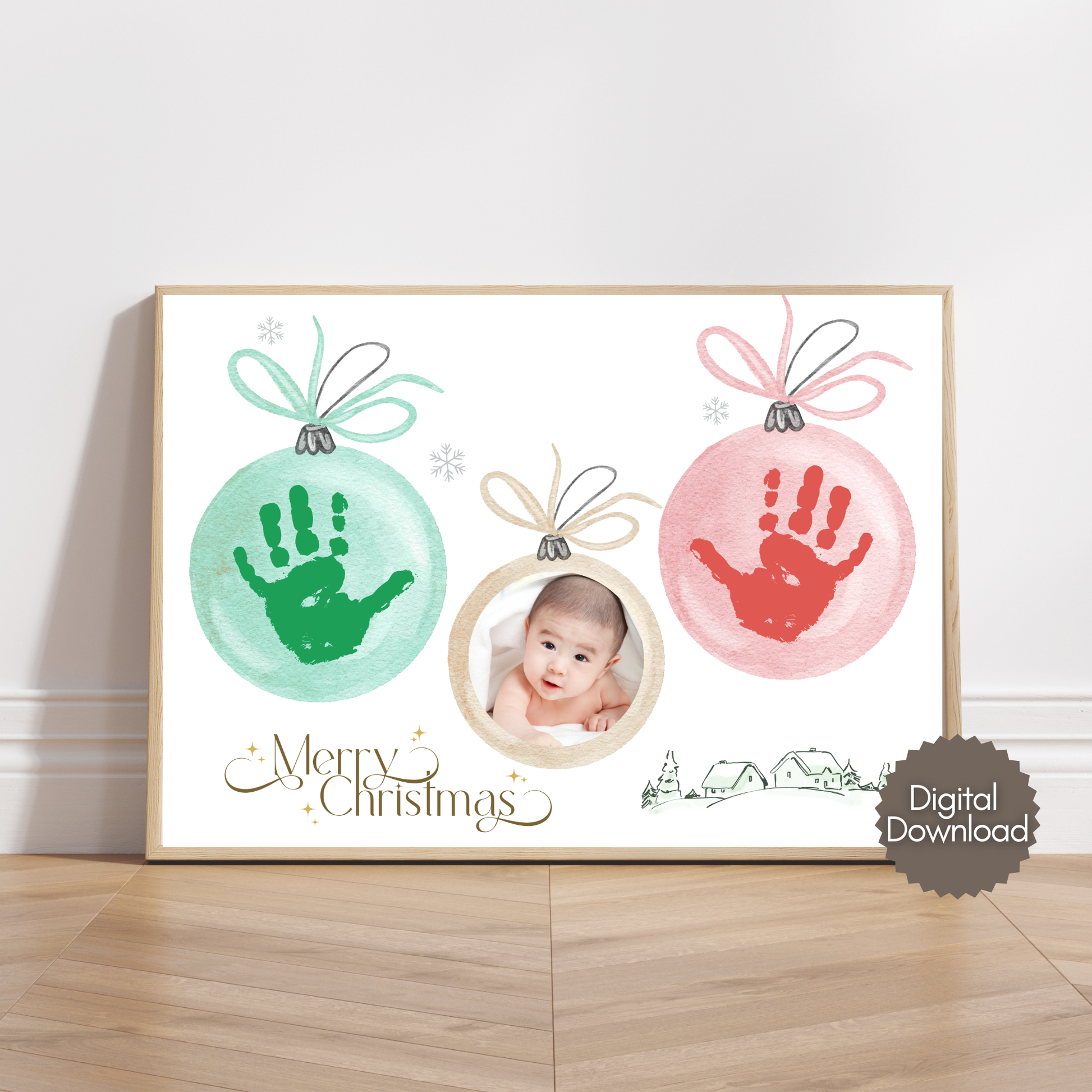 Create a simple & cute Christmas keepsake with this Ornament Craft Printable for Kids 🎄Featuring Merry Christmas above three clean, modern ornaments, the center for your baby’s photo and the two sides for sweet handprints or footprints; this minimalist design makes a timeless holiday memory.