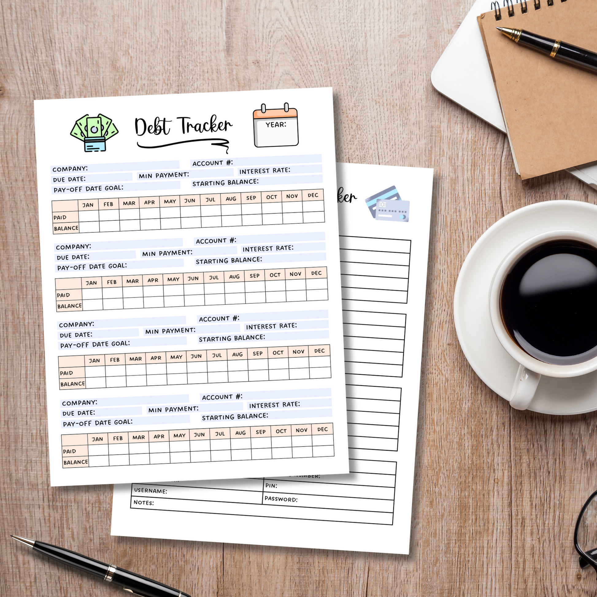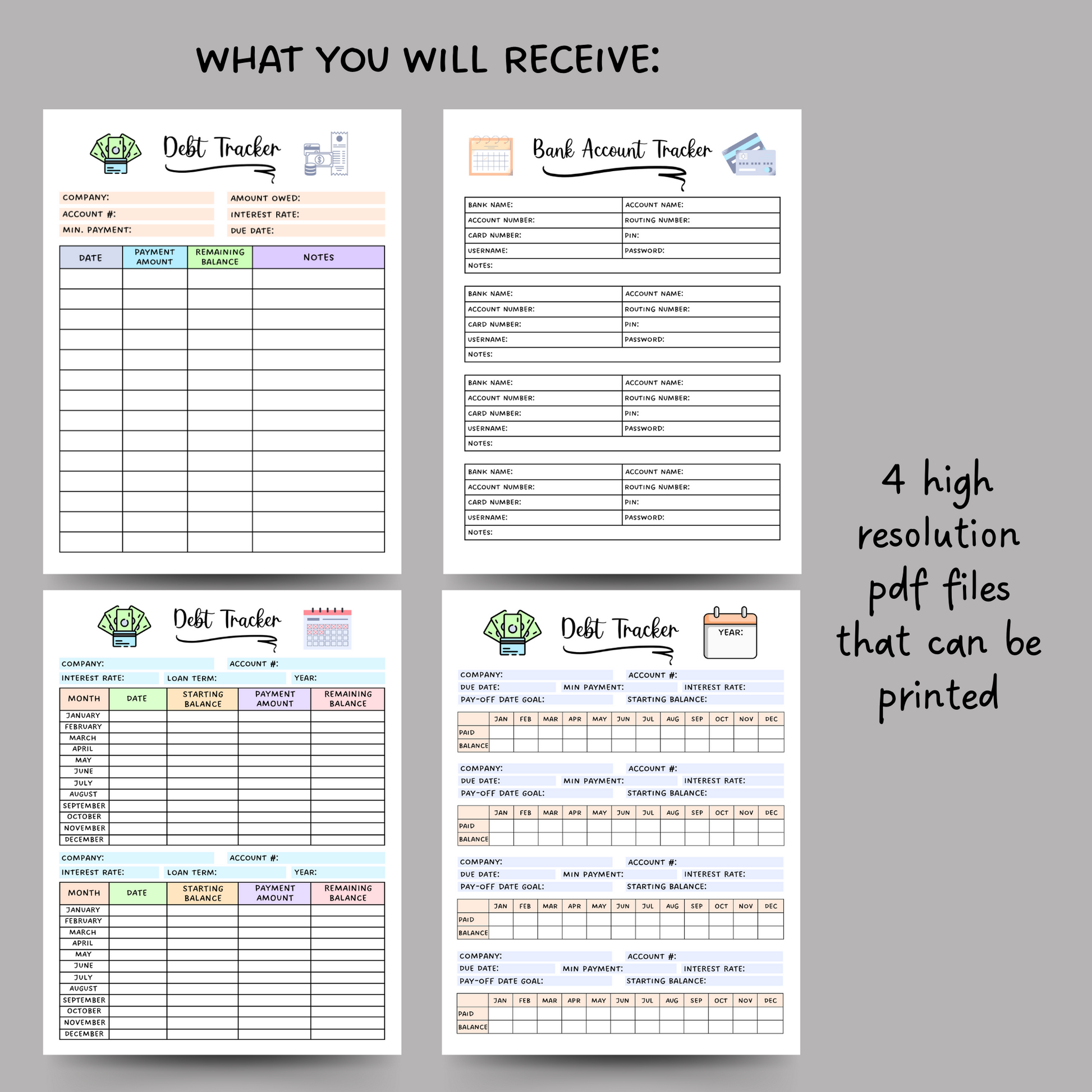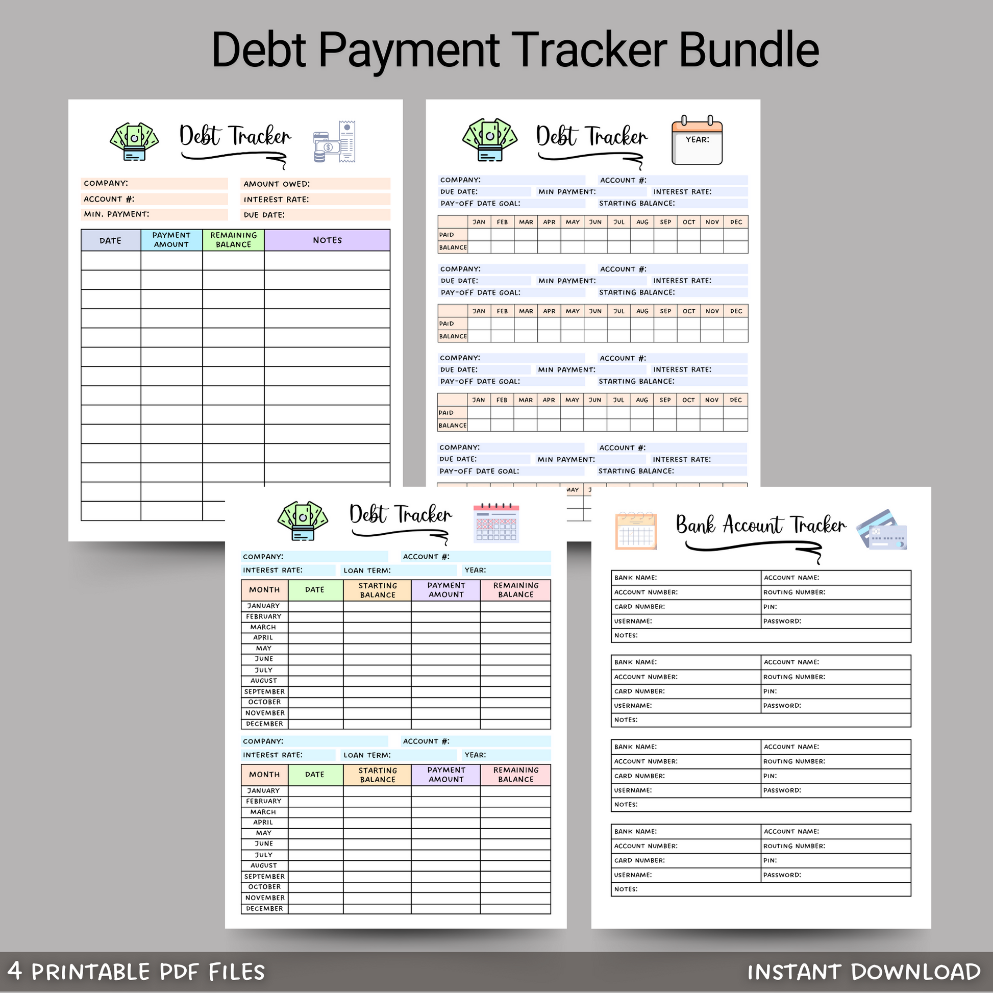 This debt payment tracker bundle is a printable PDF and an instant digital download! It is a simple and visual way to monitor and track your progress of various debts. These are perfect to motivate you to pay off your debts in an organized and timely manner! The bundle also includes a bank account tracker so you can easily keep track of all your accounts in one place for easy access. Simply download, print, and start right away to gain control of your finances! These are compatible with the GoodNotes app.