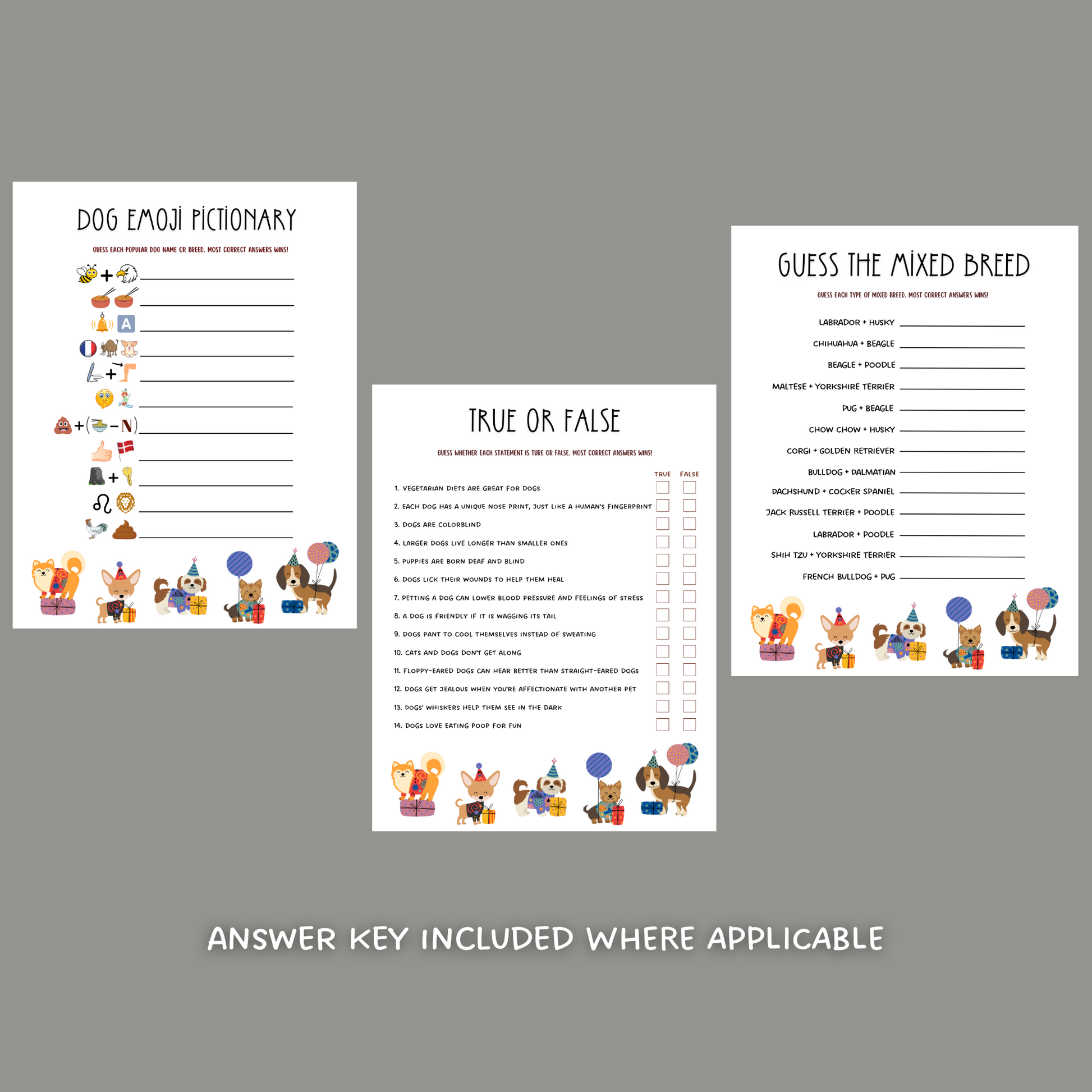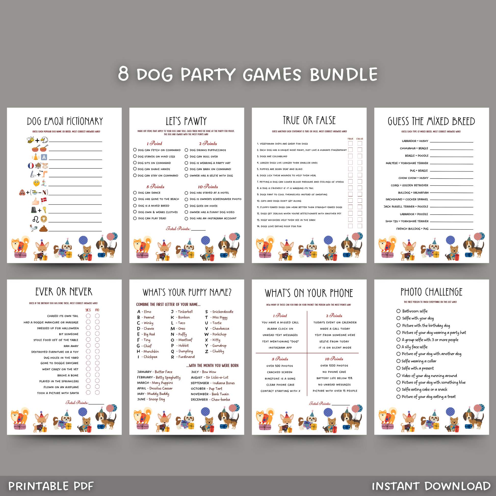 ✨ This 8 pack bundle of dog games is a printable PDF and an instant digital download! Whether it is for a dog themed birthday party, puppy shower, or a welcome home party, it is perfect to get your guests mingling and laughing for hours! ✨