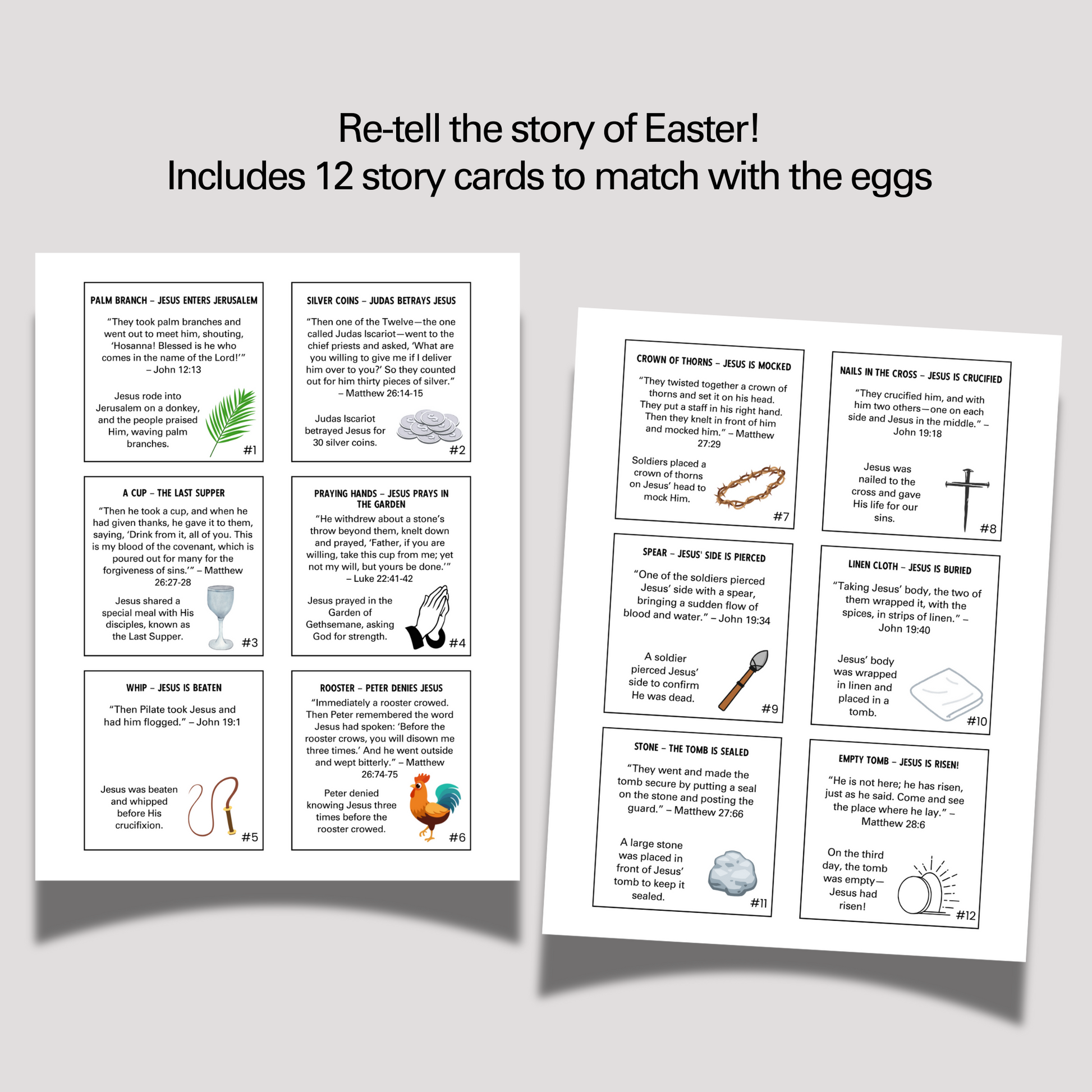 - Cut out the 12 printable eggs featuring different parts of the Easter Story