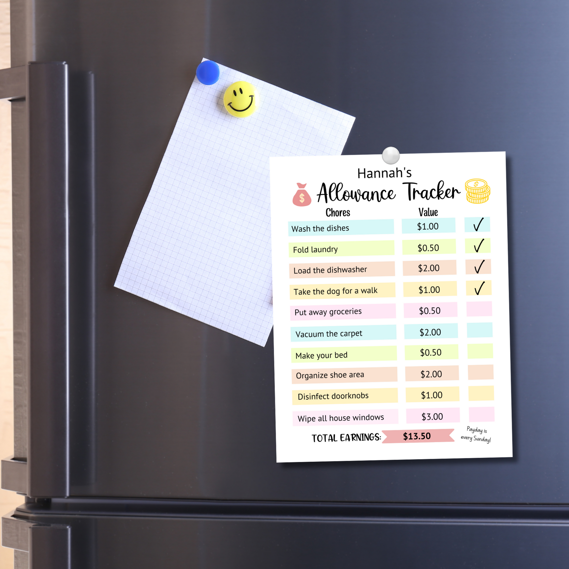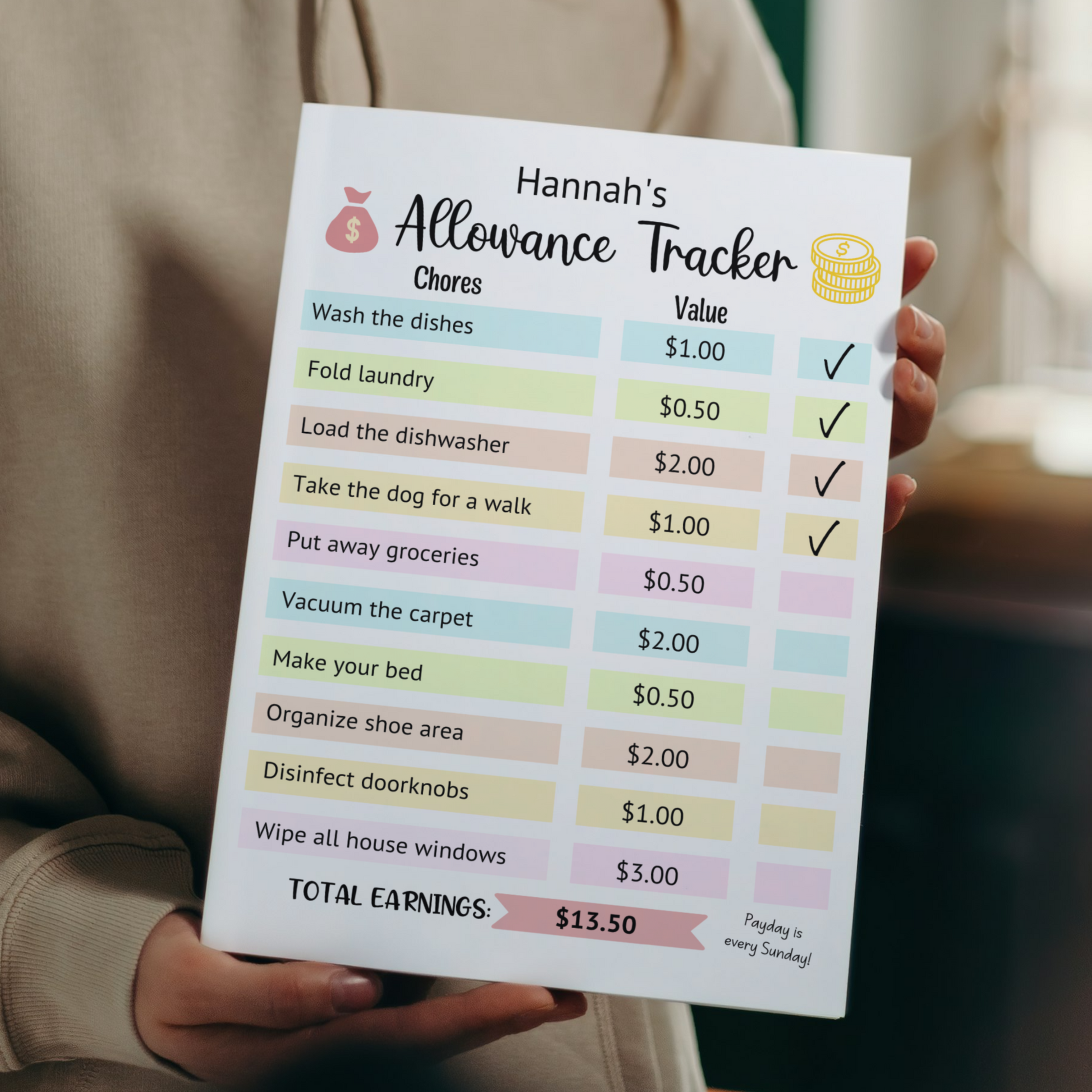 This editable allowance chart for kids is a printable PDF and instant digital download. It is a fun way for kids to have opportunities to earn money and teach them the importance of working hard!