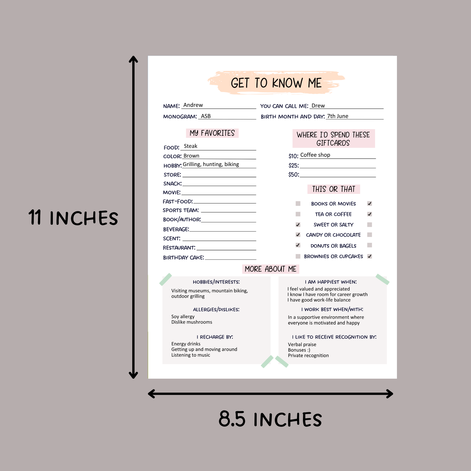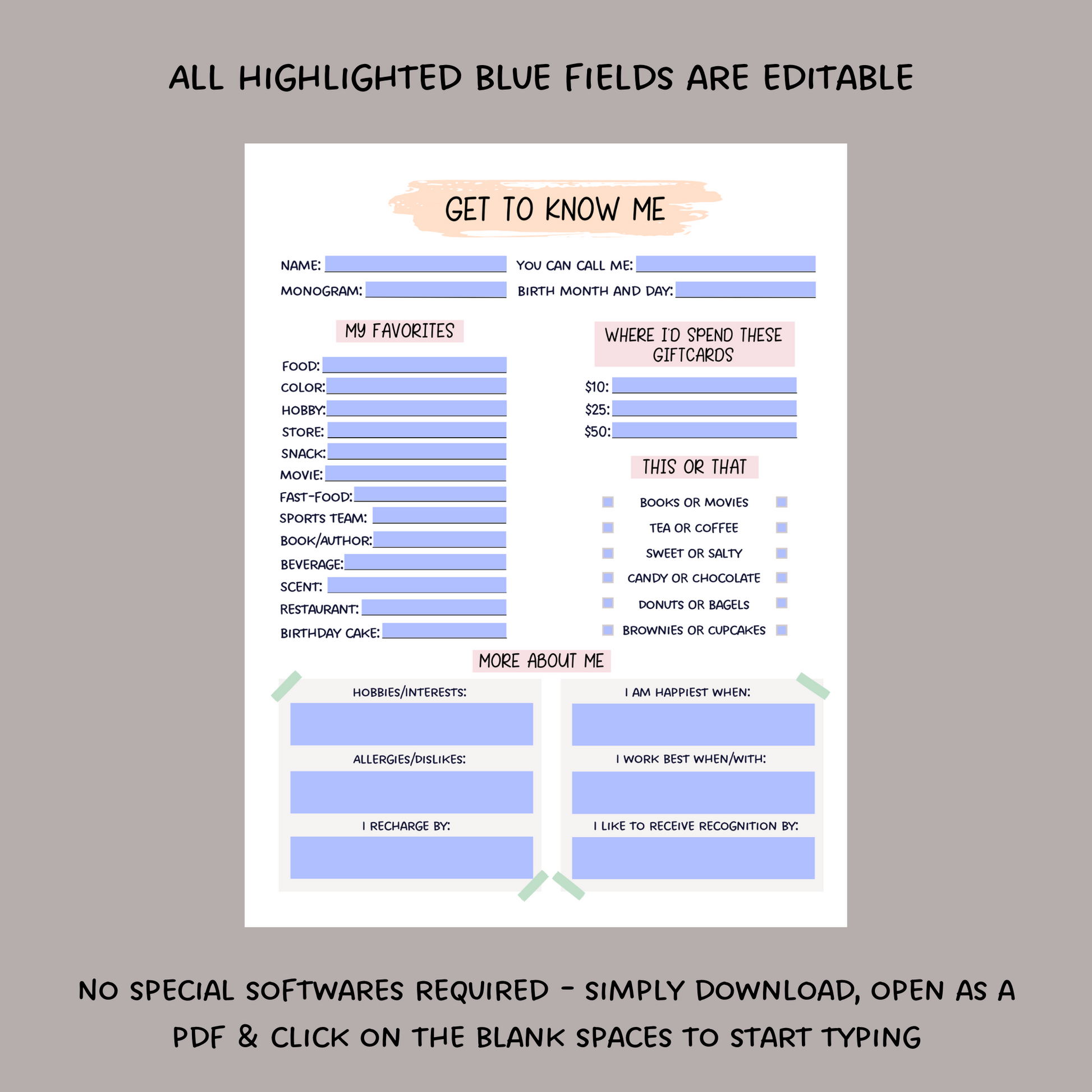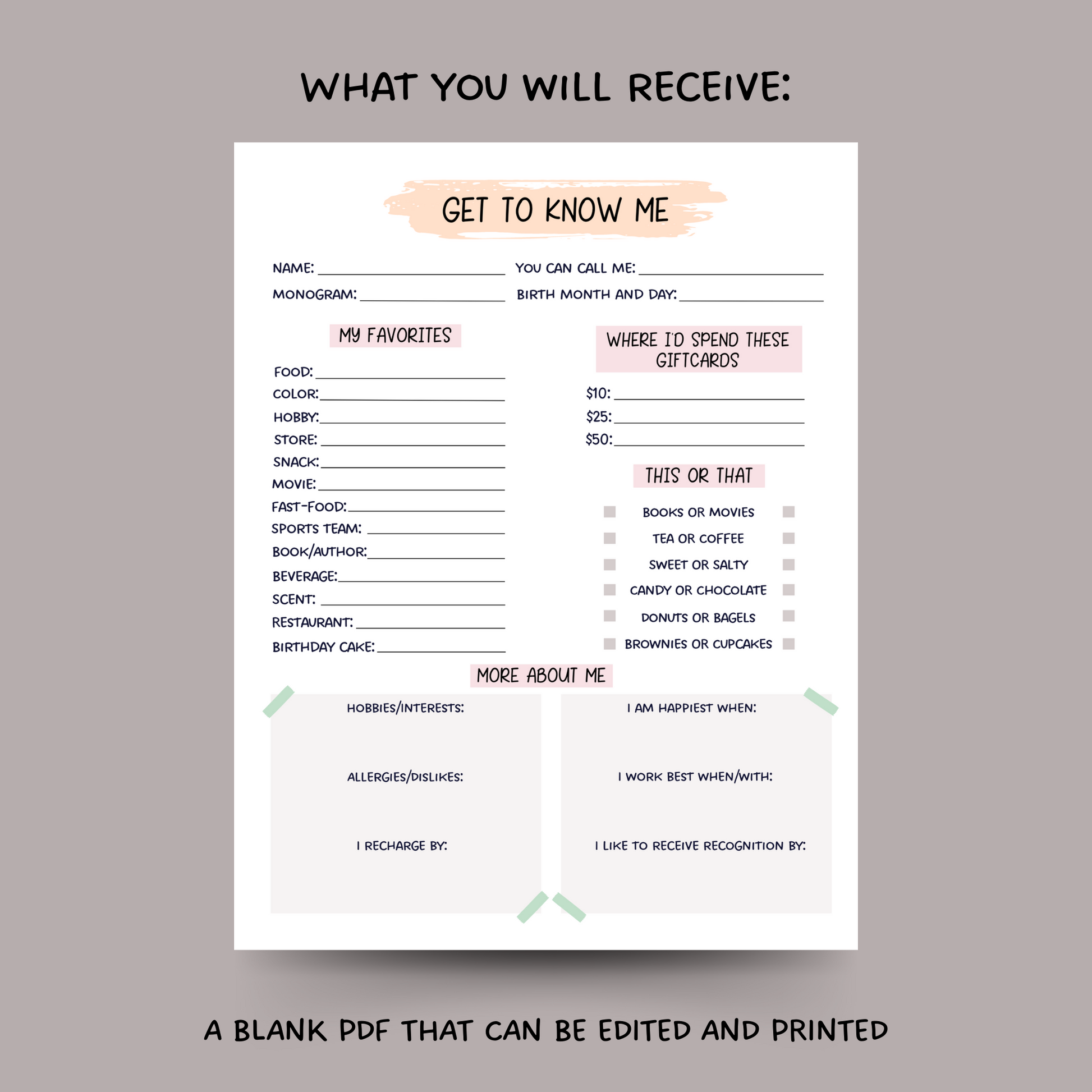 Editable Coworker Questions, Printable All About Me Employee Questionnaire