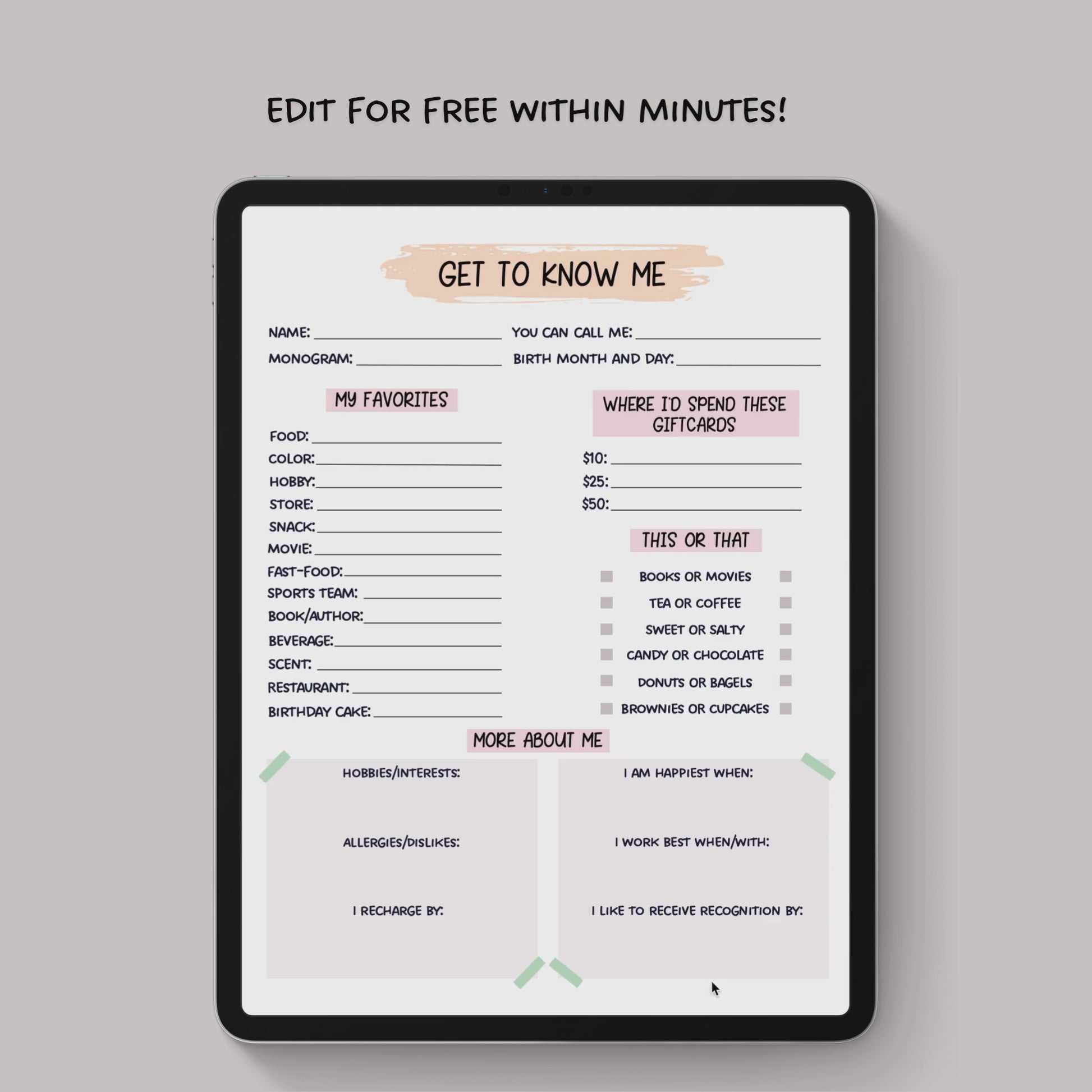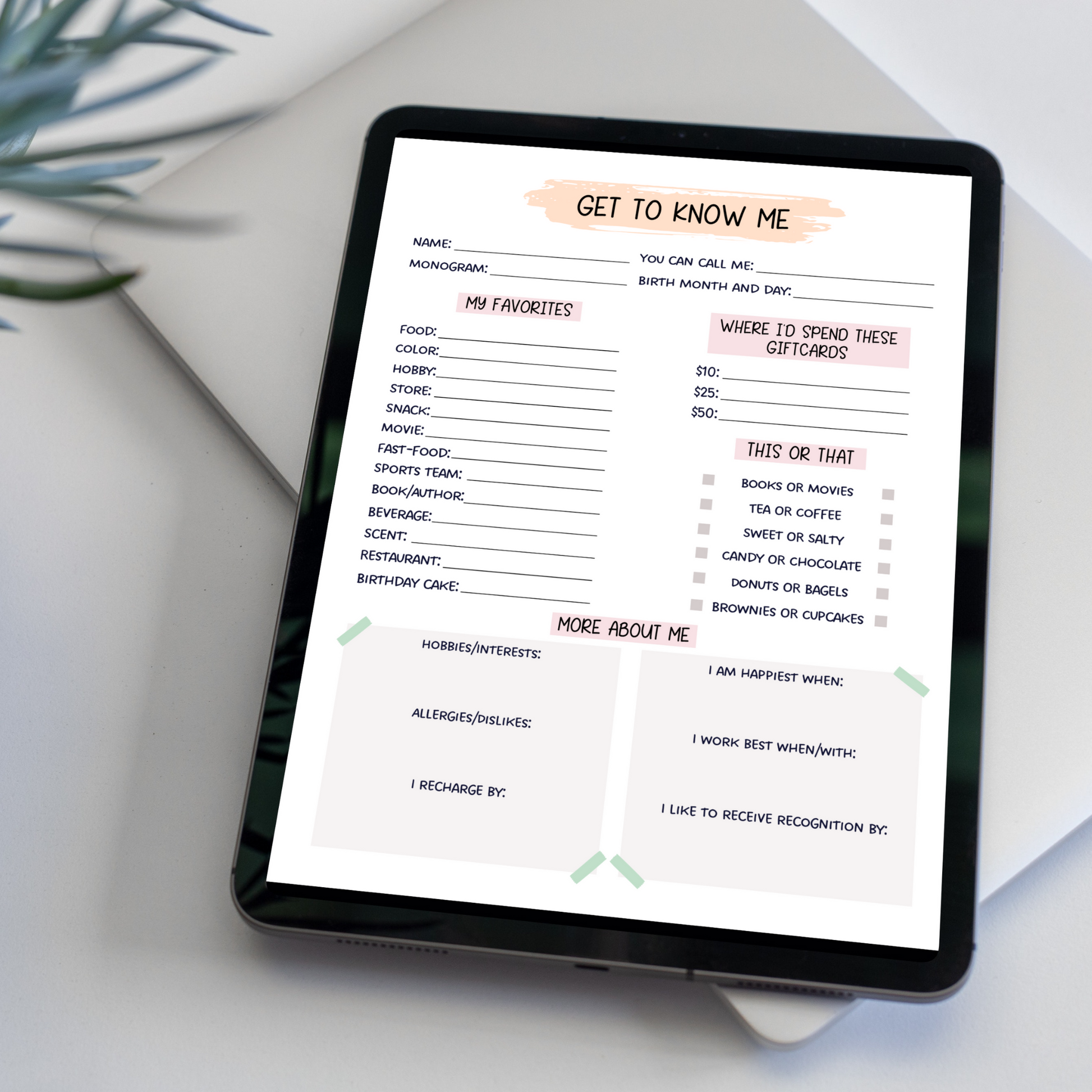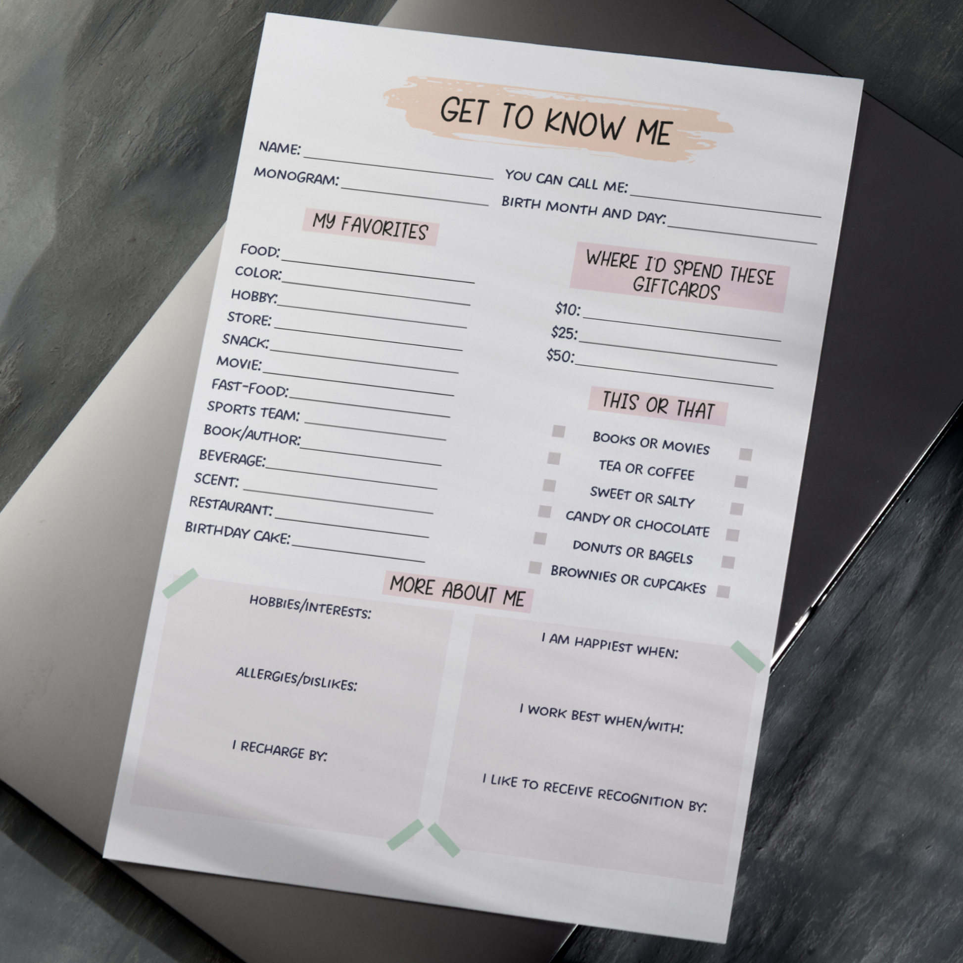 Editable Coworker Questions, Printable All About Me Employee Questionnaire