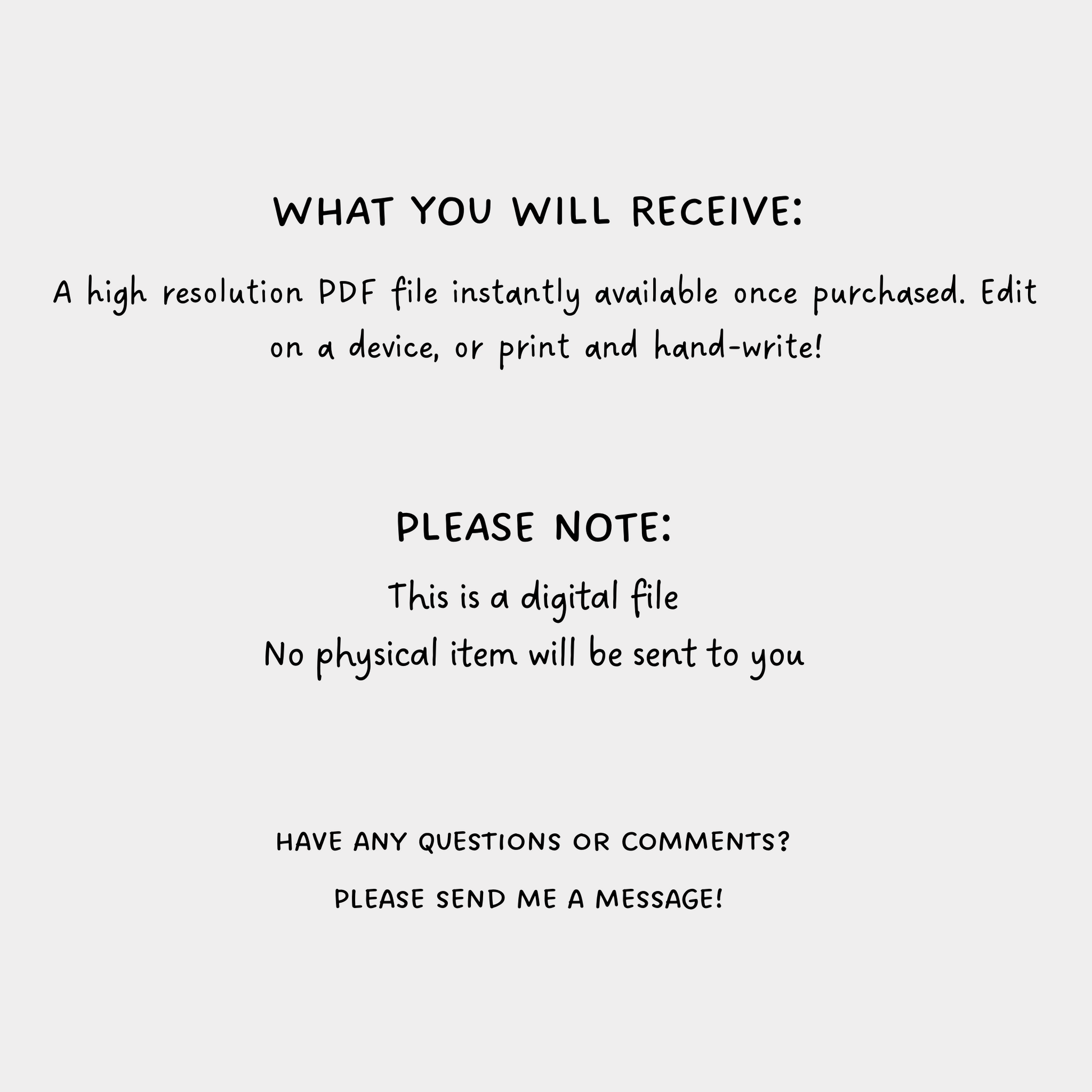 NOTE: The font type, size, font color, and placement will NOT be editable. Only one font is available. This sheet is also compatible with the GoodNotes app.