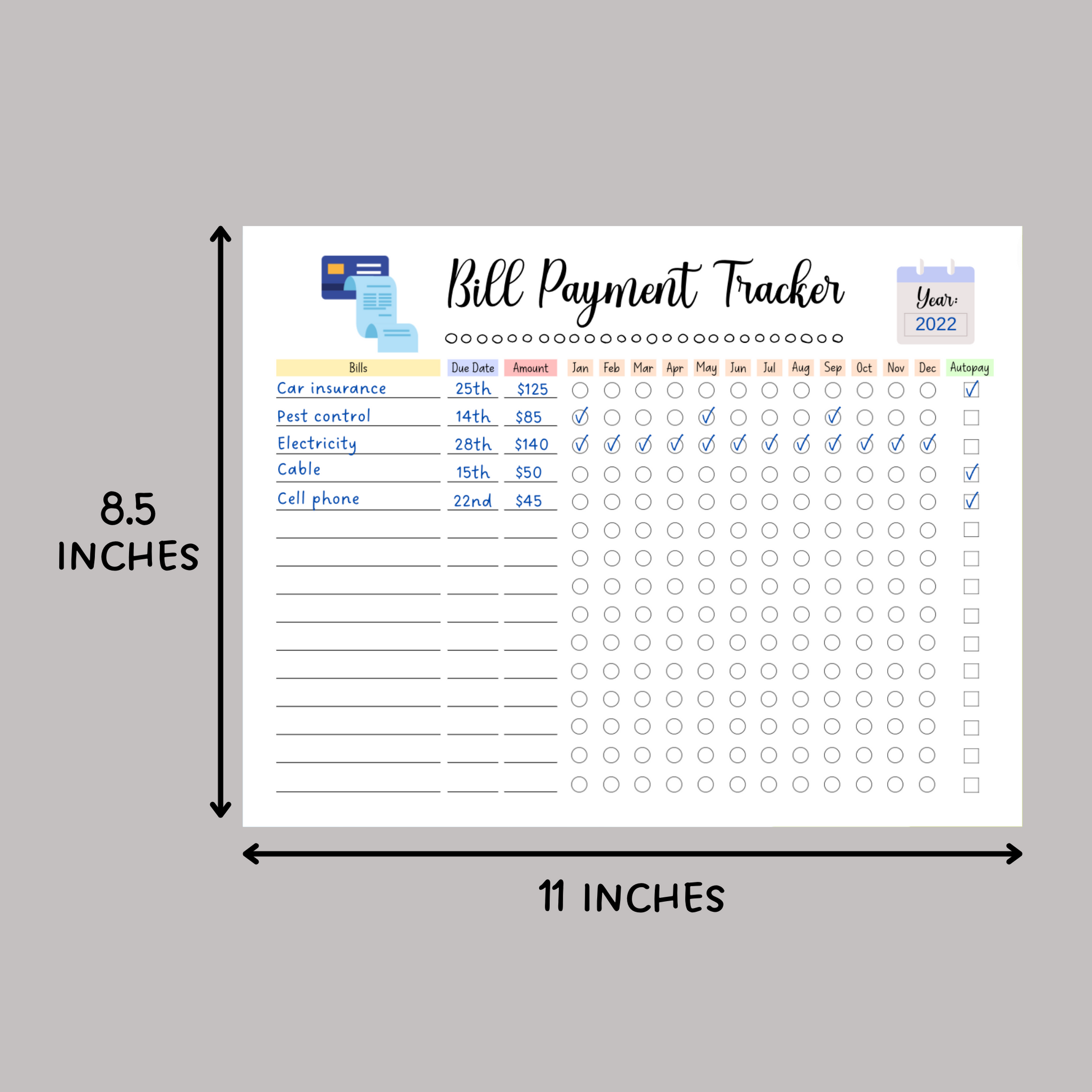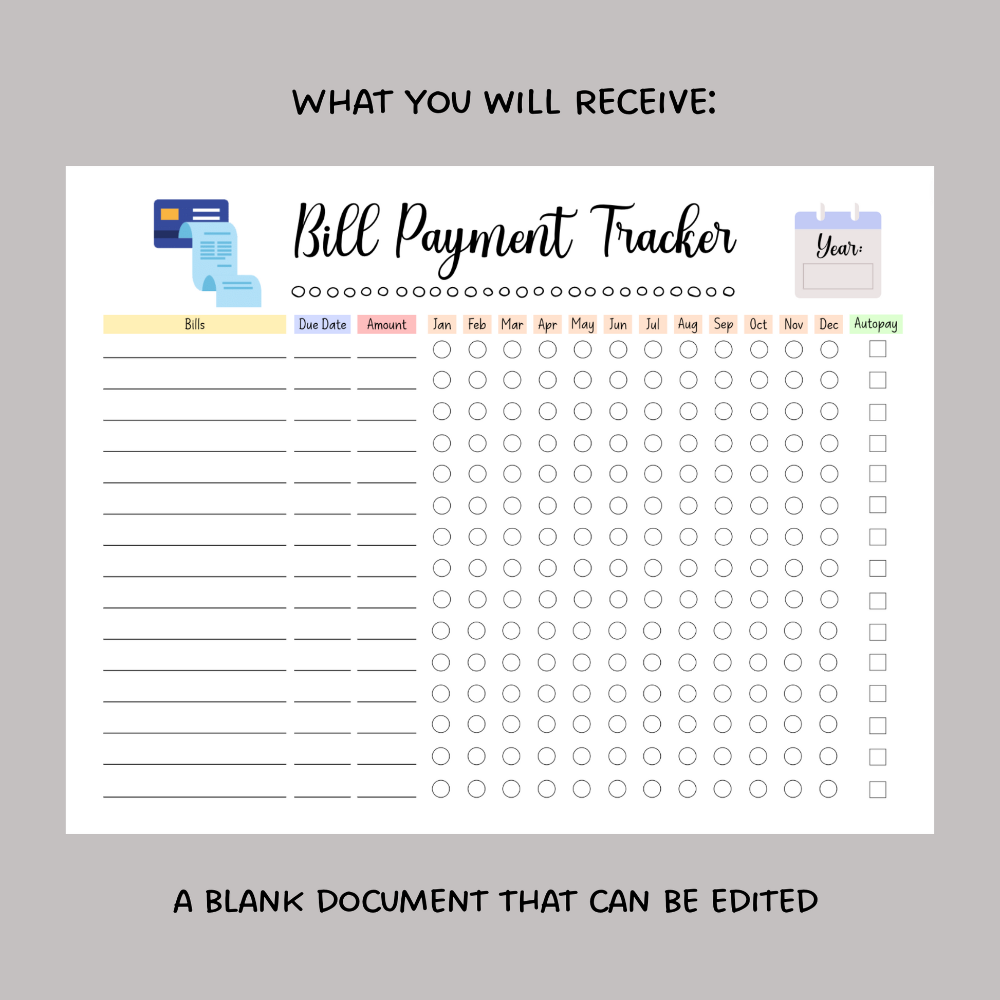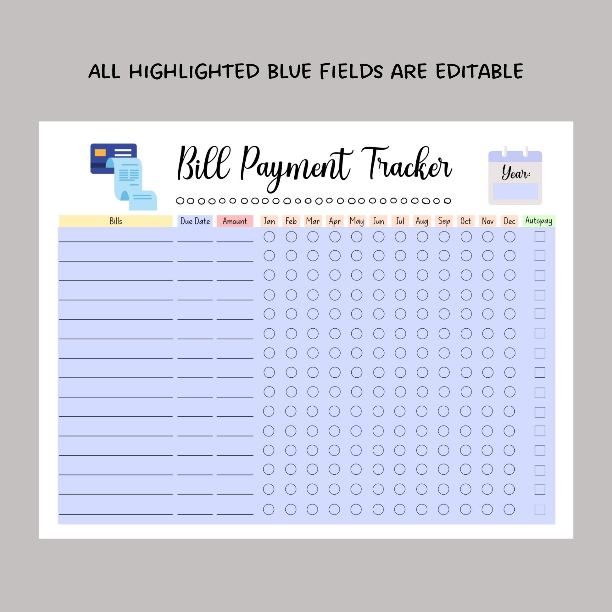 Editable Yearly Bill Tracker, Printable Monthly Bill Planner Payment Log