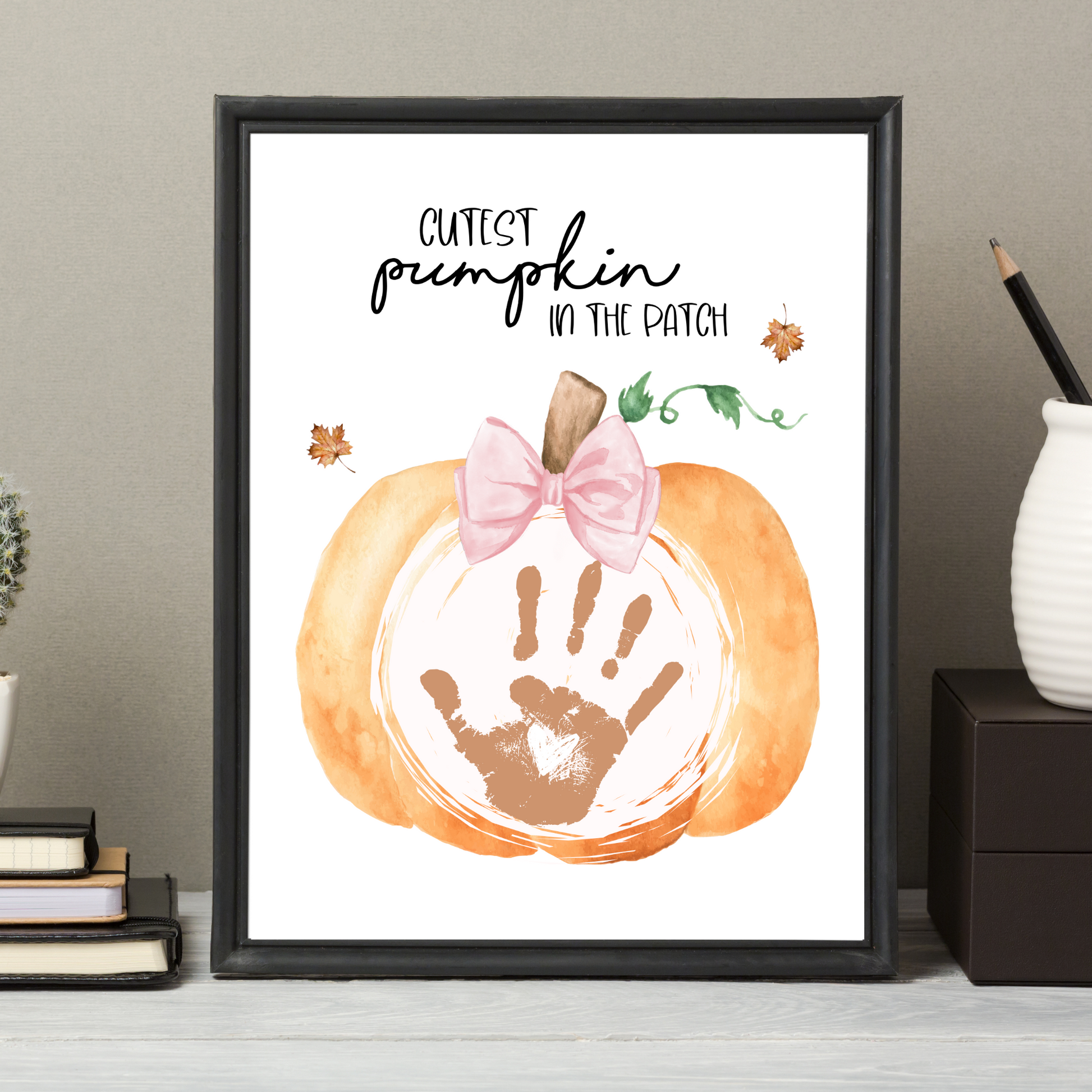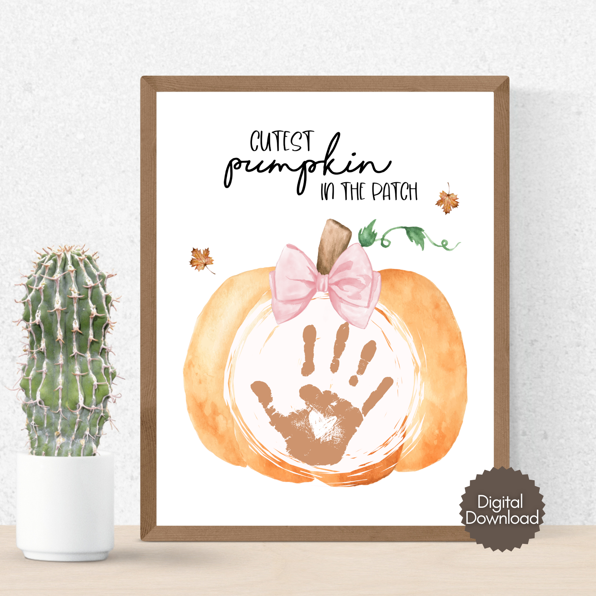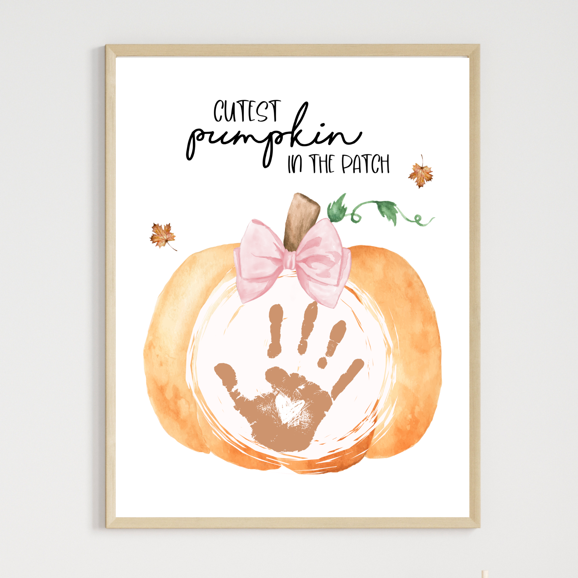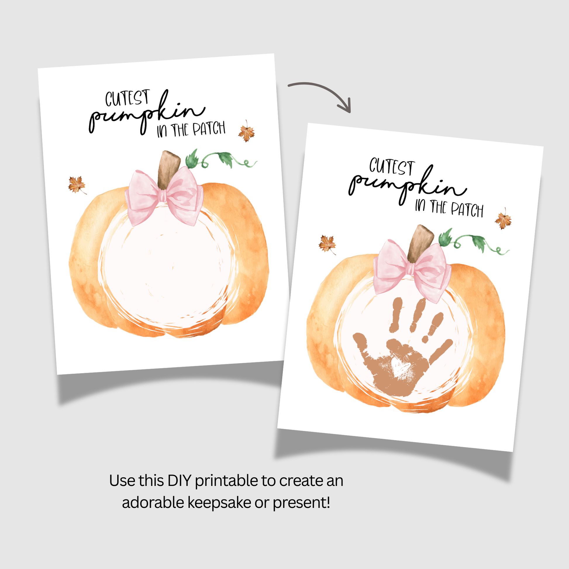 Coquette Bow Cutest Pumpkin in the Patch Handprint Craft Printable, Fall Footprint Wall Art Template Thanksgiving Decor Personalized Gift Cute Seasonal DIY Activity for Kids, Baby, Toddler Homeschool Project Keepsake đ