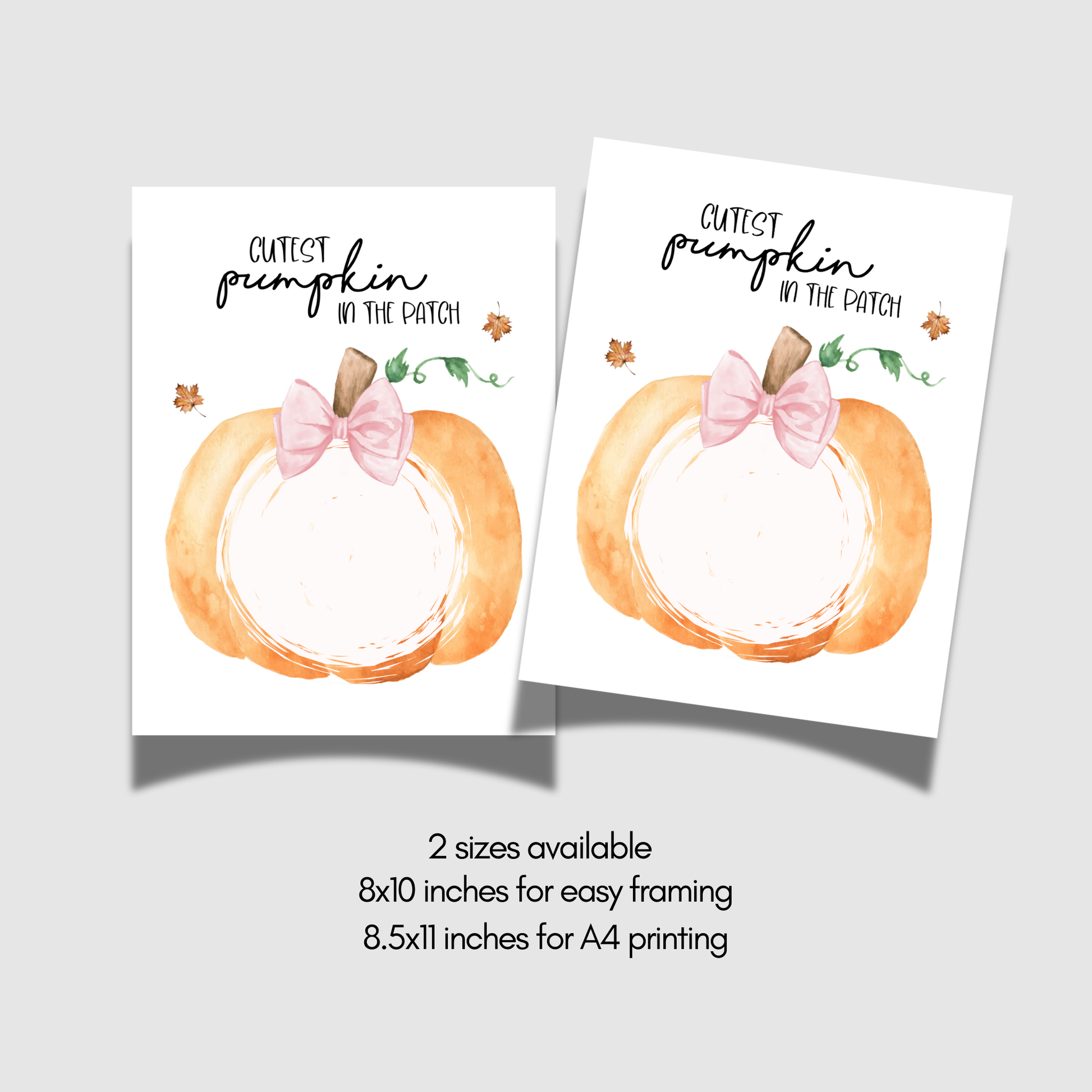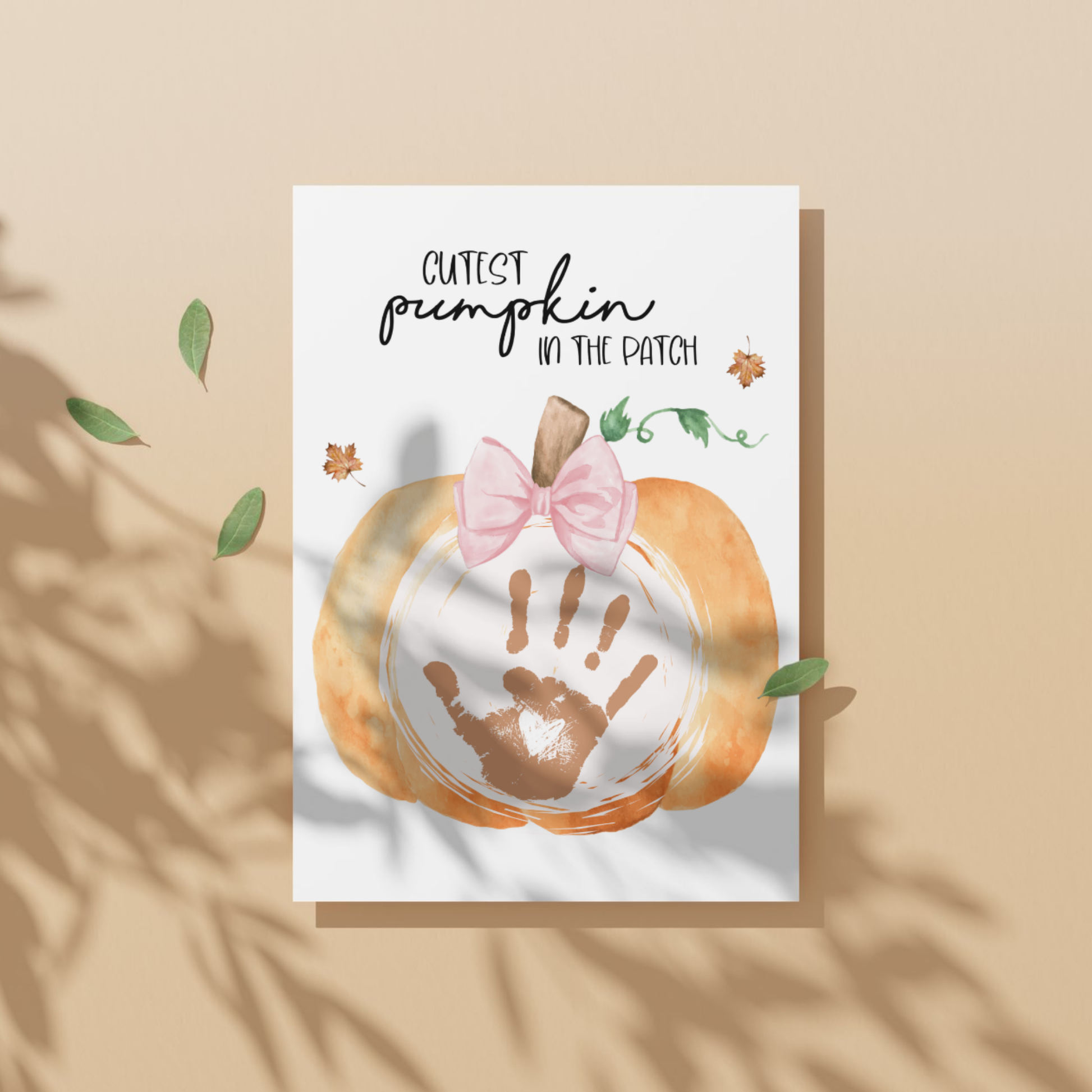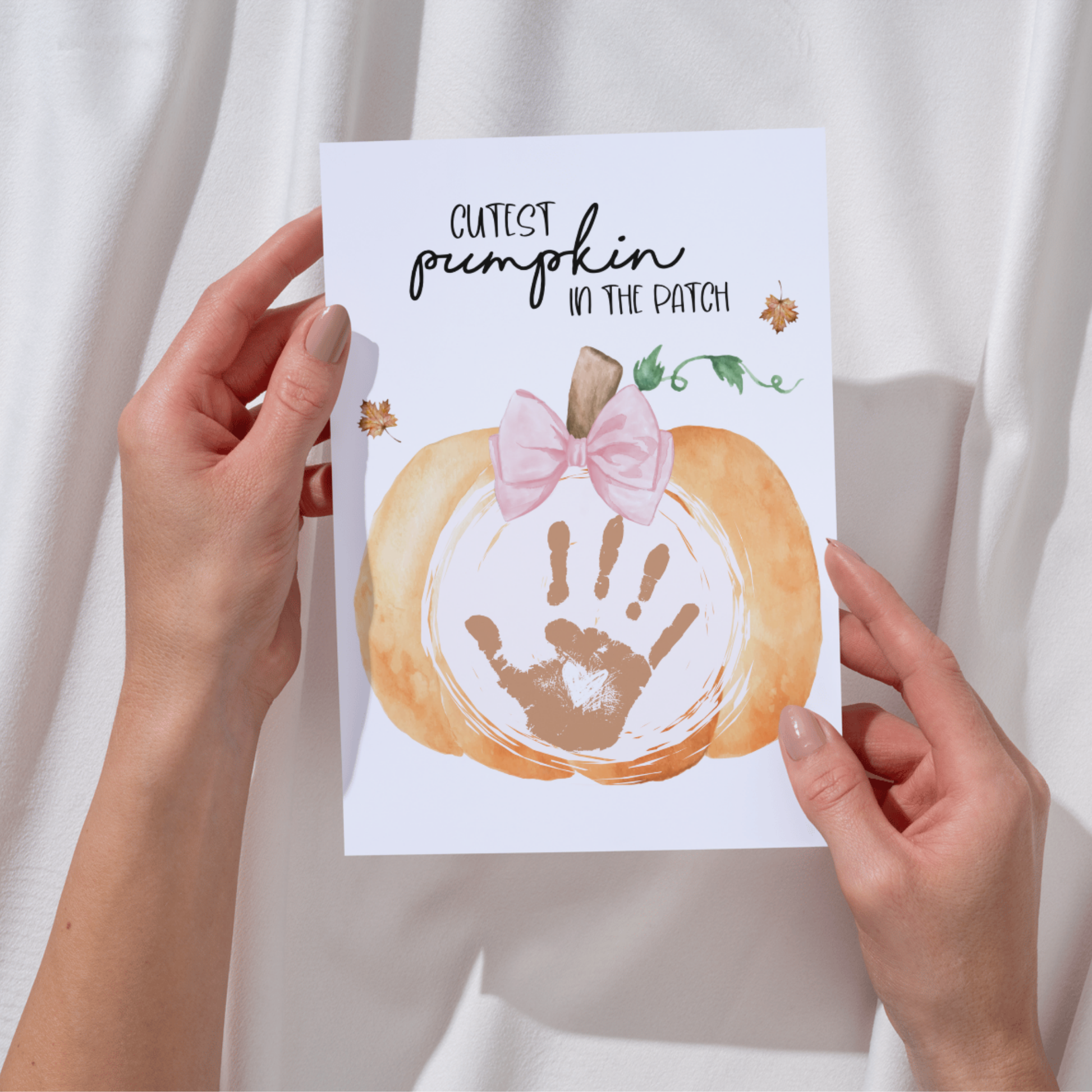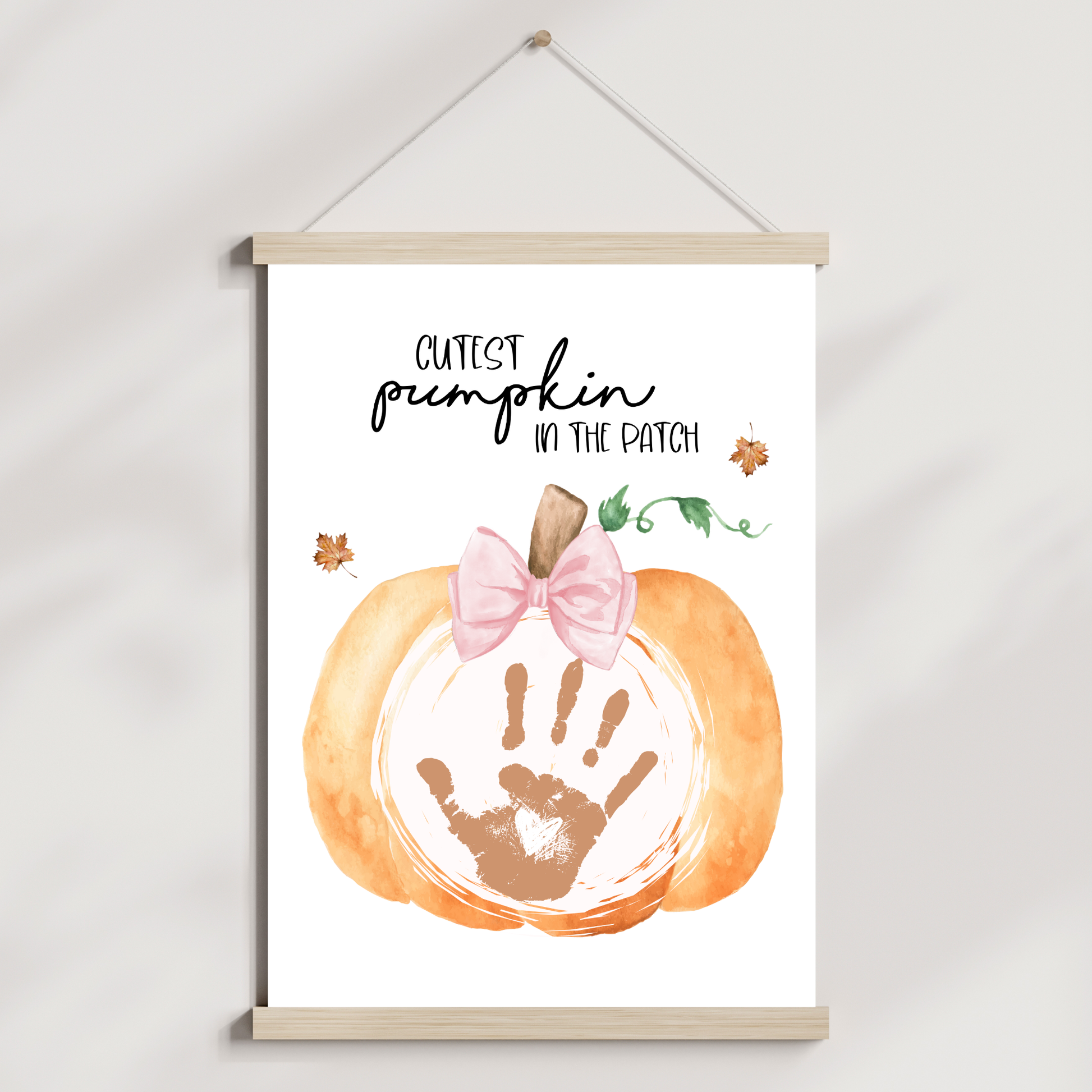 Coquette Bow Cutest Pumpkin in the Patch Handprint Craft Printable, Fall Footprint Wall Art Template Thanksgiving Decor Personalized Gift Cute Seasonal DIY Activity for Kids, Baby, Toddler Homeschool Project Keepsake đ