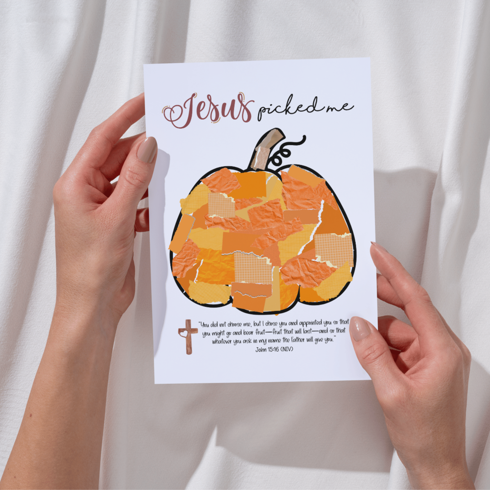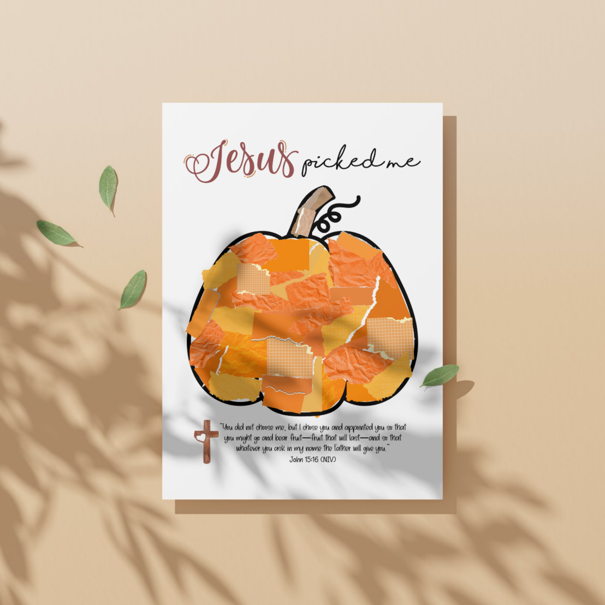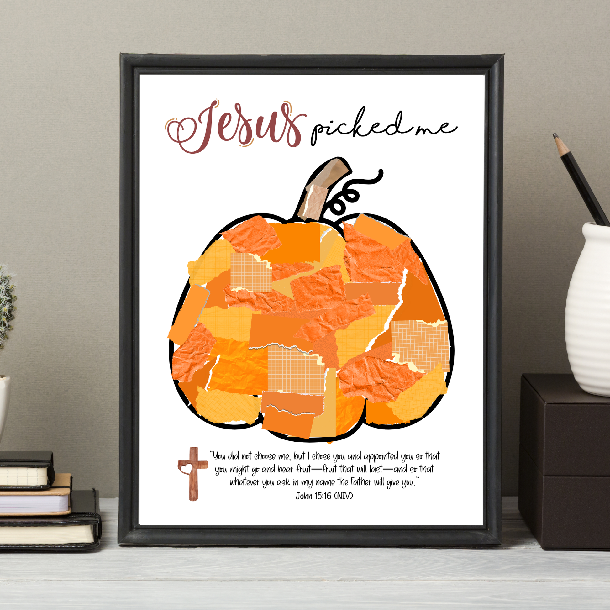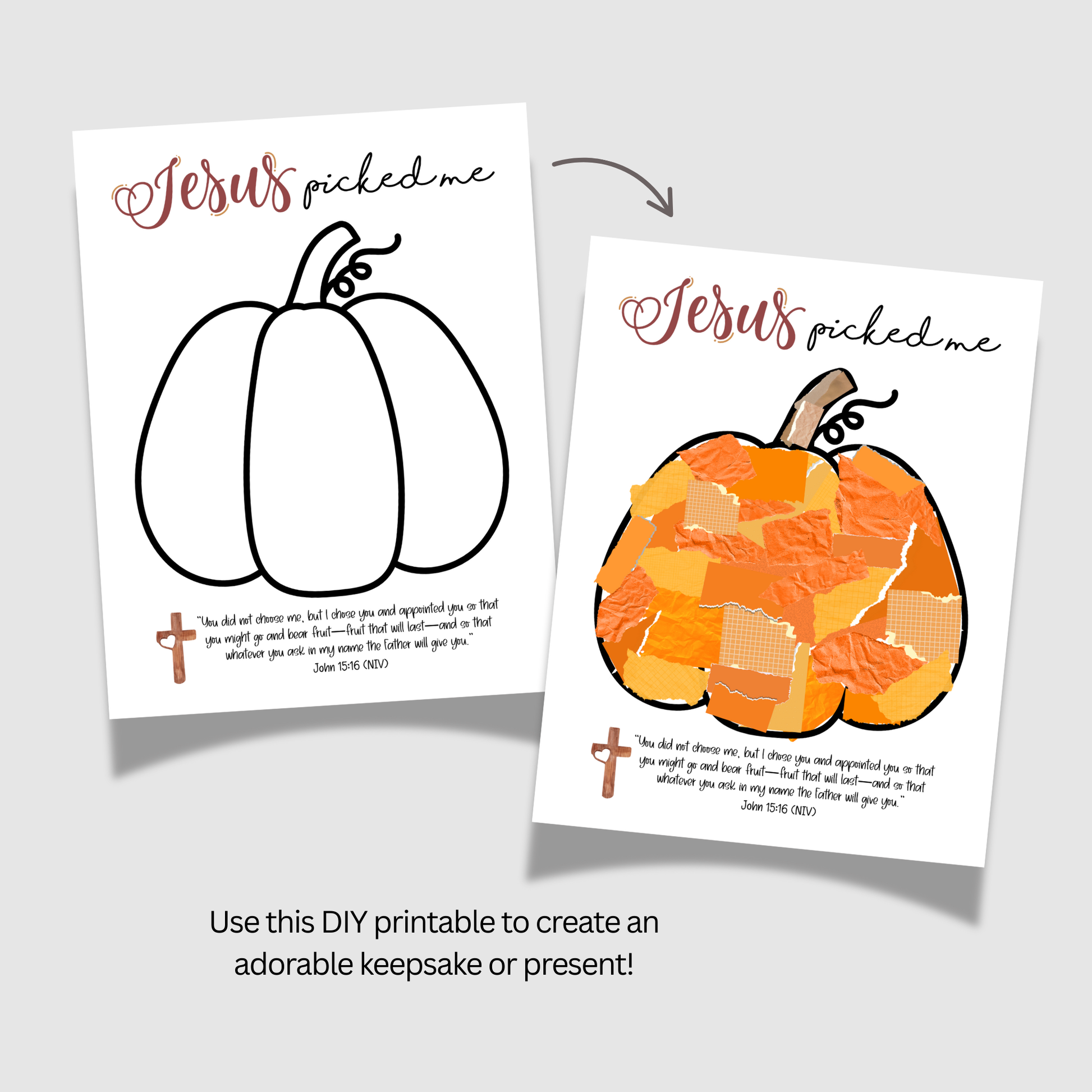 Celebrate the season of harvest with this Fall Pumpkin Torn Paper Craft Printable for Kids, a fun and faith-filled activity that reminds little ones of God’s love. Featuring the sweet message “Jesus Picked Me” with a Bible verse at the bottom, this Christian autumn craft is perfect for Thanksgiving activities, Sunday school lessons, Bible class, homeschool projects, and fall church events. ✝️