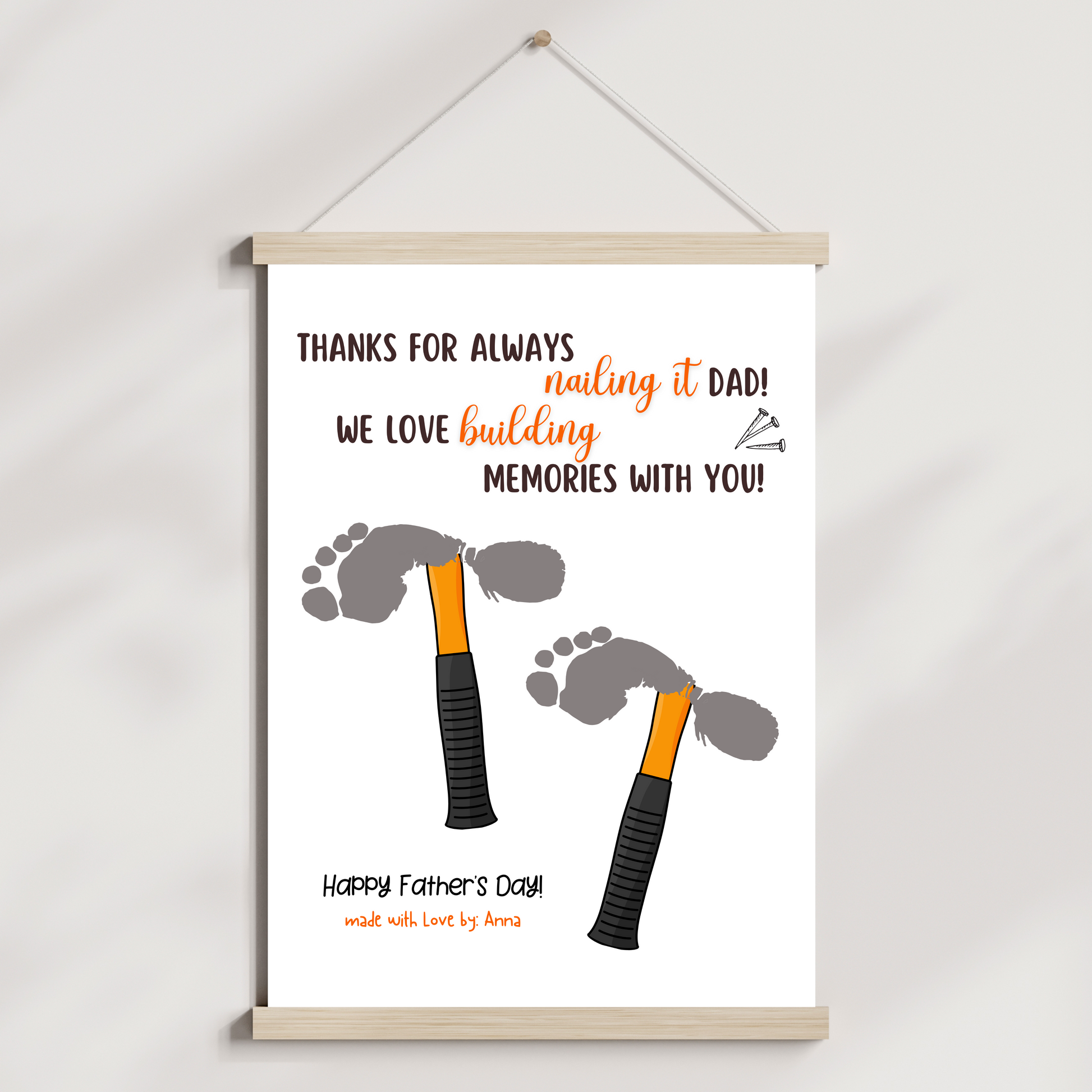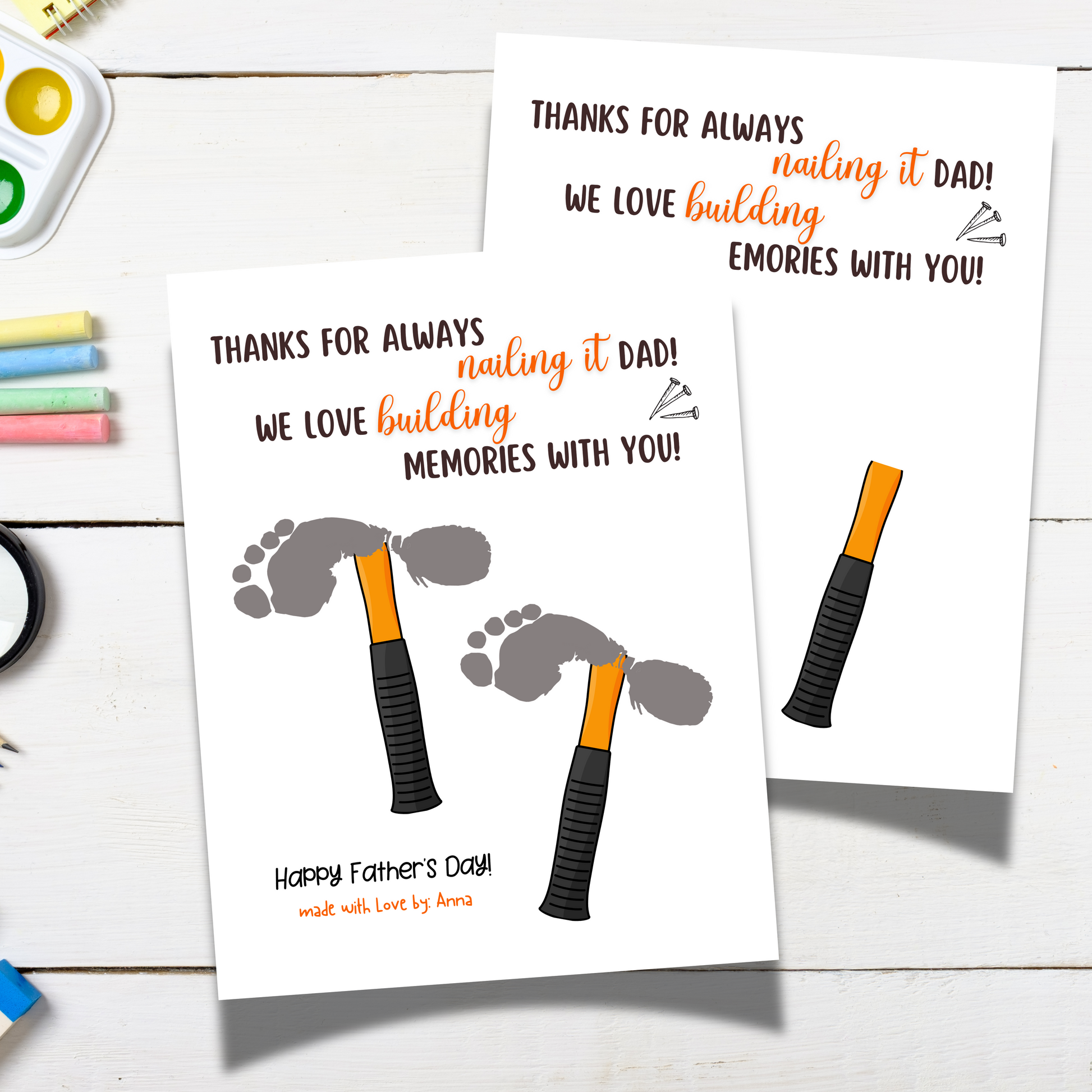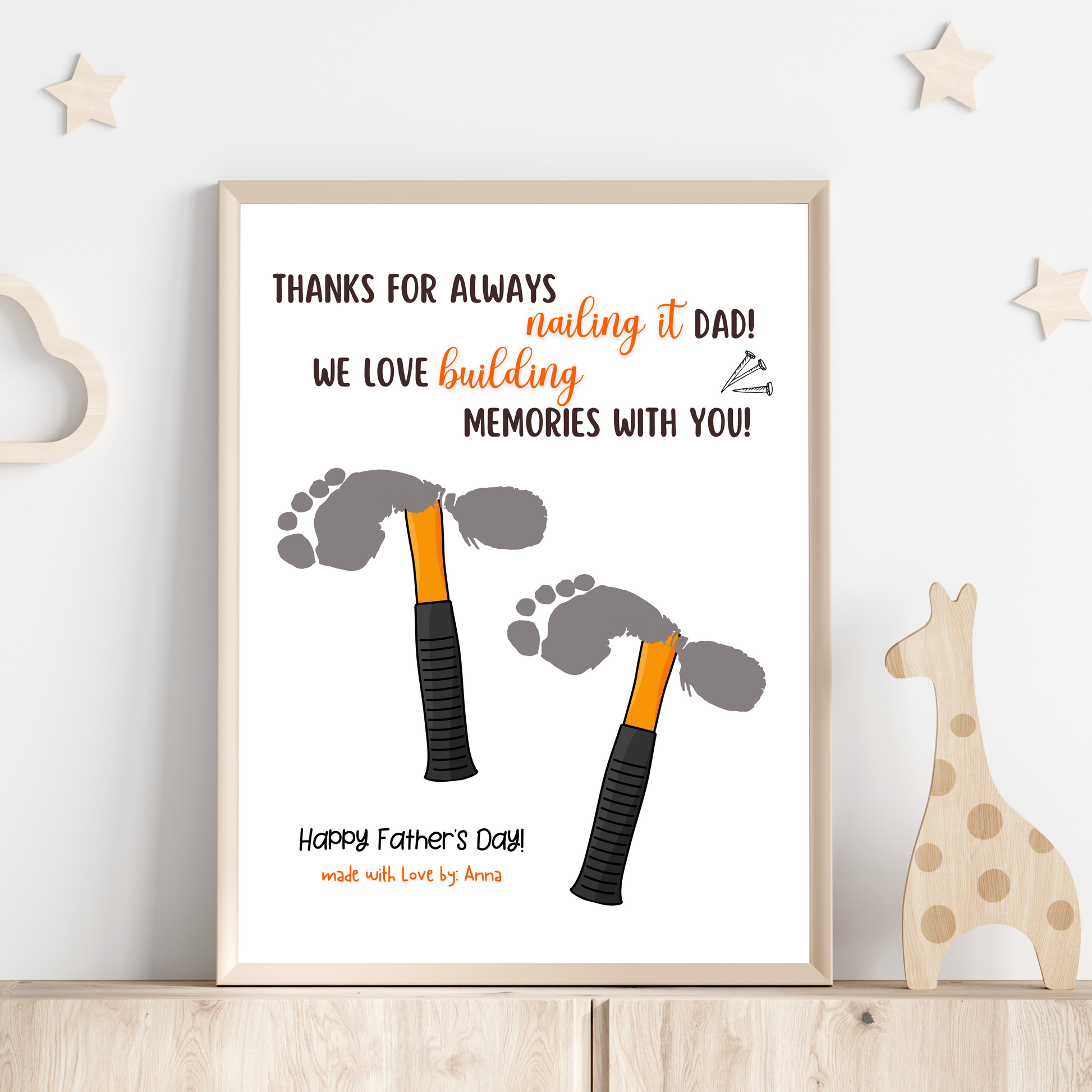 "Thanks for always nailing it Dad" Printable Footprint Hammer Craft for Loving Dad – DIY Gift from Kids for Father’s Day, Birthday, or Just Because 💙 Looking for a fun and meaningful way for your little one to show Dad just how much he means? These adorable printable handprint template is the perfect choice! Whether it’s for Father’s Day, his birthday, or just a surprise gift to warm his heart, this craft turn little feet into a keepsake he’ll treasure forever.
