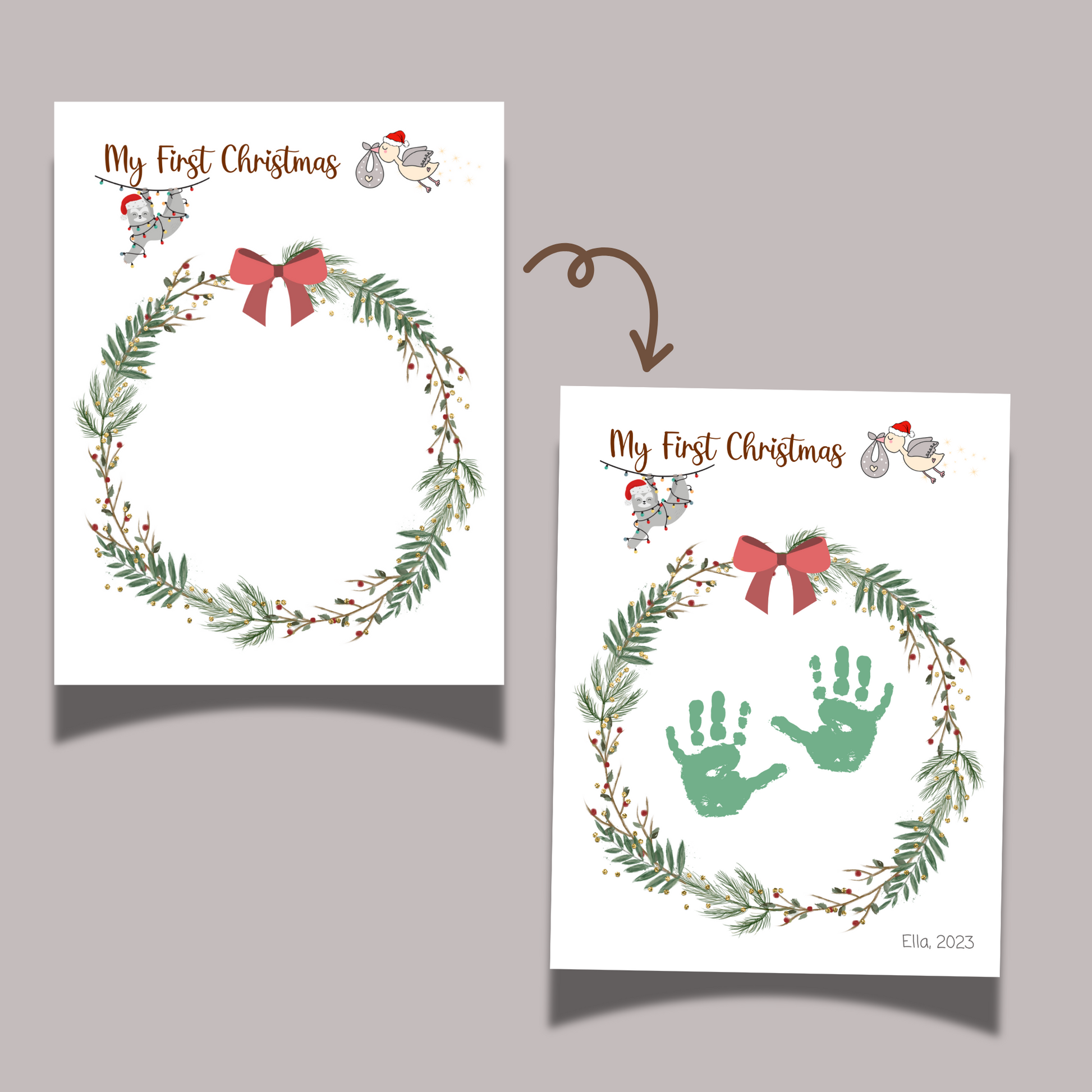 Create special holiday memories with this personalized Baby's First Christmas handprint art & crafts printable, perfect for newborns, babies, toddlers, and kids! This fun and easy DIY project lets you capture those tiny handprints, fingerprints, or footprints to cherish for years to come. It’s a heartwarming keepsake that’s perfect for family traditions and ideal for offering as a gift to family members like mom, dad, grandma, grandpa, nana, papa, auntie, or uncle. 🎄👣