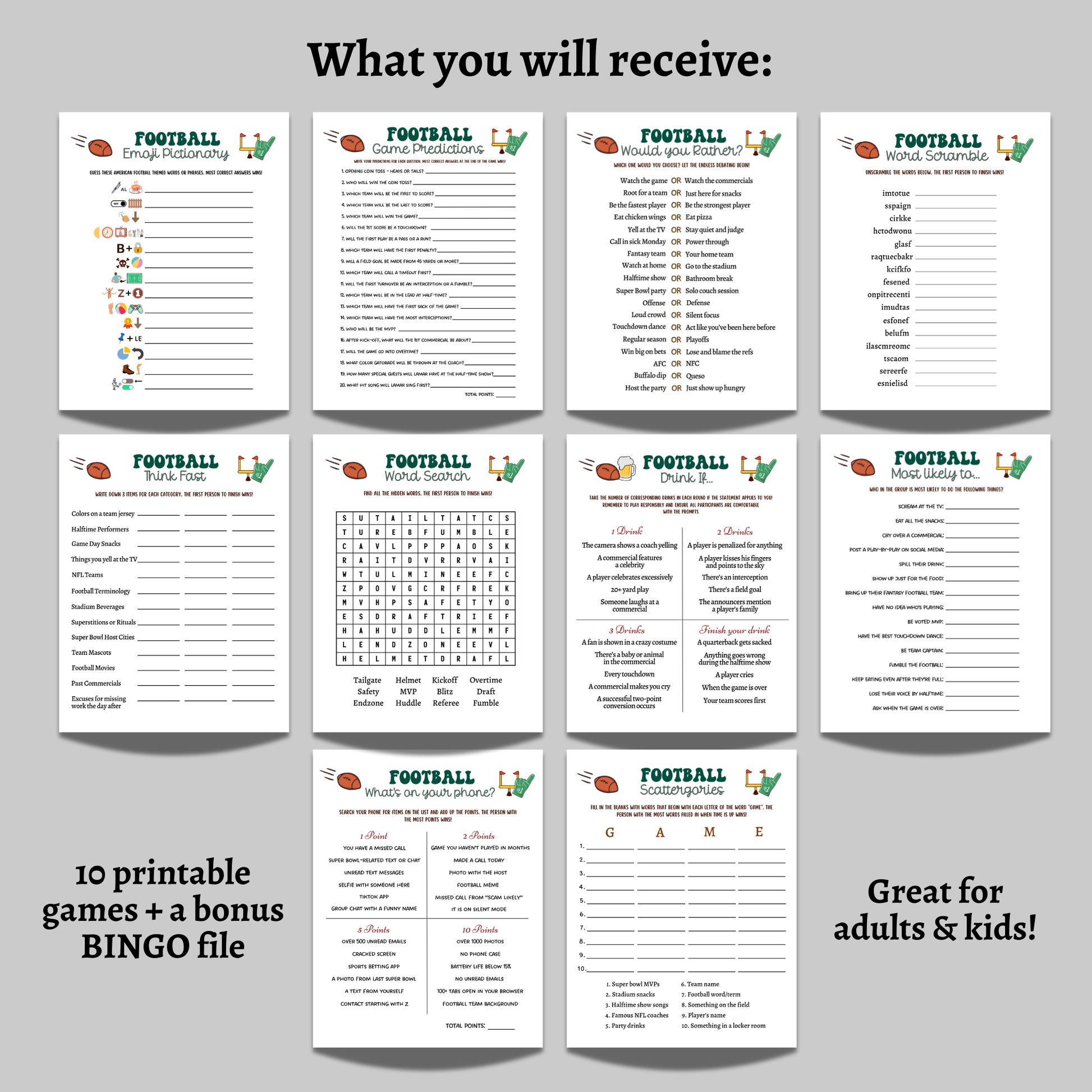 Hosting a Super Bowl party or football-themed event? This 10-game printable bundle is packed with fun activities to entertain guests of all ages! Whether you’re cheering on your favorite team, enjoying game day snacks, or just love the excitement of Super Bowl Sunday, this set of football party games will keep the crowd engaged and laughing. Perfect for tailgate parties, family gatherings, office pools, fantasy football events, and kids’ activities, this printable pack is an instant way to level up your Game Day fun! 🏈