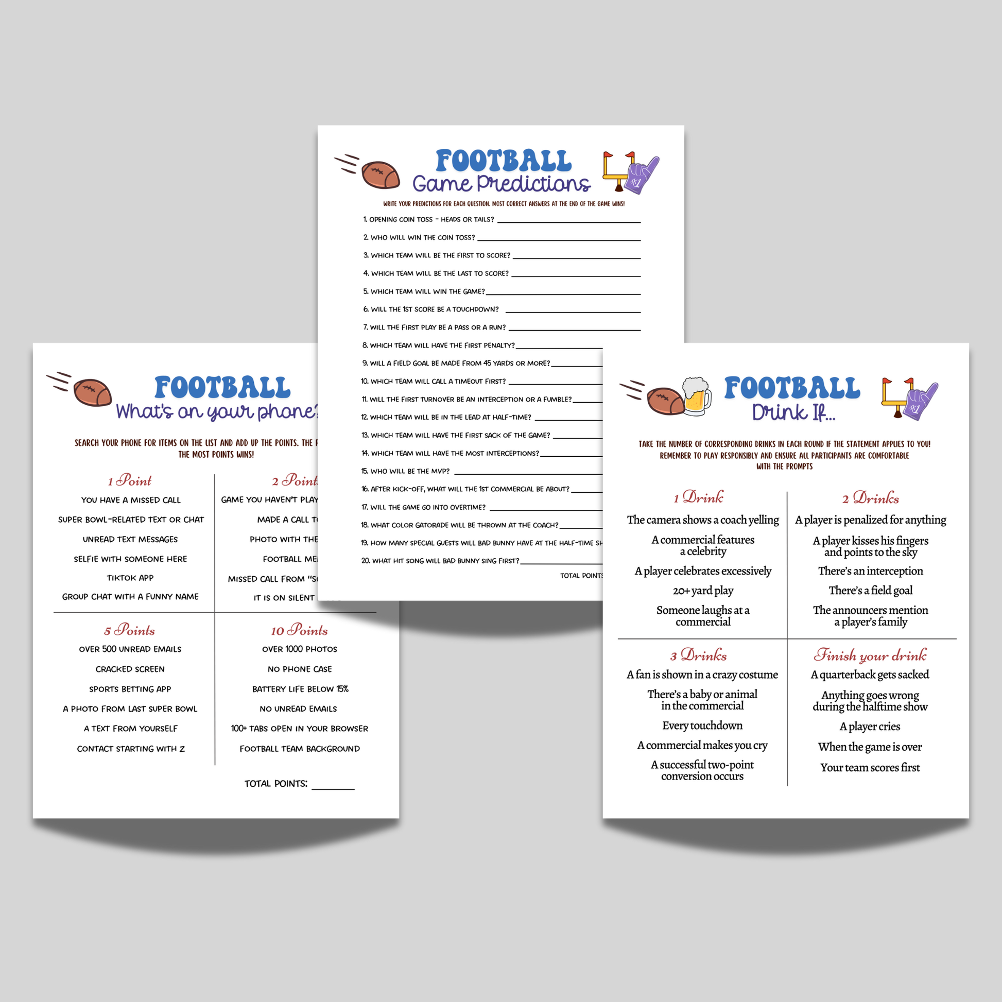 Make Game Day unforgettable with this Super Bowl Party Games Bundle! Get ready for big laughs, friendly competition, and tons of football-themed fun with this instant download. Just print, play, and let the excitement begin! 🏆
