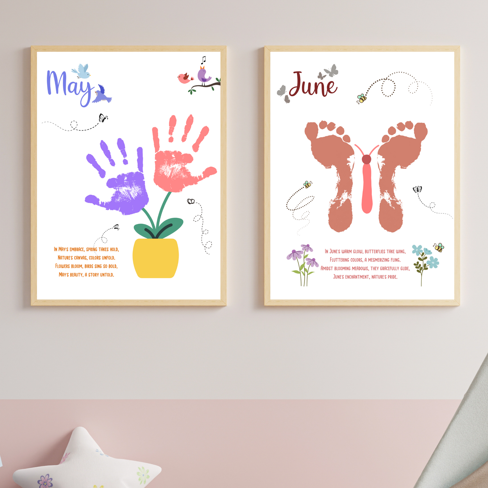 ✋🏽👣 Capture the fleeting moments of childhood with this delightful memory book of handprint & footprint art for kids! This unique and heartwarming keepsake can be used for babies, toddlers, preschool and kindergarten kids, celebrating their journey of growth — one for each cherished month of the year! They can also be framed and displayed in the home or office and also serve as great gifts for loved ones! Just download, print, apply non-toxic washable paint to the child's hand/foot, and start creating memories! ✋🏽👣