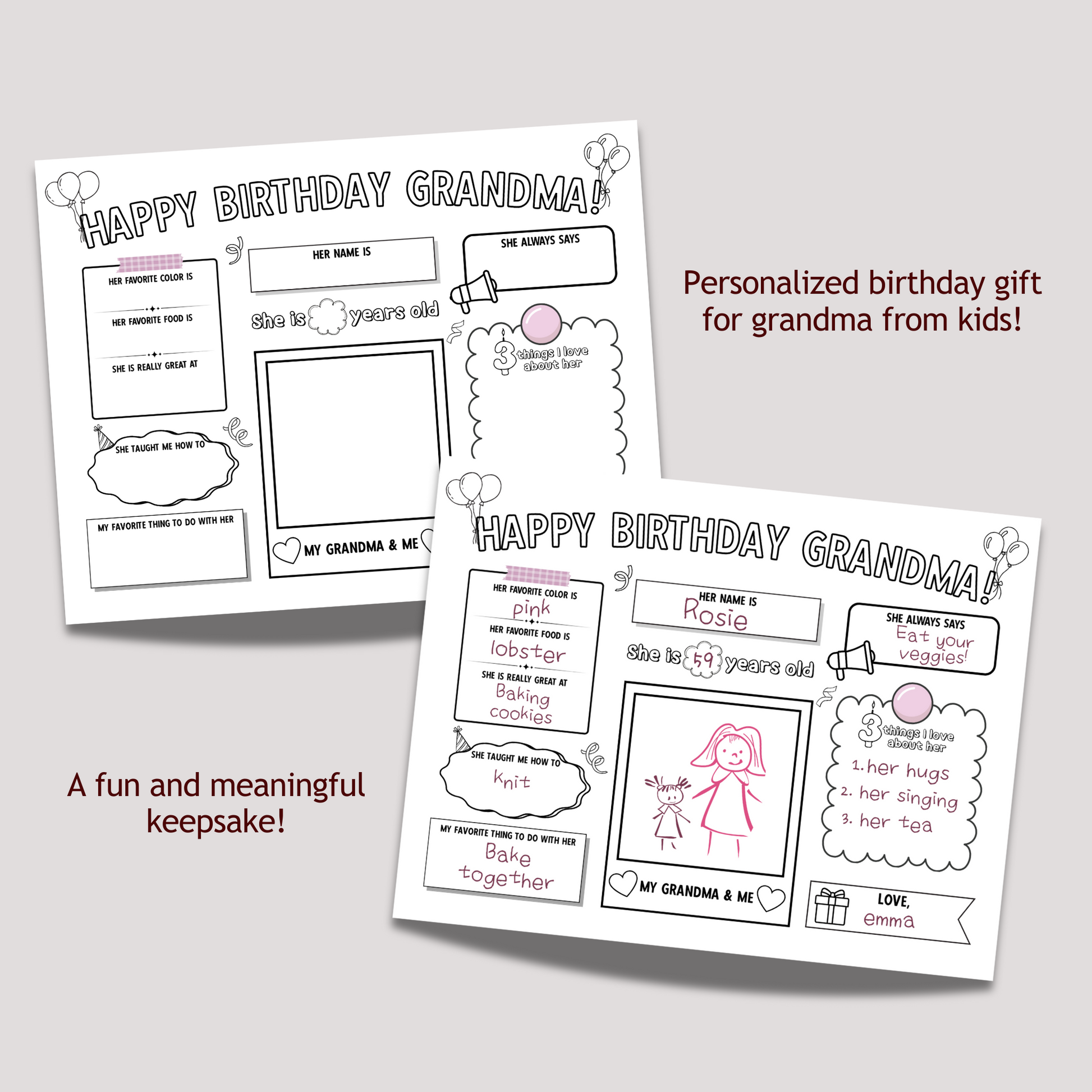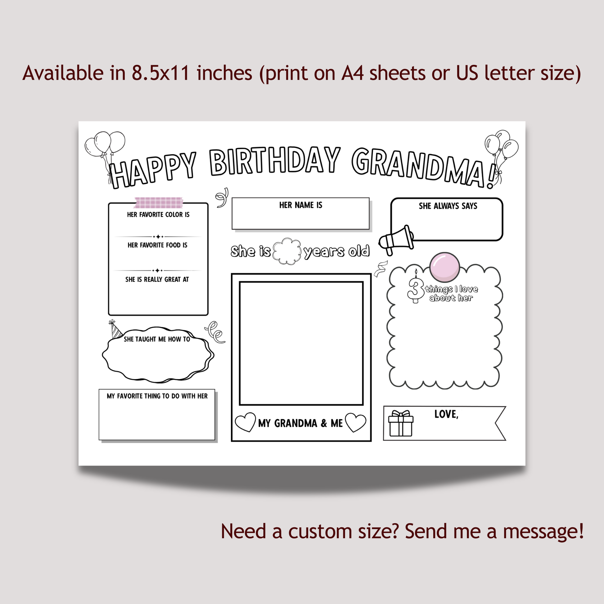 Happy Birthday Grandma! DIY Coloring Page & Activity Sheet Printable 🎉 Looking for a fun, budget-friendly, and heartfelt gift for Grandma? This Happy Birthday Grandma Questionnaire is a personalized keepsake where kids can color, fill in fun facts, and share sweet messages about their grandmother! It’s a perfect last-minute printable gift—just download, print, and let the creativity flow!