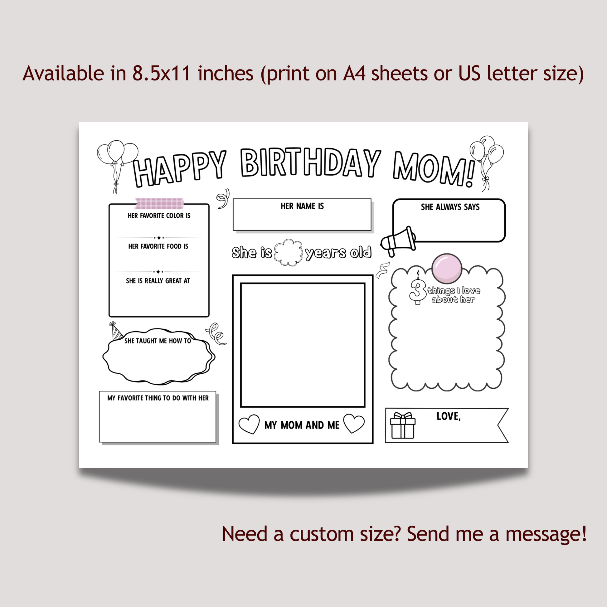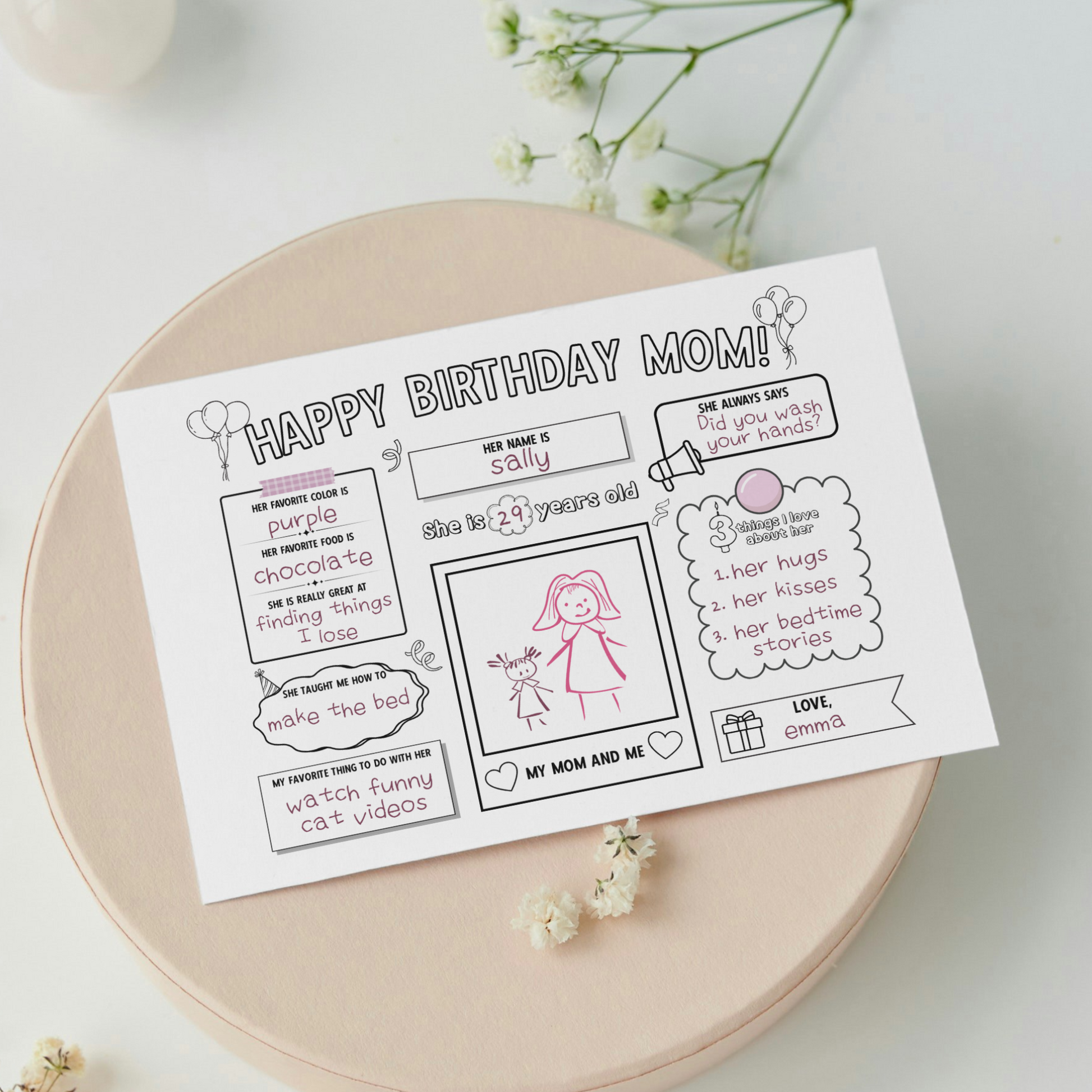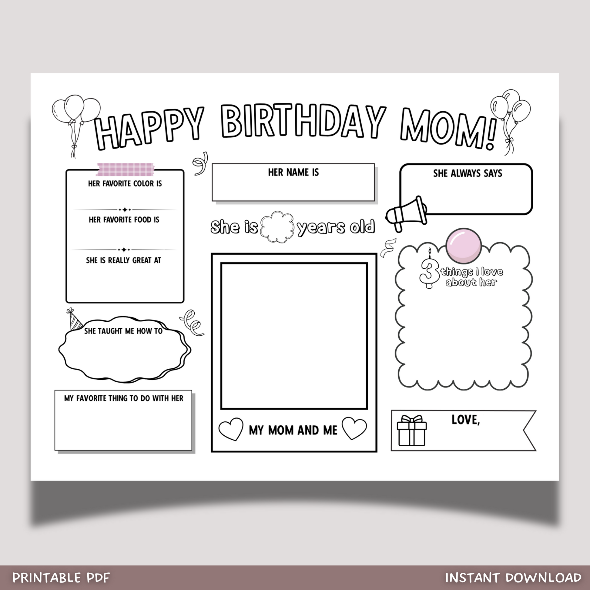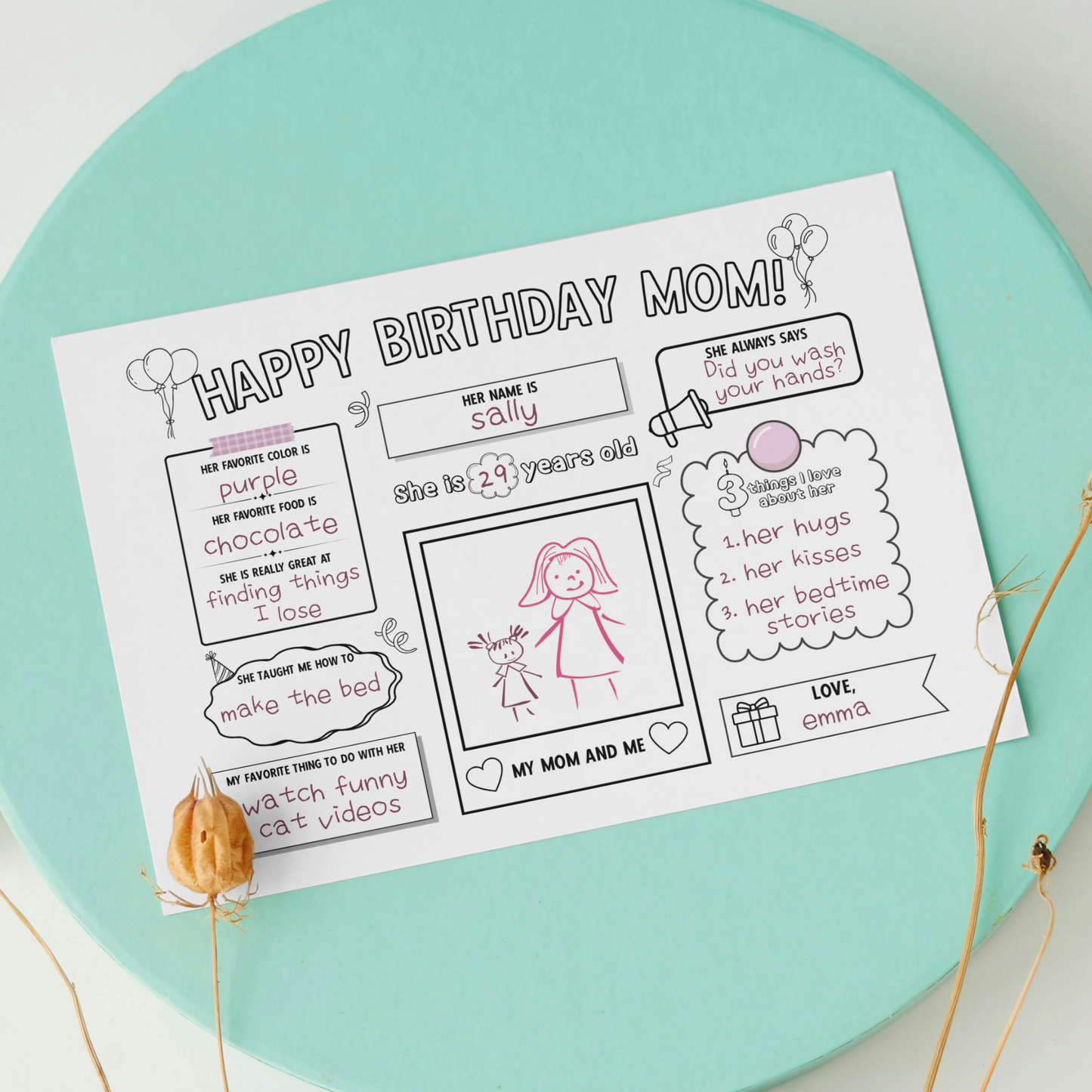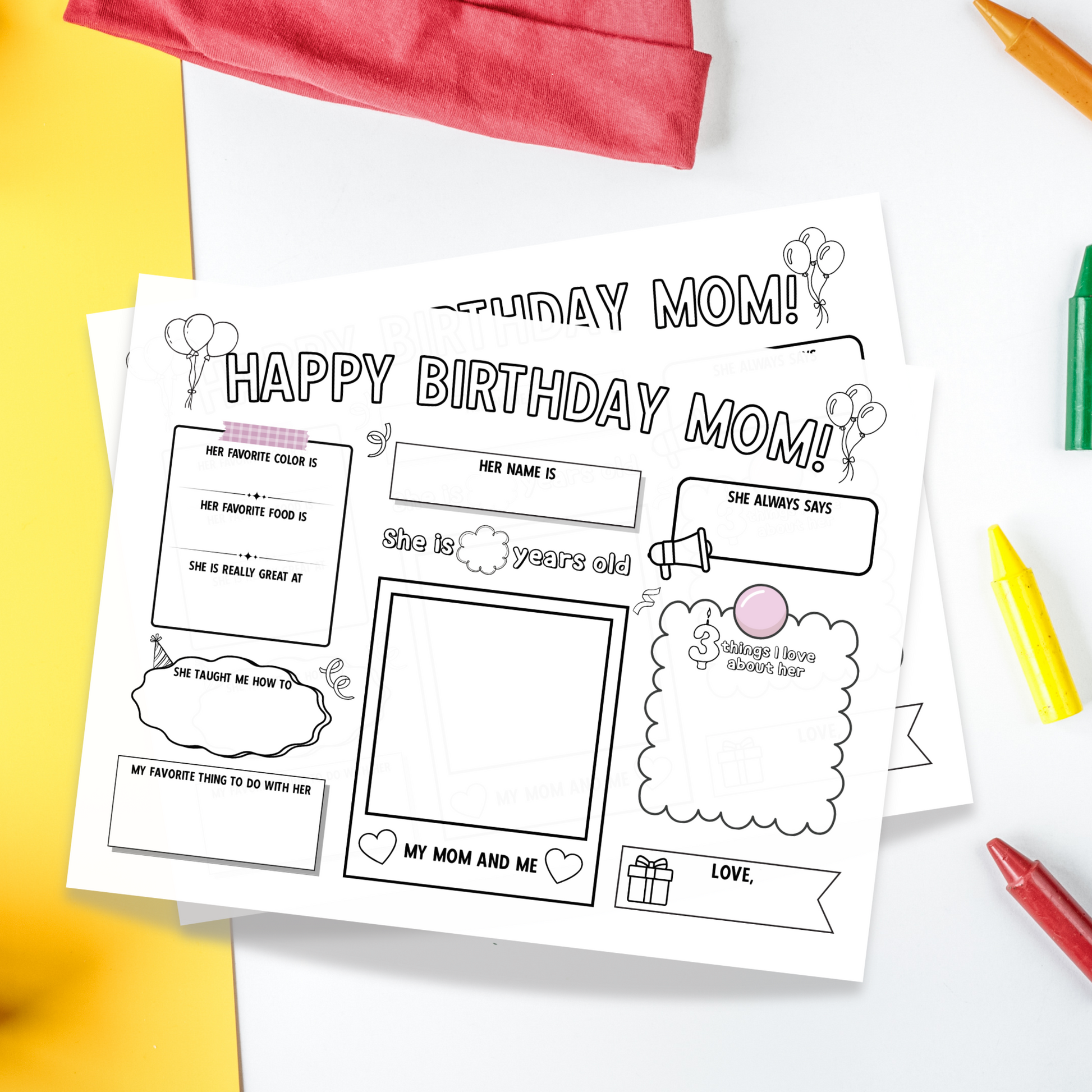 Happy Birthday Mom! DIY Coloring Page & Activity Sheet Printable 🎉 Looking for a fun, budget-friendly, and heartfelt gift for Mom? This All About Mom Coloring Fillable Questionnaire is the perfect last-minute printable gift from kids! No shipping needed—just download, print, and let your child’s creativity shine as they color and fill in the blanks with sweet and funny answers about their mom.