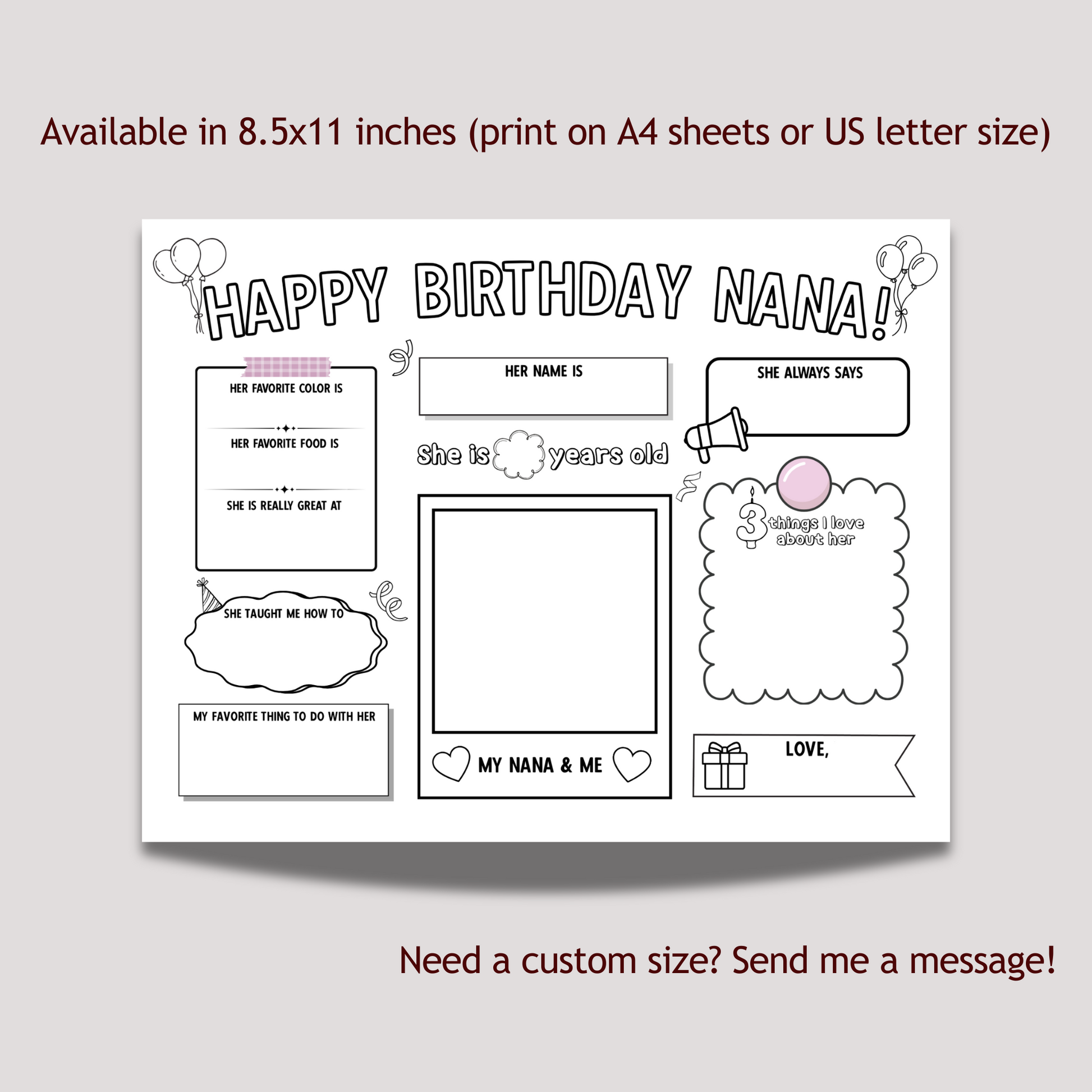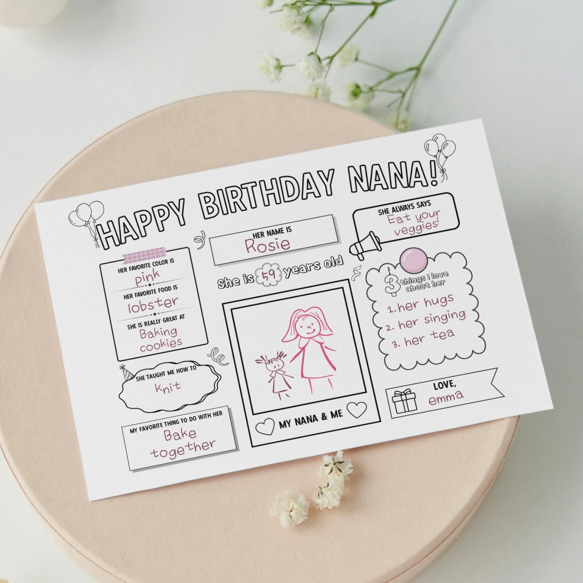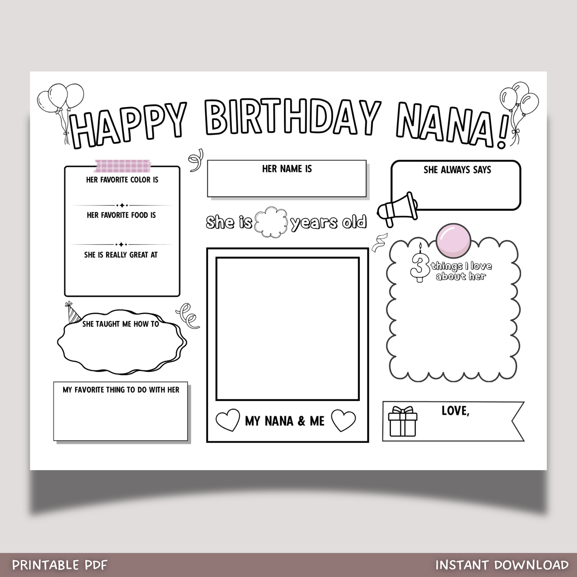 Happy Birthday Nana! DIY Coloring Page & Activity Sheet Printable 🎉 Looking for a fun, budget-friendly, and heartfelt gift for Grandma? This Happy Birthday Nana Questionnaire is a personalized keepsake where kids can color, fill in fun facts, and share sweet messages about their grandmother! It’s a perfect last-minute printable gift—just download, print, and let the creativity flow!