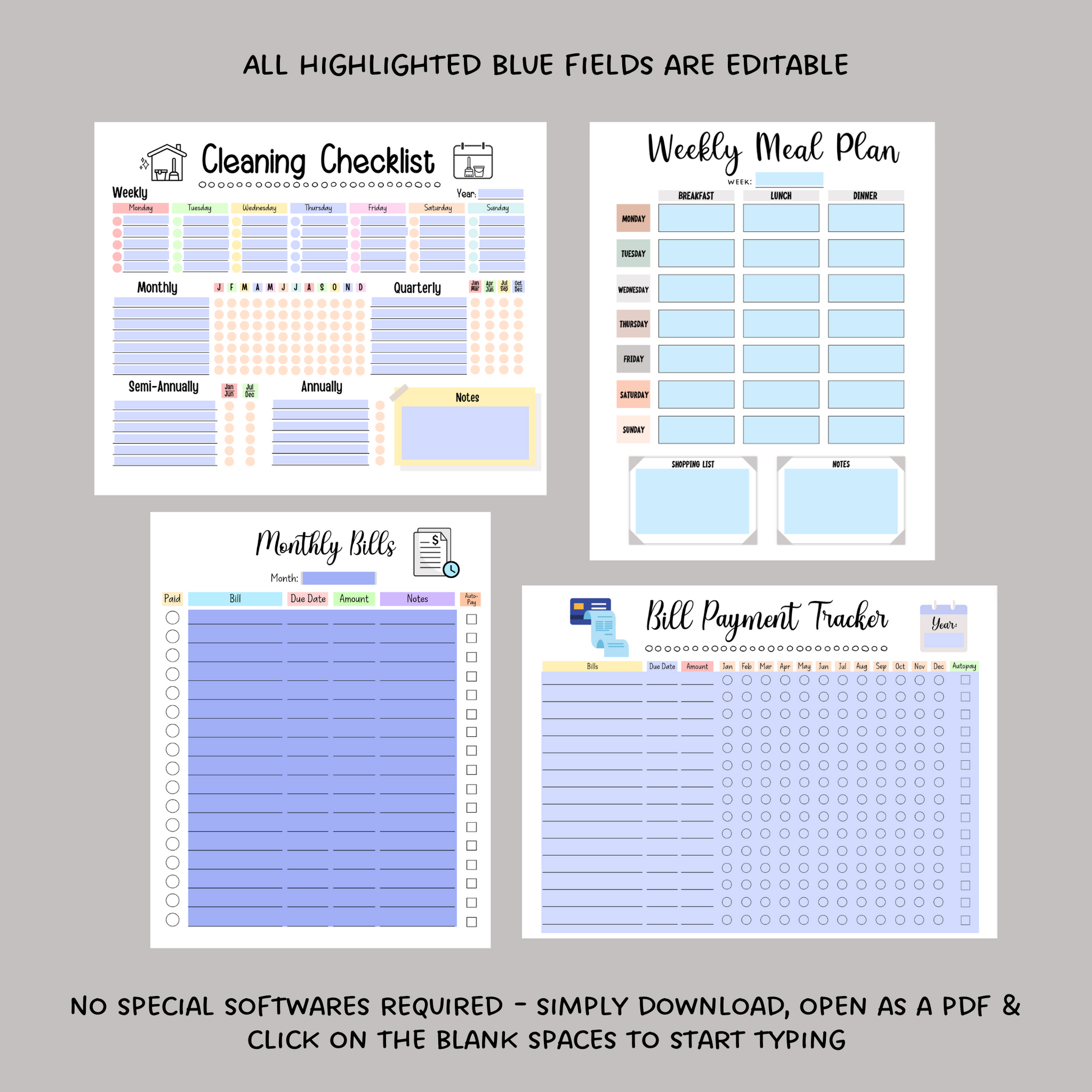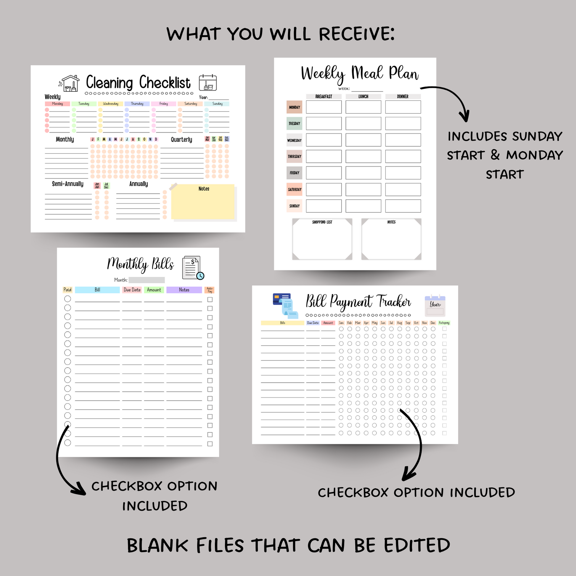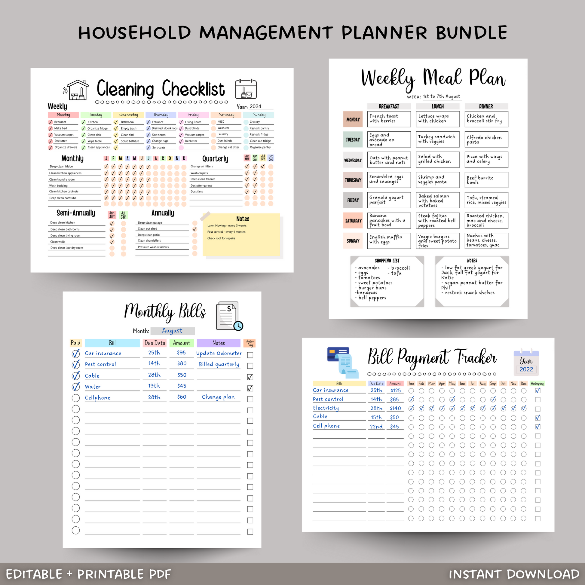 Household Planner Printable, Cleaning Checklist, Meal Planner, Bill Tracker