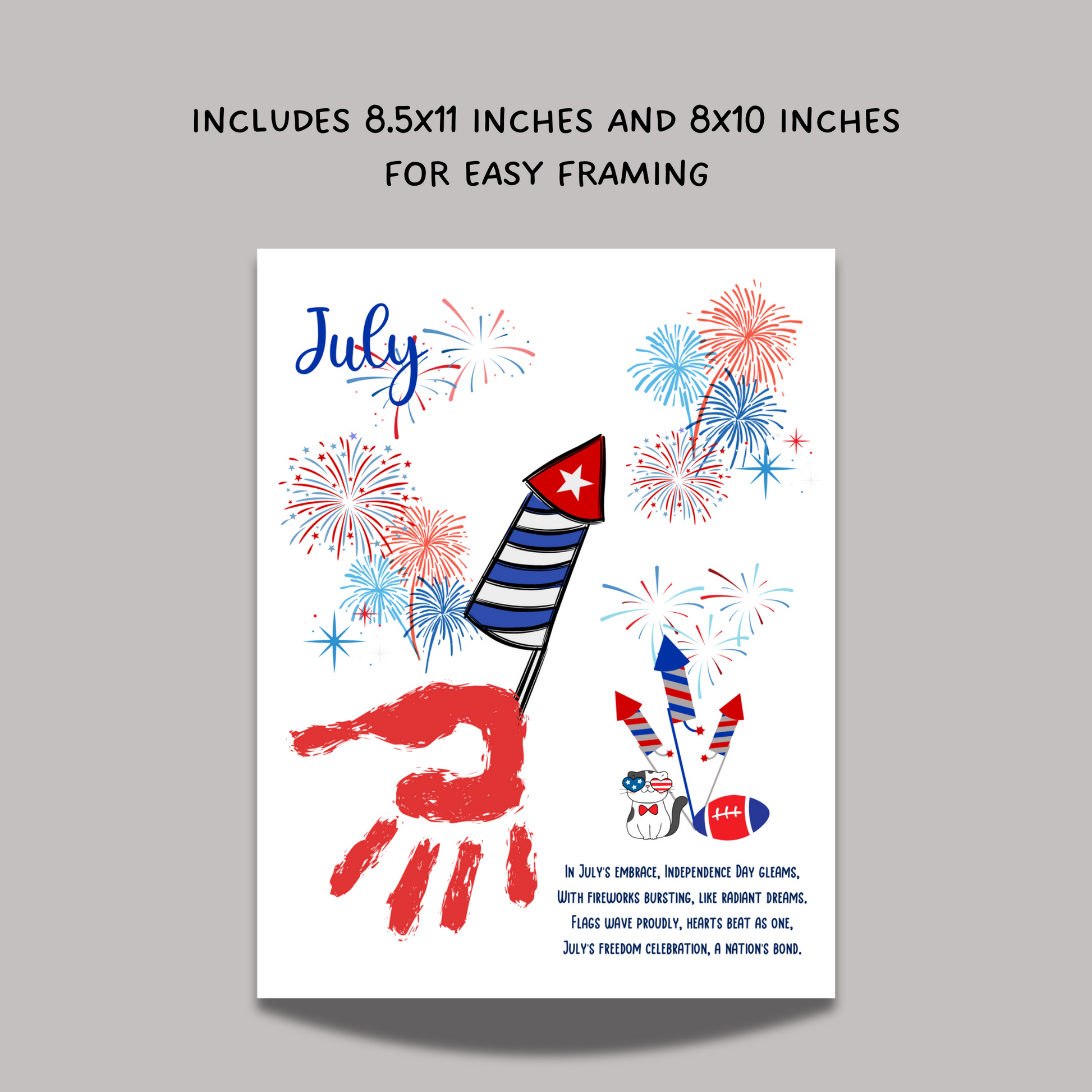 Celebrate your child’s growth and creativity with this adorable 4th of July handprint craft printable! Perfect for babies, toddlers, preschool, pre-k and kindergarten kids, this easy-to-use activity captures the magic of childhood while keeping little ones entertained. A wonderful keepsake to treasure forever, this craft is ideal for framing, gifting, or displaying at home or in the office. Just download, print, apply non-toxic washable paint to the child's hand/foot, and start creating memories! 💖