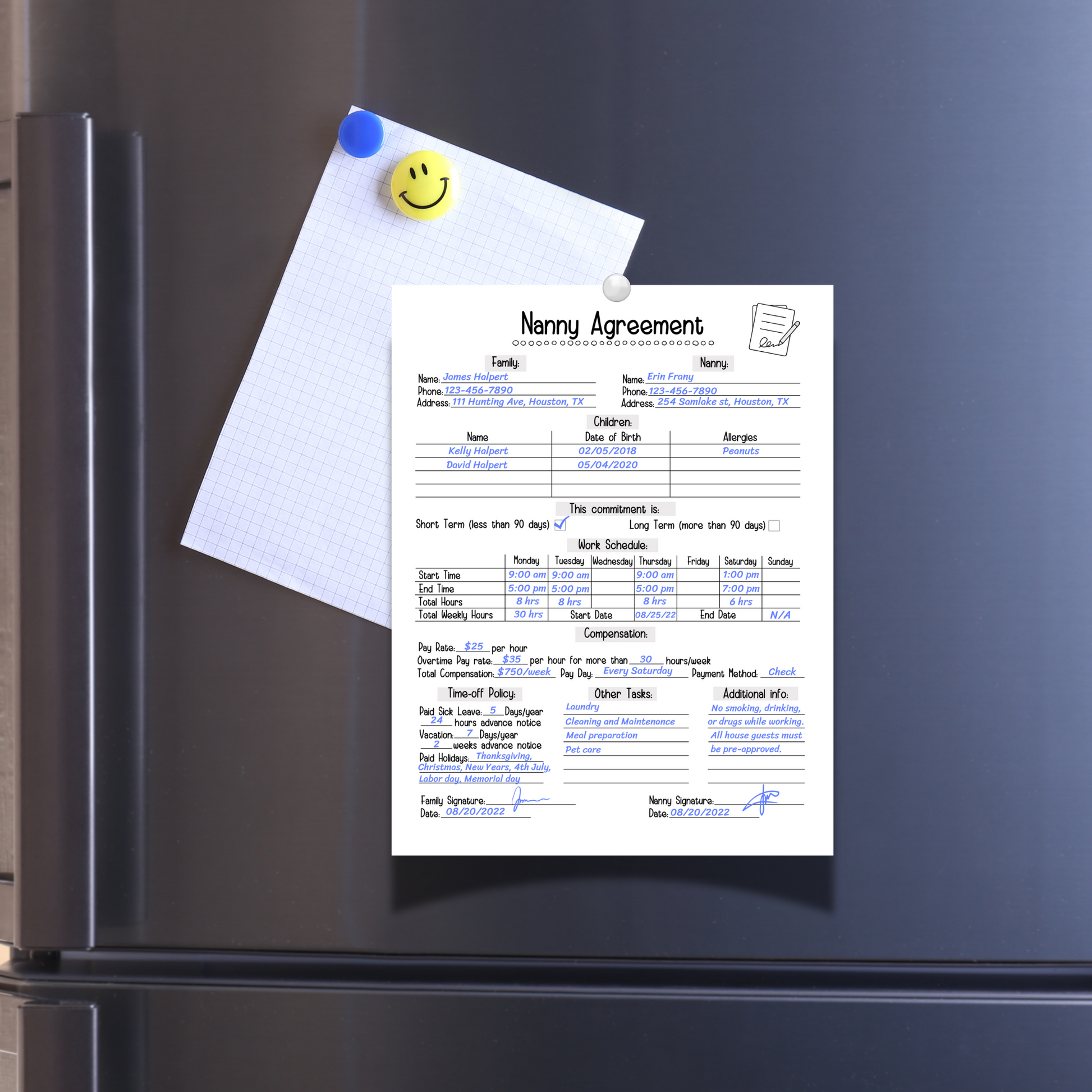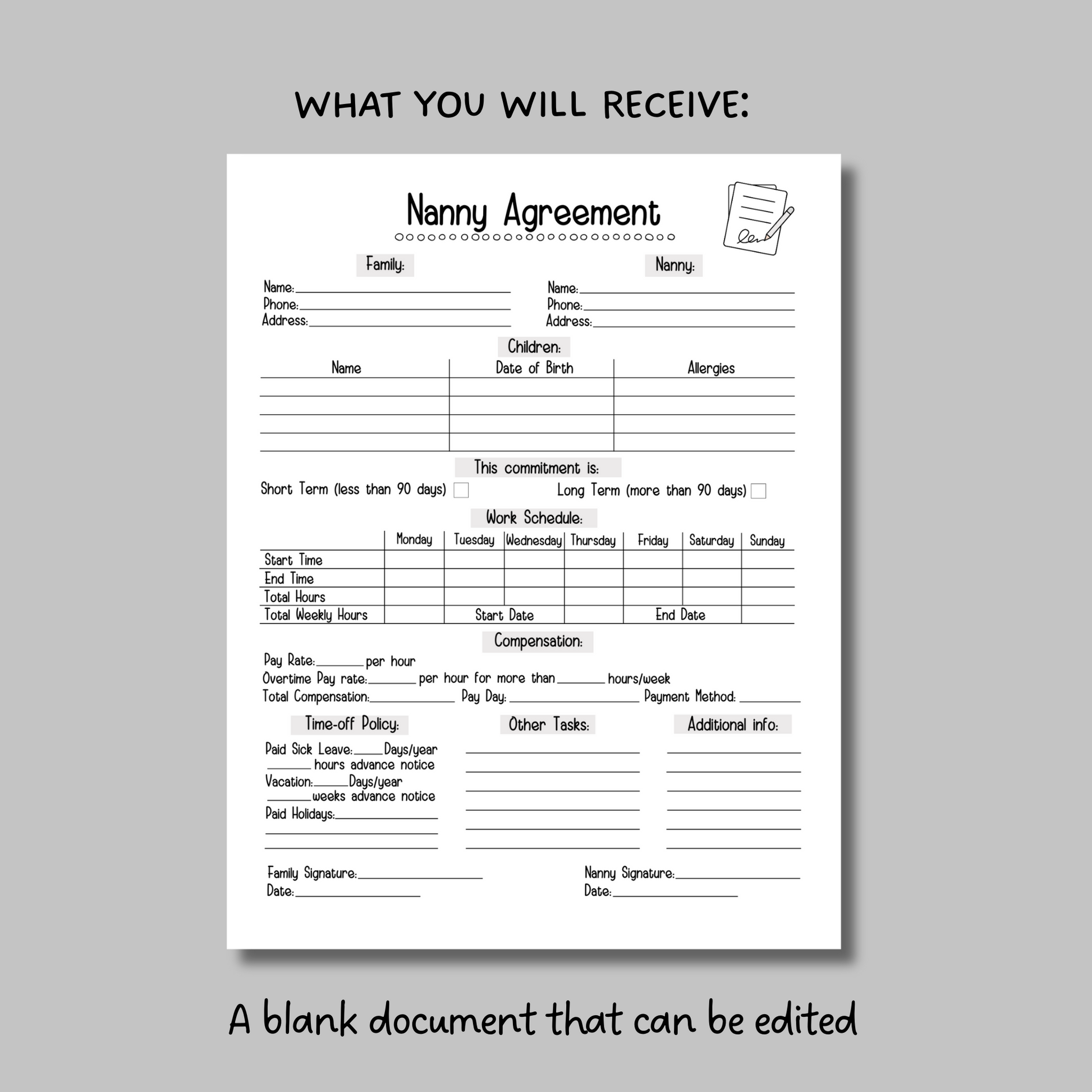 This editable and printable nanny agreement contract is an instant digital download! It is perfect for families hiring a nanny and includes every detail so everyone knows what to expect! You can fill it out by hand or on your computer!