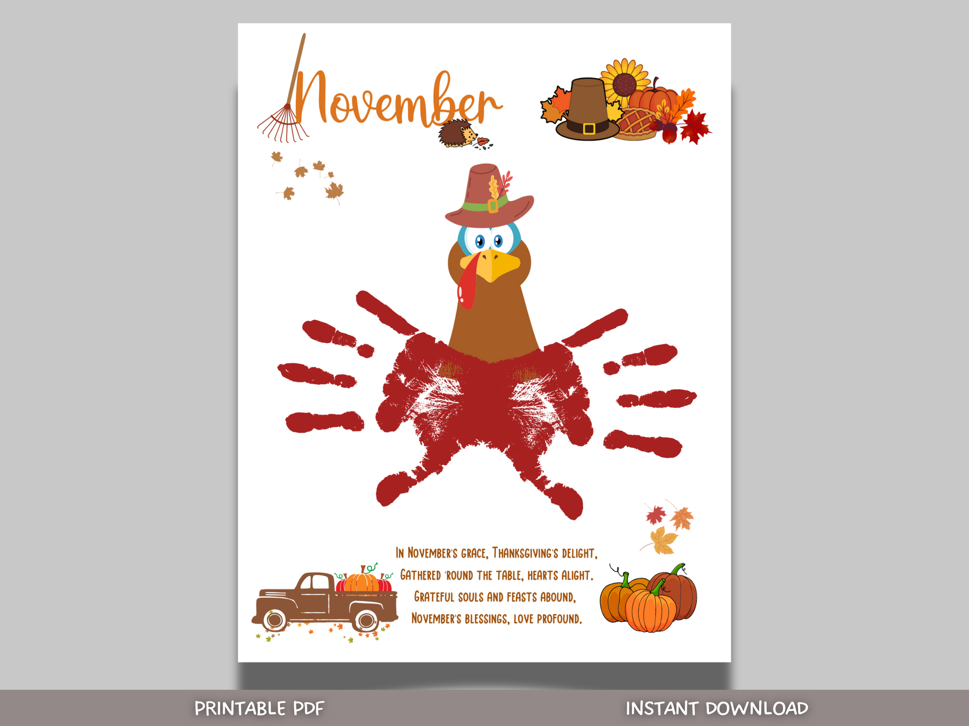 Celebrate your child’s growth and creativity with this adorable November handprint craft printable! Perfect for babies, toddlers, preschool, pre-k and kindergarten kids, this easy-to-use activity captures the magic of childhood while keeping little ones entertained. A wonderful keepsake to treasure forever, this craft is ideal for framing, gifting, or displaying at home or in the office. Just download, print, apply non-toxic washable paint to the child's hand/foot, and start creating memories! 💖