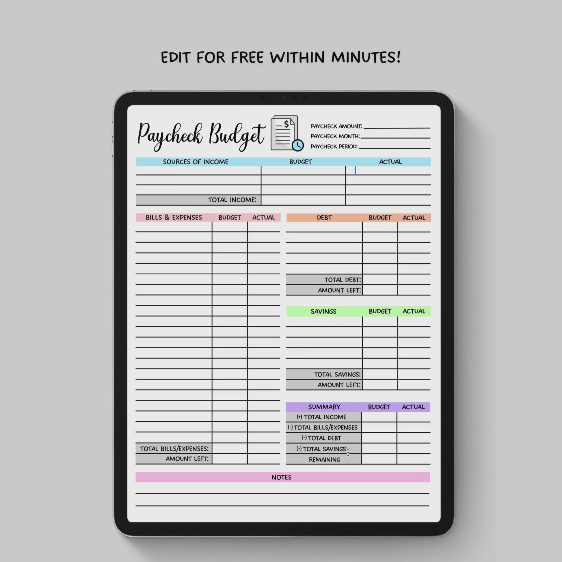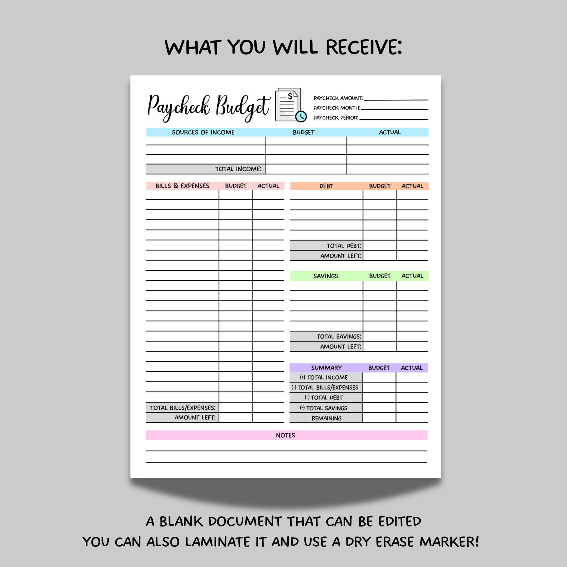 Organize your overall finances with this simple & minimalistic paycheck budget planner template. It is a fillable, printable PDF and an instant digital download! Edit for free within minutes, no additional softwares or apps required!