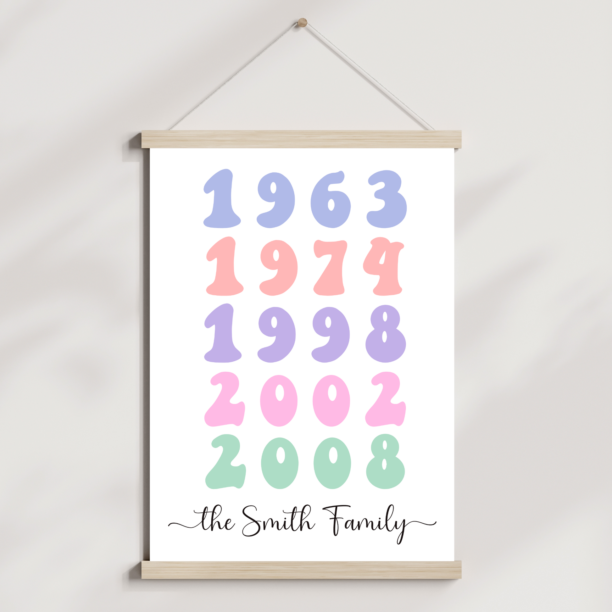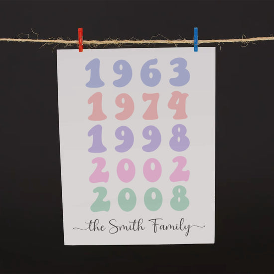 Celebrate your loved ones with this Custom Family Year Poster Printable. This personalized wall art highlights the birth years of your family members in a charming typography design, finished with your family name at the bottom for a meaningful touch. Created in cute color options to match your style, perfect for brightening up a kids room, nursery, playroom, living room, or office. 🌸