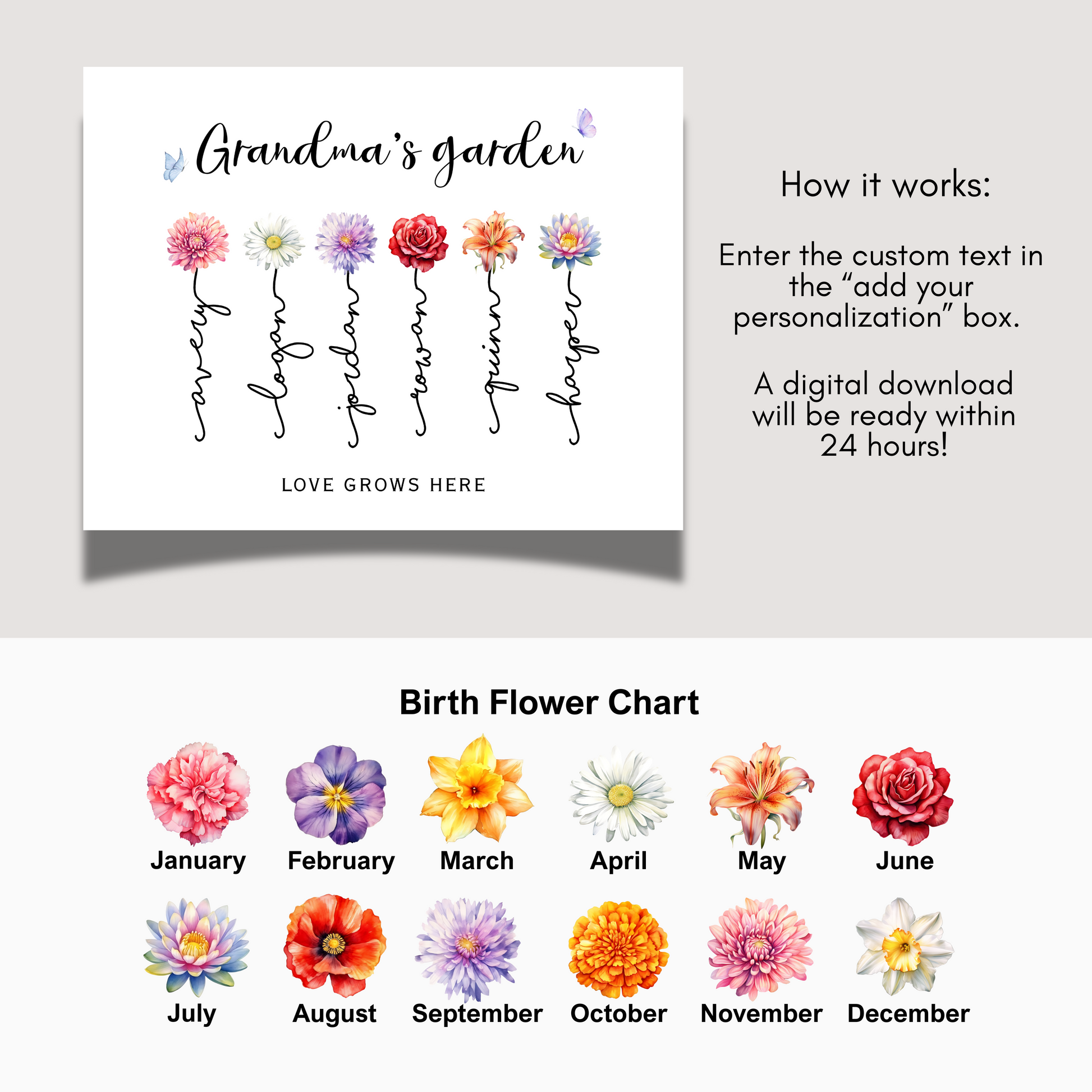 Personalized Grandma's Garden Printable, Custom Birth Month Flower Name Wall Art Gift
