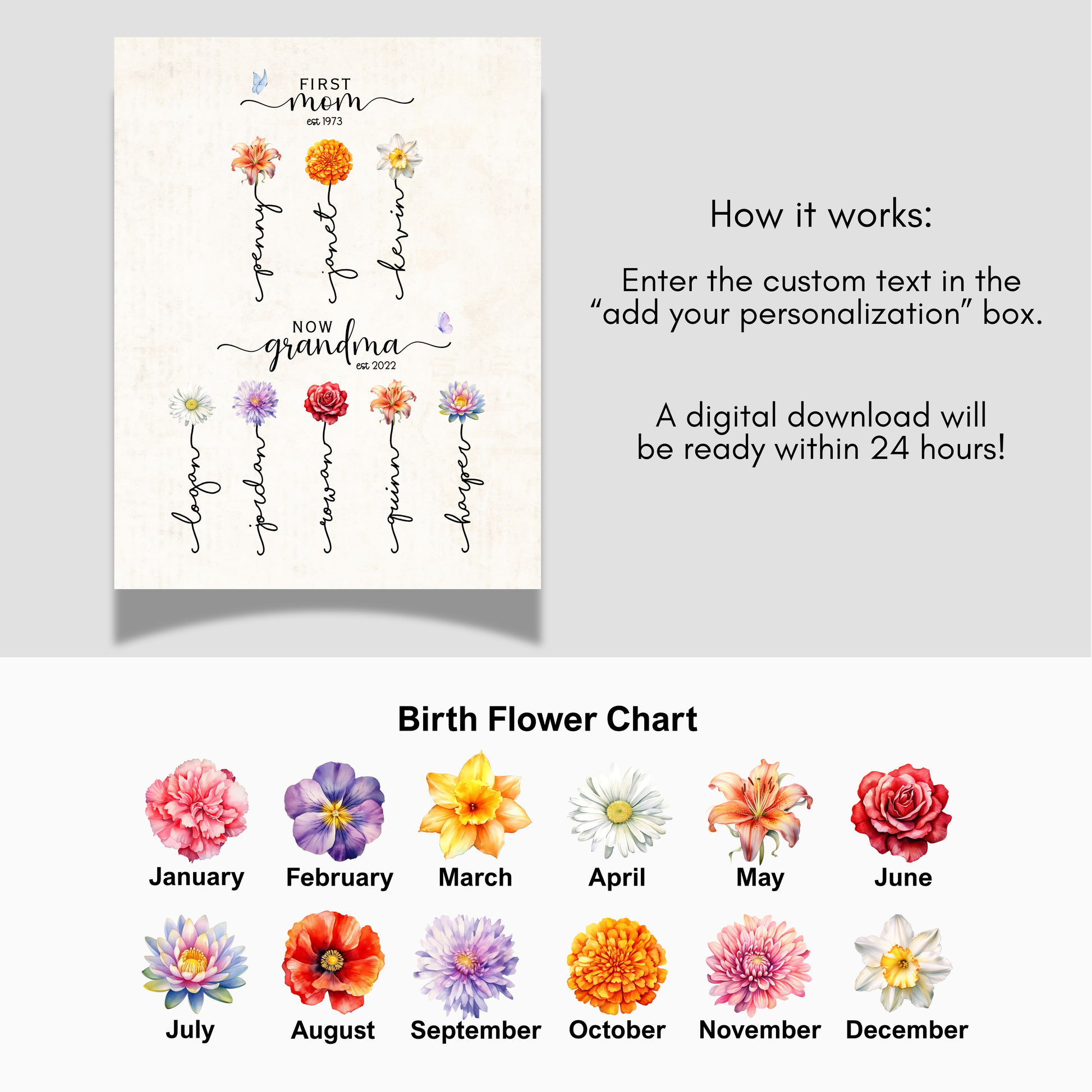 Custom “First Mom, Now Grandma” Birth Flower Printable, Personalized Gift for Grandma | Mother’s Day, Birthday, Christmas Keepsake 🌼