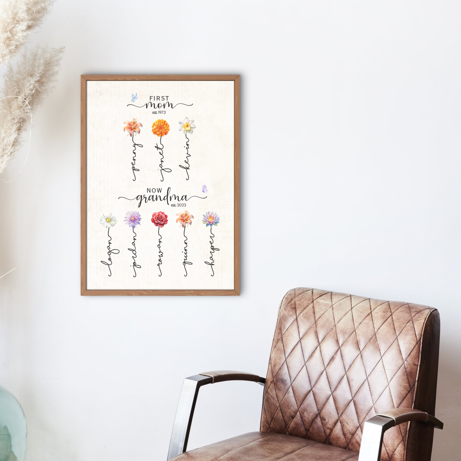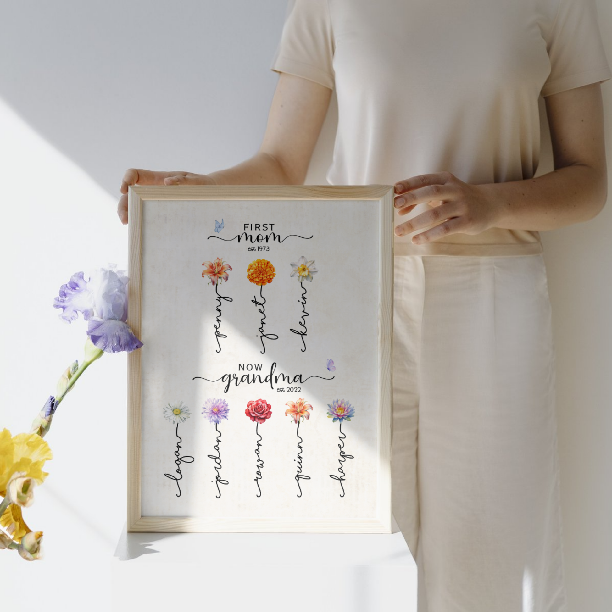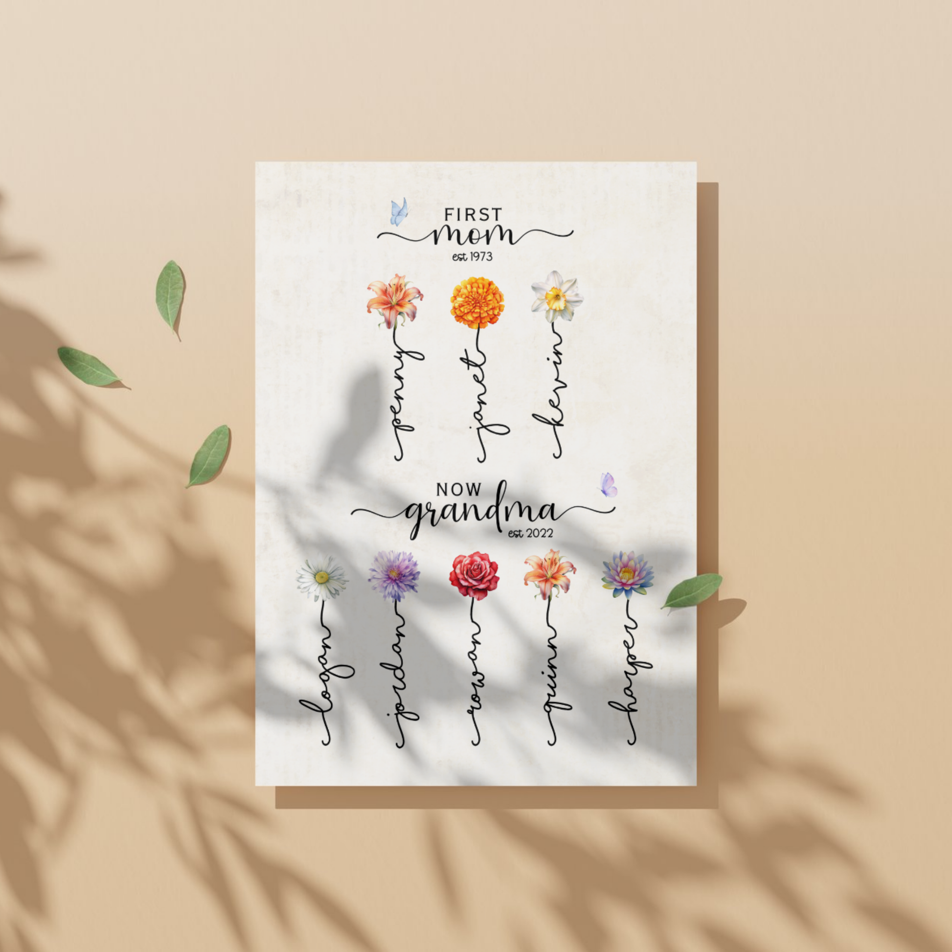 This elegant design begins with the phrase “First Mom” followed by the year she became a mother, displayed above her children’s birth month flowers, each with their name as the stem. Below that, it reads “Now Grandma” with the year she became a grandmother, alongside each grandchild’s flower and name — a blooming tribute to her legacy and love.