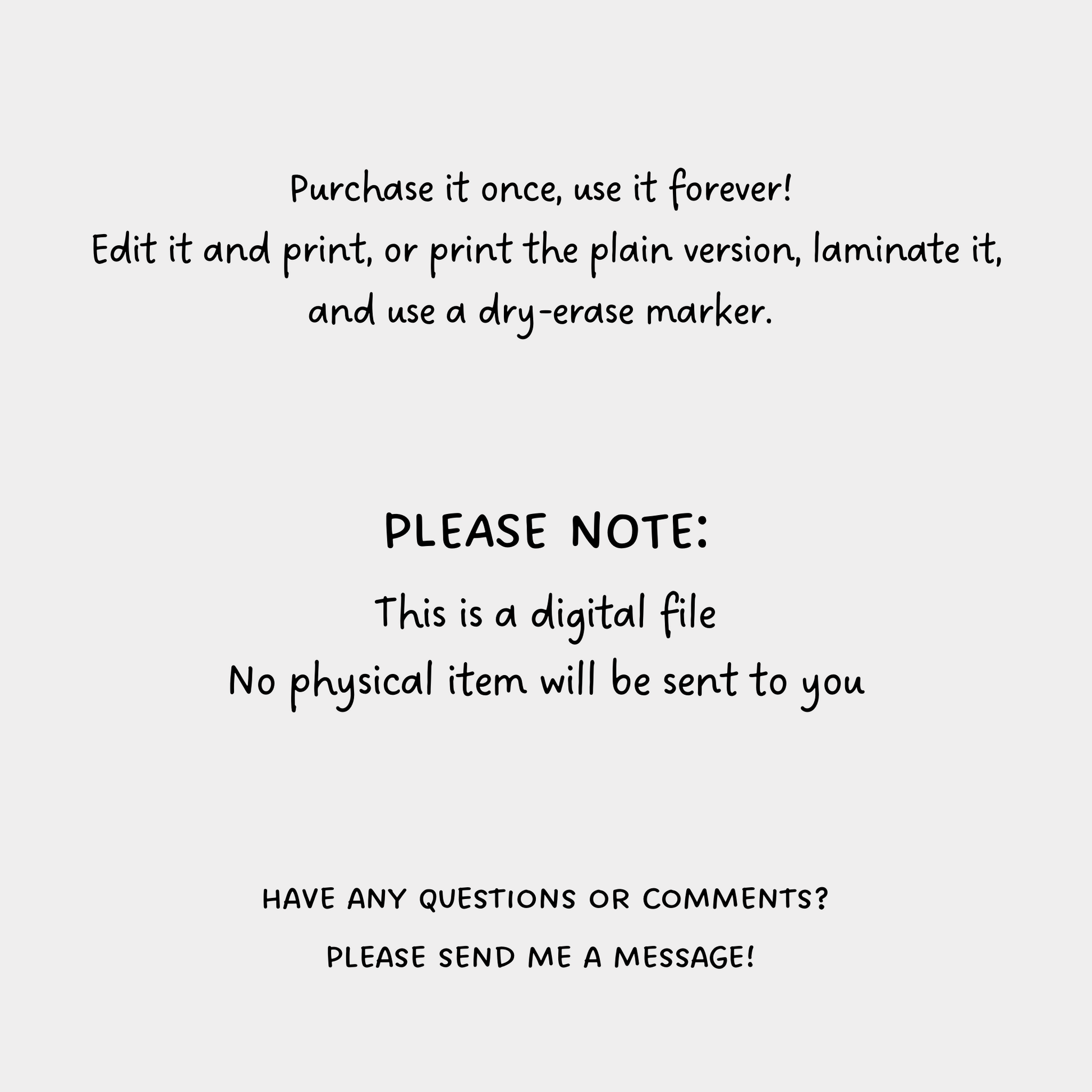 - A blank, high resolution PDF that can be edited. You can print as many copies as you like!