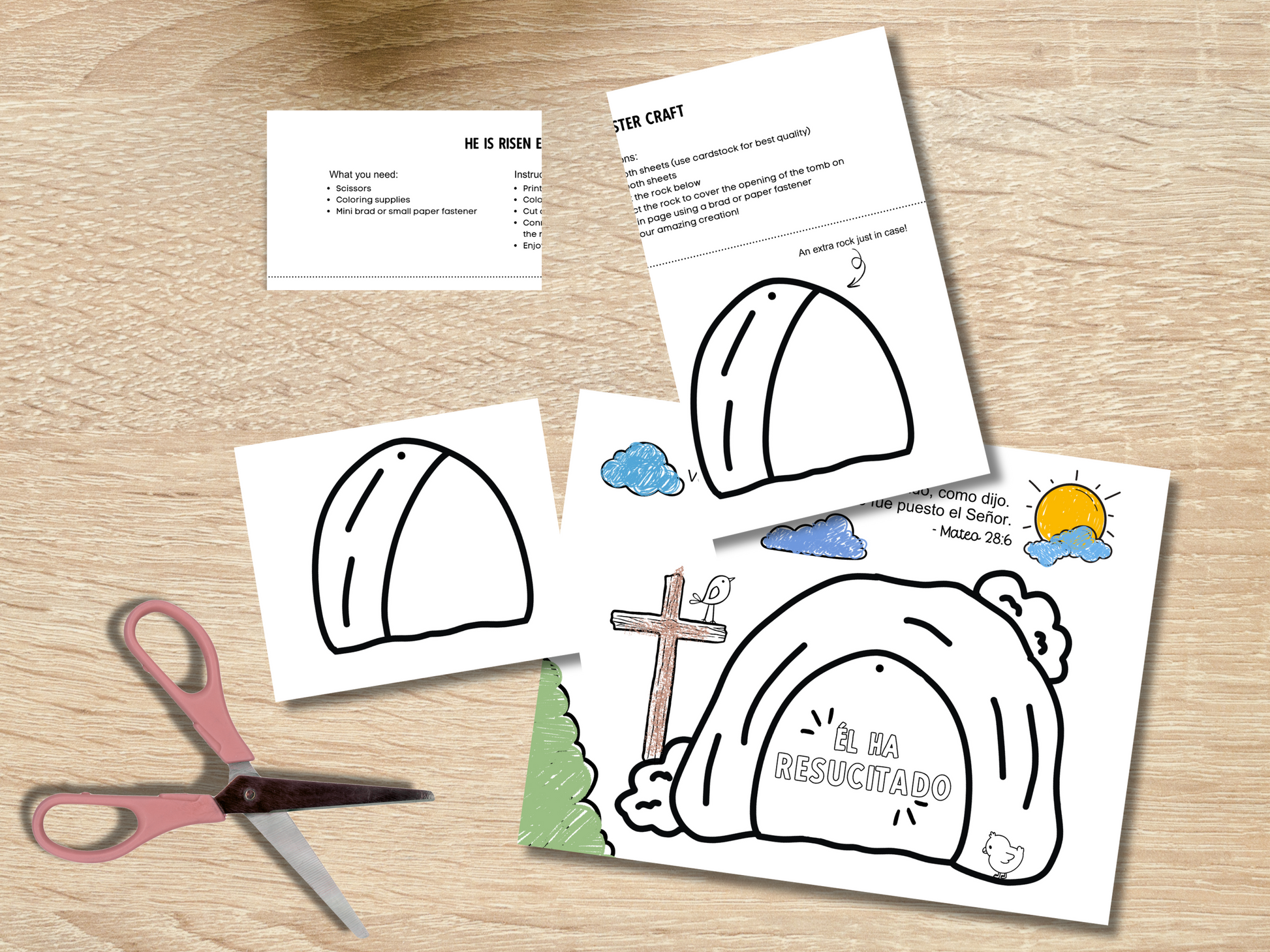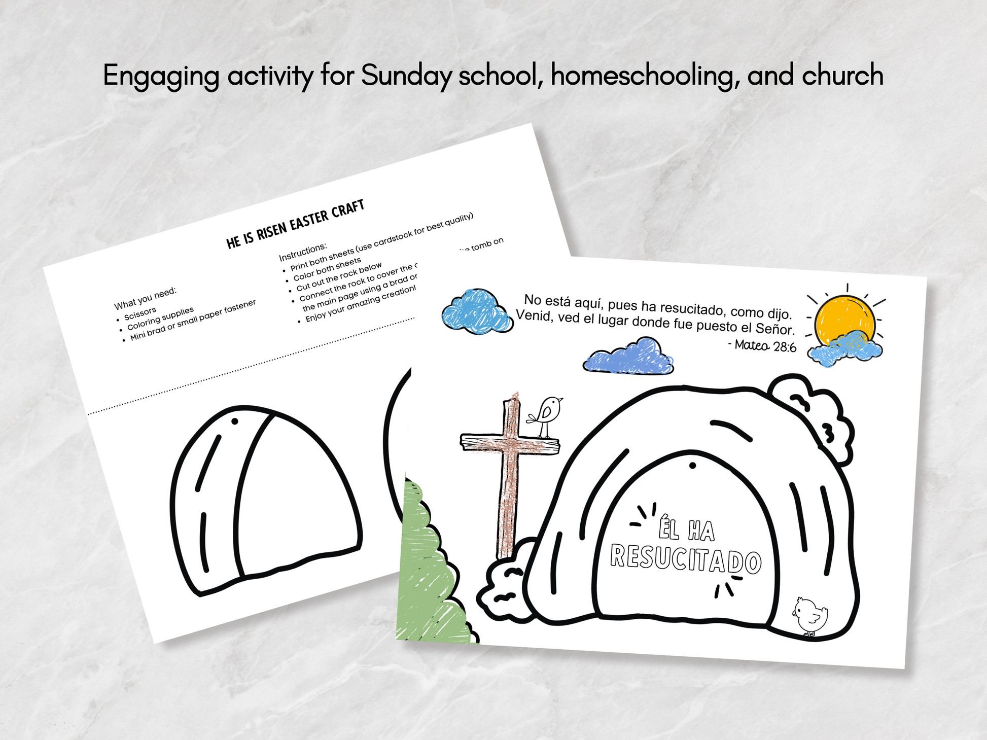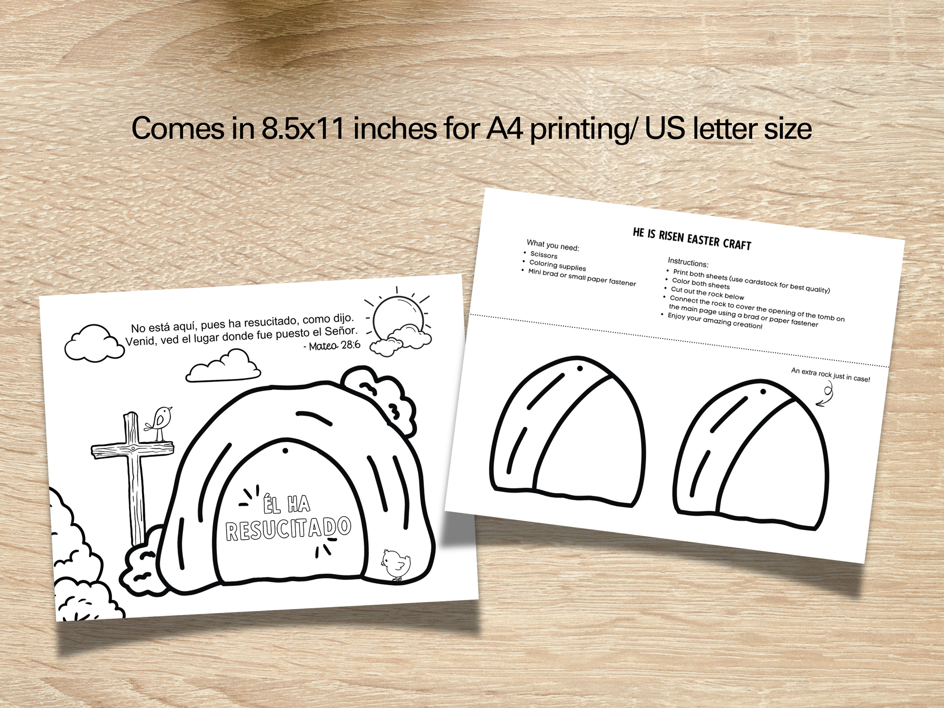 He is Risen! Empty Tomb Easter Coloring Craft Printable in Spanish ✝️ Celebrate Jesus’ Resurrection with this fun and interactive Easter craft! This Christian printable helps kids visualize the story of the empty tomb while reinforcing the powerful message of Matthew 28:6: “He is not here; He has risen, just as He said. Come and see the place where He lay.”