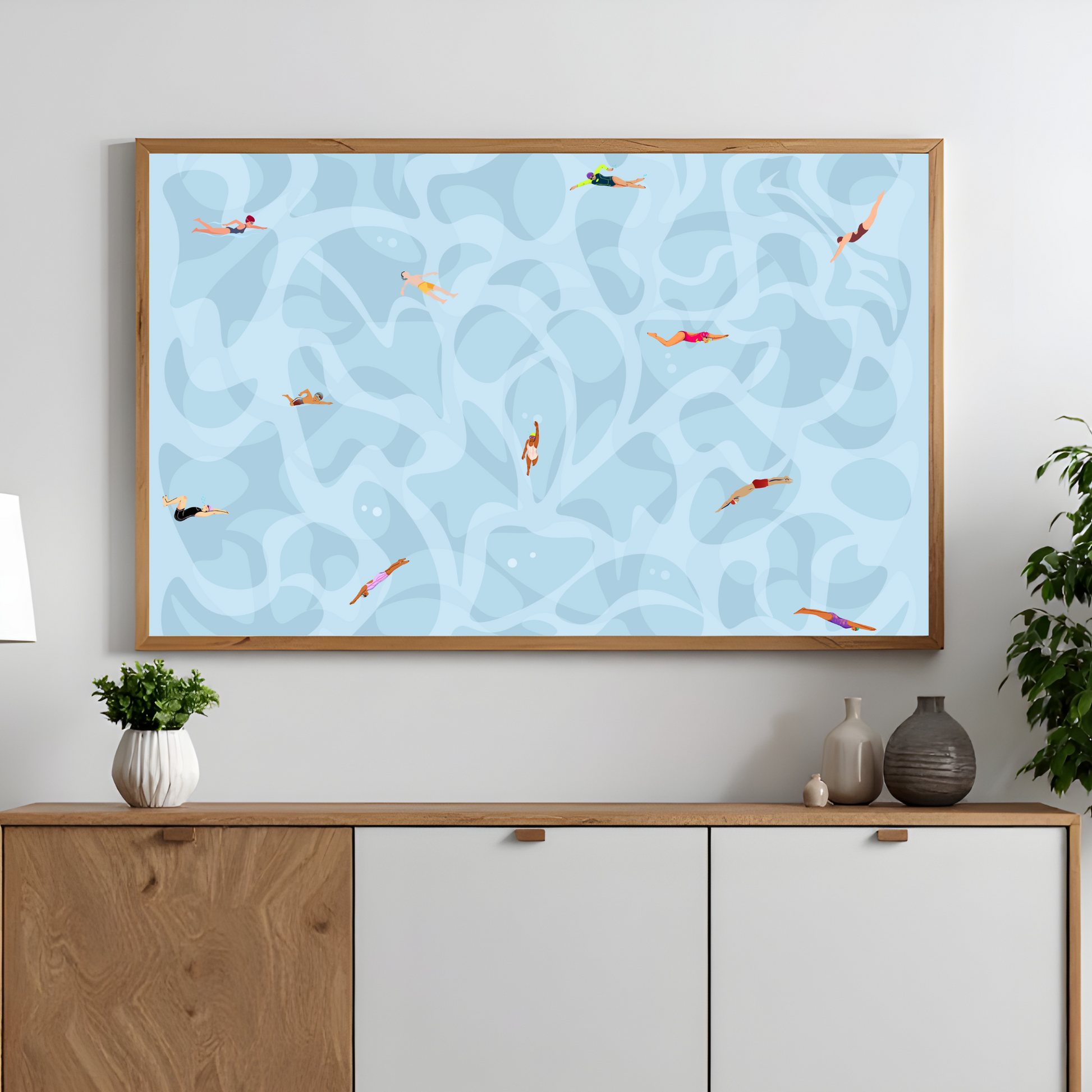 Celebrate the beauty of movement with this Tiny People Swimming Print. Featuring minimalist watercolor figures in a serene pool scene, this abstract wall art brings a refreshing blend of sport and style to your decor. Perfect for displaying in a home, office, pool house, gym, or study, it also makes a thoughtful gift for a swimmer, coach, lifeguard, dad, mom, friend, or water lover. 🏊