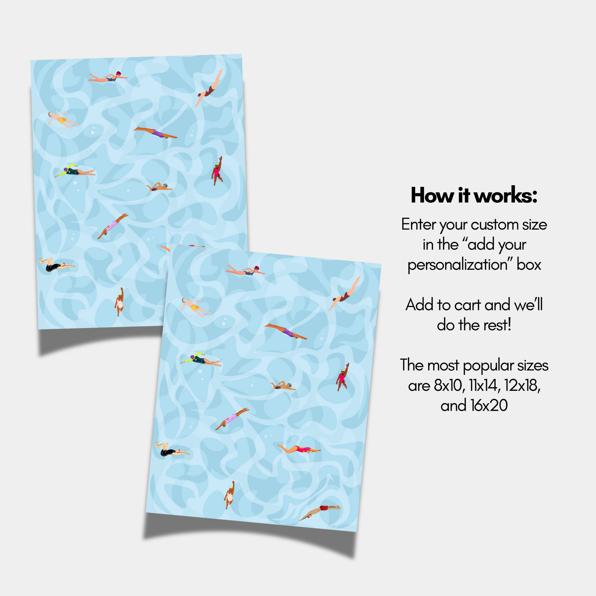 Refresh your walls with this Tiny People Swimming Print, a minimalist watercolor pool scene that brings movement, serenity, and charm to any space. Perfect for swimmers, athletes, or lovers of modern abstract art, this digital print can be created in any size of your choice, making it a versatile addition to your home, office, or poolside decor.