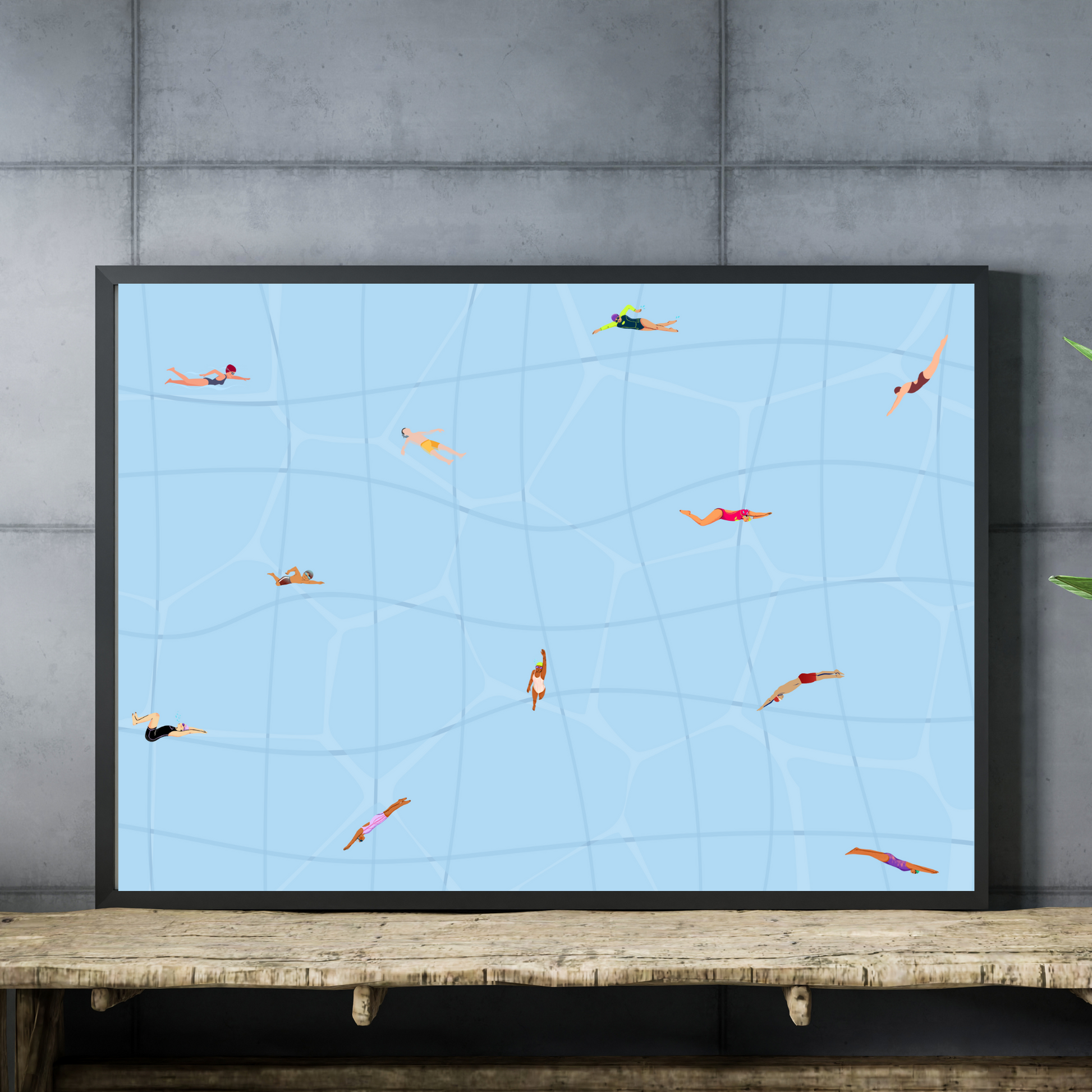 Celebrate the beauty of movement with this Tiny People Swimming Print. Featuring minimalist figures in a serene pool scene, this abstract wall art brings a refreshing blend of sport and style to your decor. Perfect for displaying in a home, office, pool house, gym, or study, it also makes a thoughtful gift for a swimmer, coach, lifeguard, dad, mom, friend, or water lover. 🏊