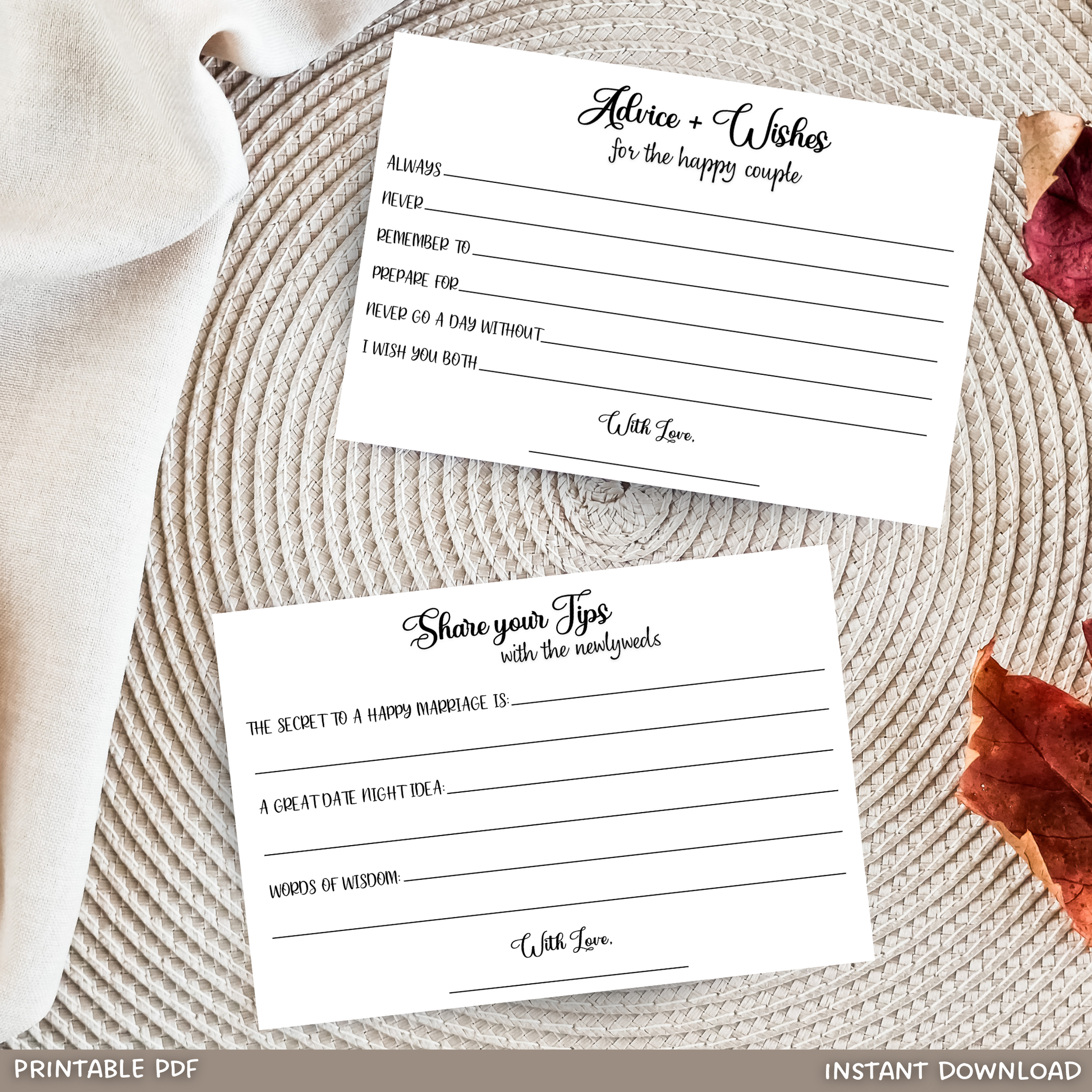 đź’– These minimalistic Bride & Groom Wedding Advice and Couple Well Wishes Cards + Share Your Tips With the Newlywed Cards are printable PDF files and an instant digital download! They are perfect keepsakes from friends and family attending the wedding, bridal shower, hen party, or bachelorette party, allowing them to share their wisdom, blessings, and words of encouragement with the new couple. Just download, print, & use to have a memorable and fun-filled event! đź’–