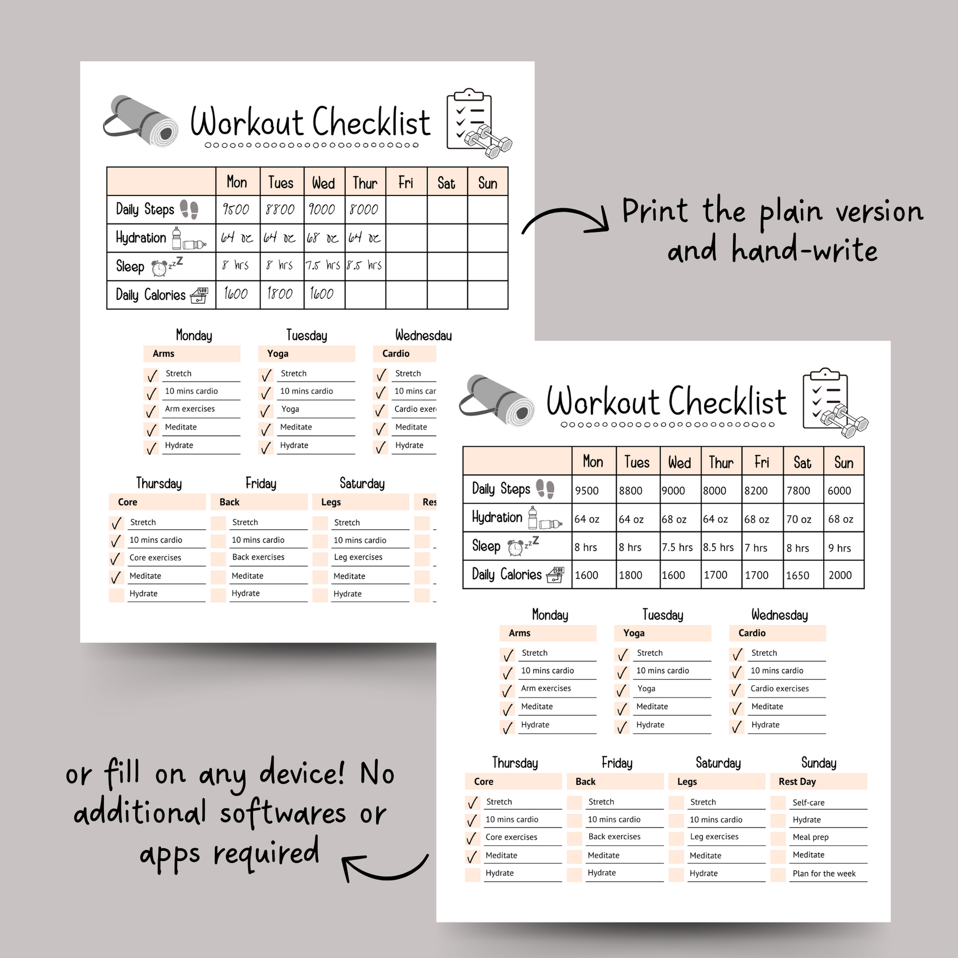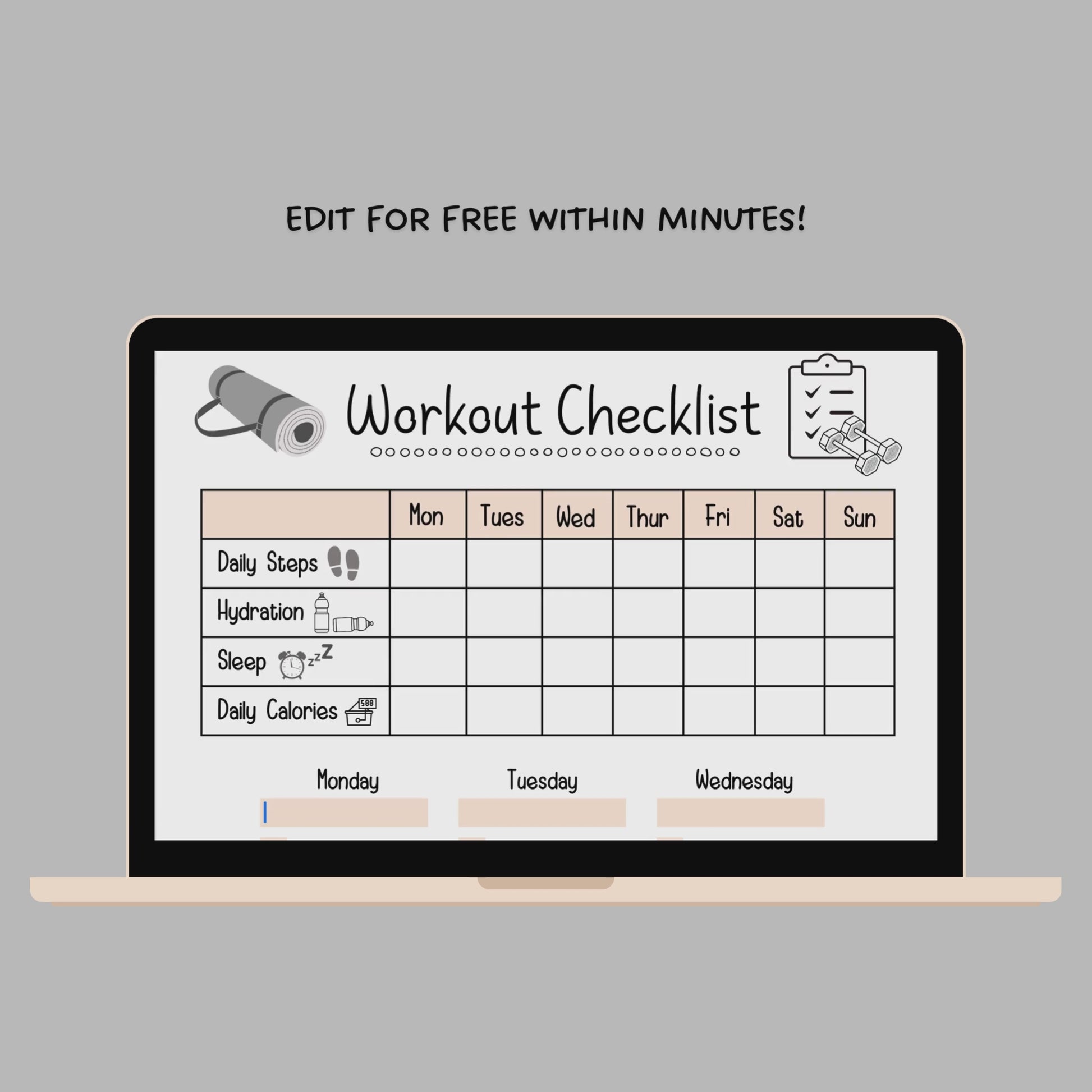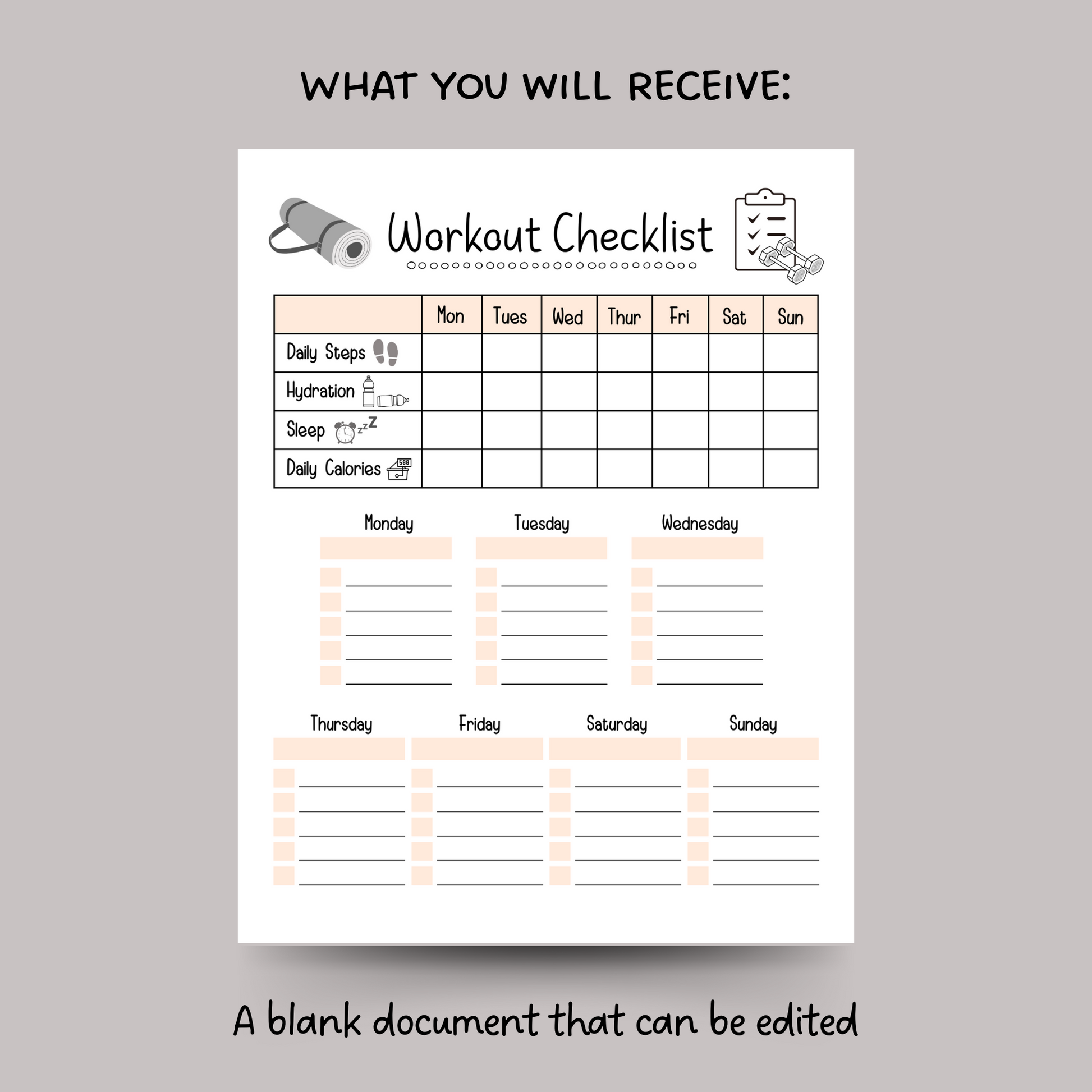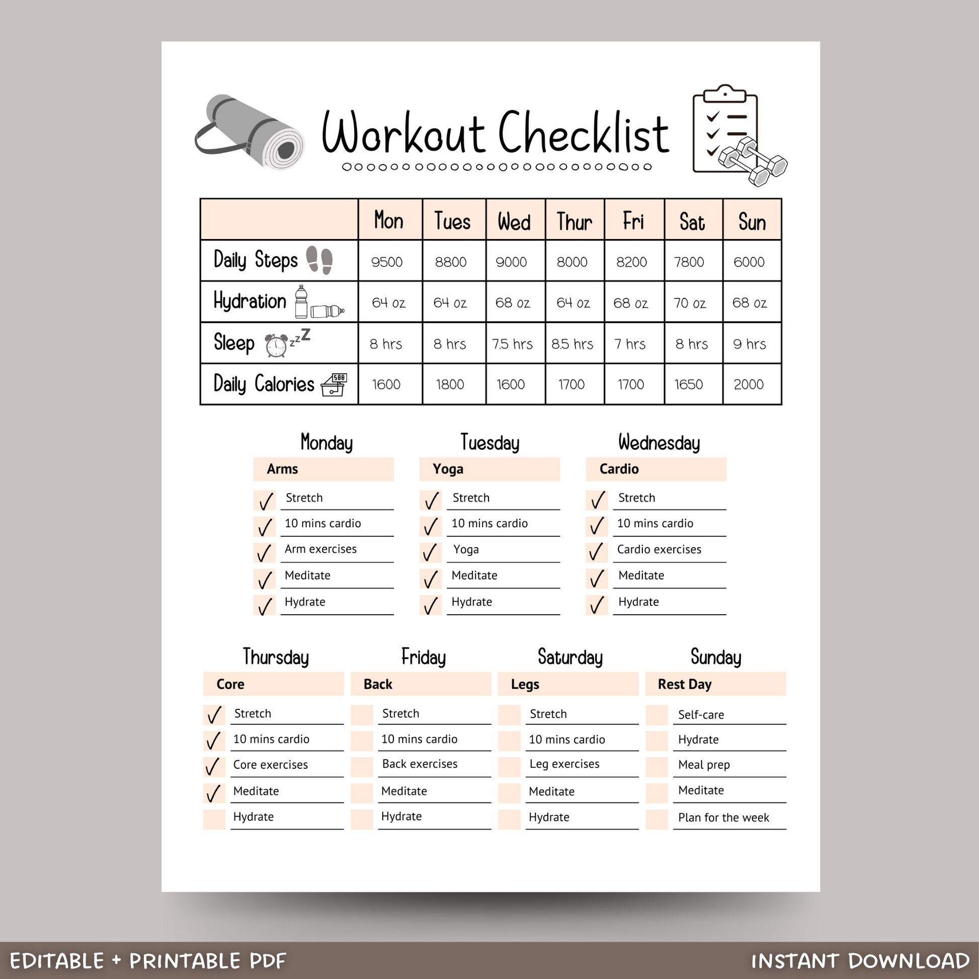 Editable Workout Checklist, Printable Daily Exercise Gym Log Planner
